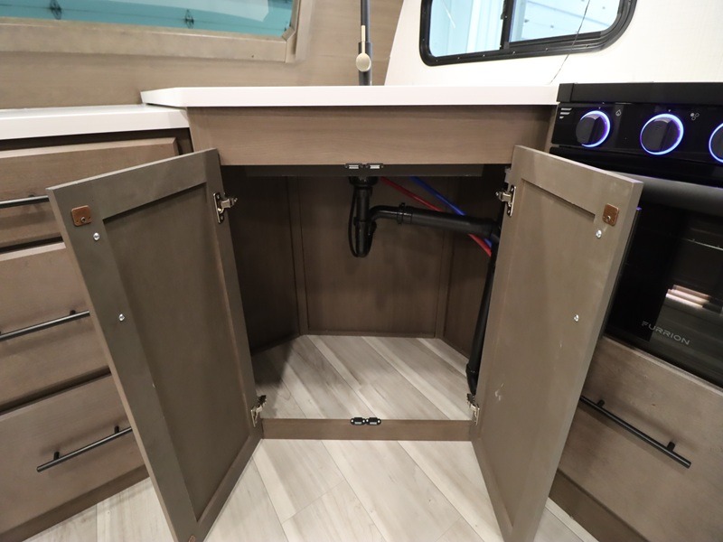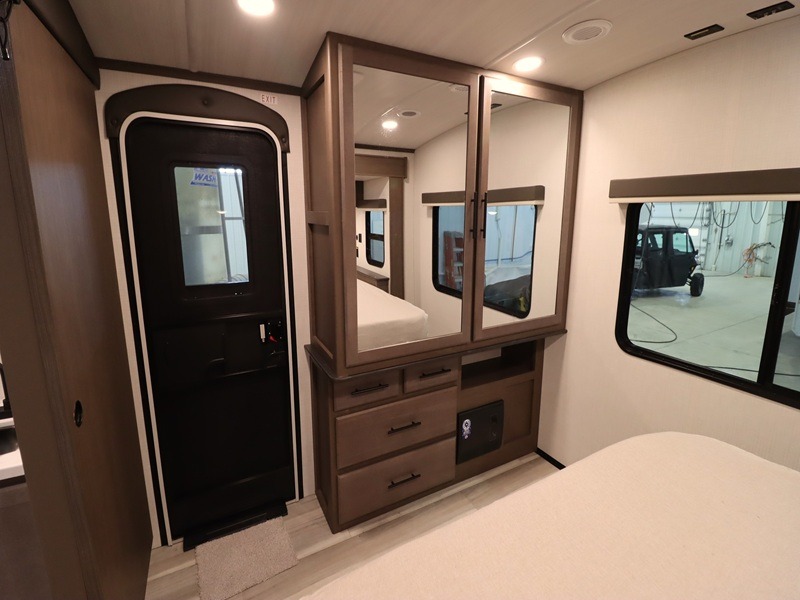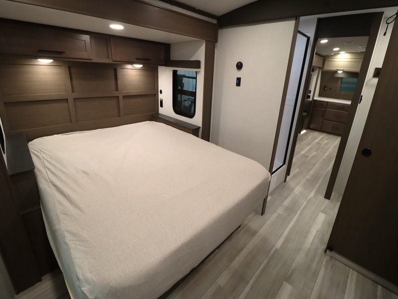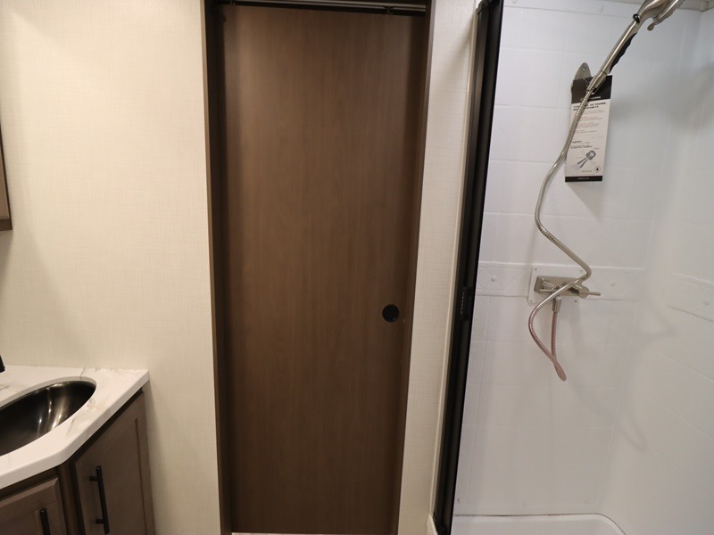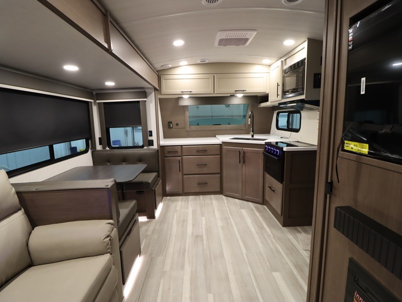 With a queen-size bed and a king bed option, this Cougar Half-Ton travel trailer shows that you can still be comfortable even while you're away from home! The bed slides out to provide more interior space and there is a wardrobe opposite near the private entry door. The main entry up front leads into a spacious combined kitchen and living area with the front kitchen offering plenty of counter space and overhead storage. There is a 12-volt refrigerator to the left of the entry door, and access to a walk-in pantry is right around the corner from the pivoting entertainment center opposite a tri-fold sofa sleeper and booth dinette slide. This unit also features a full-width walk-thru bath giving you plenty of room to shower and change.