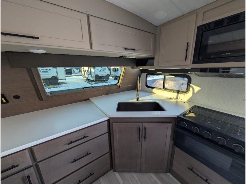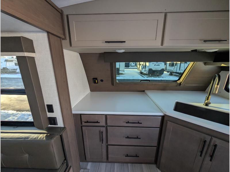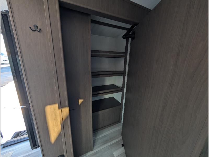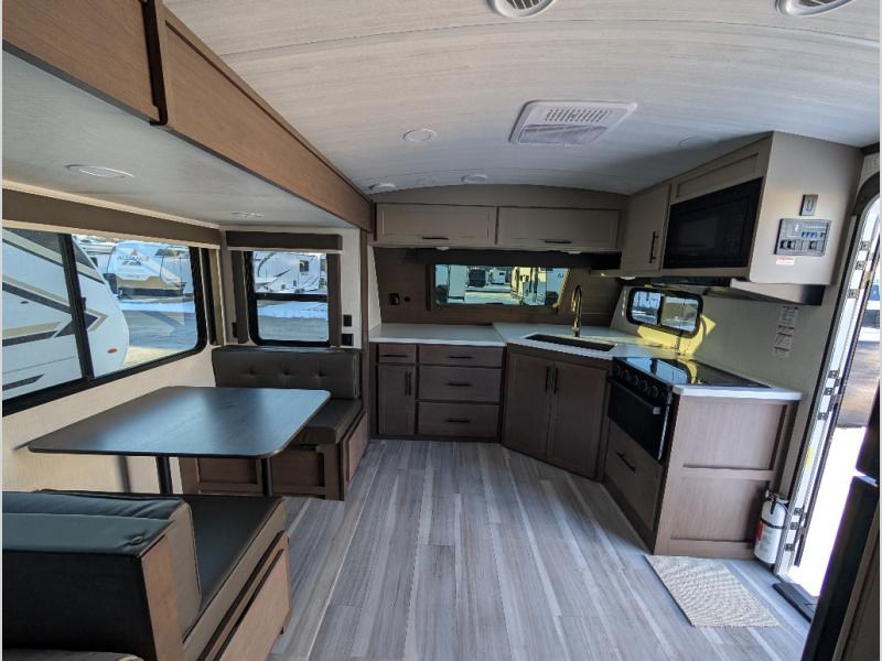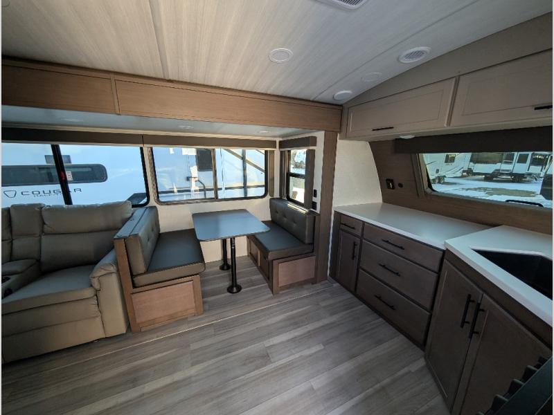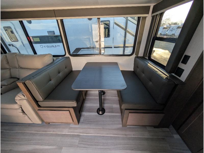 With a queen-size bed and a king bed option, this Cougar Half-Ton travel trailer shows that you can still be comfortable even while you're away from home! The bed slides out to provide more interior space and there is a wardrobe opposite near the private entry door. The main entry up front leads into a spacious combined kitchen and living area with the front kitchen offering plenty of counter space and overhead storage. There is a 12-volt refrigerator to the left of the entry door, and access to a walk-in pantry is right around the corner from the pivoting entertainment center opposite a tri-fold sofa sleeper and booth dinette slide. This unit also features a full-width walk-thru bath giving you plenty of room to shower and change.
