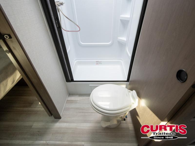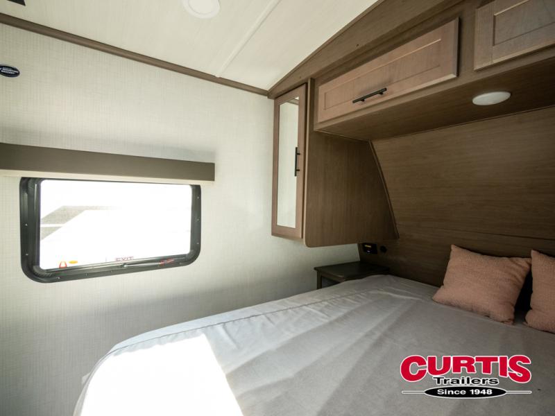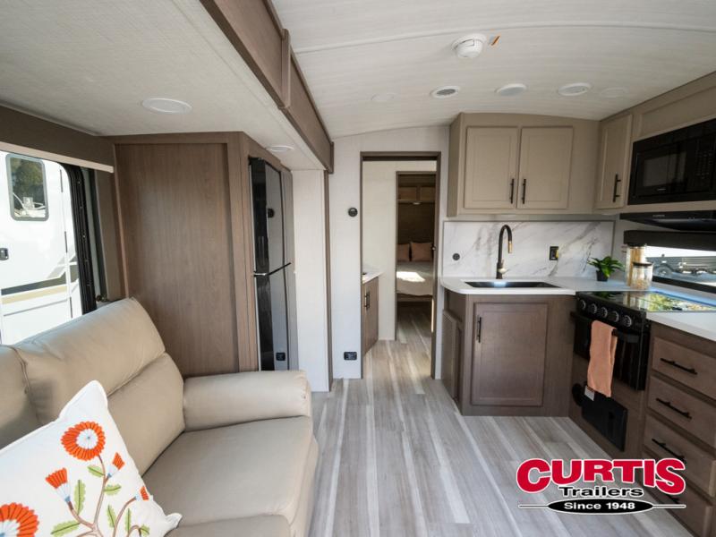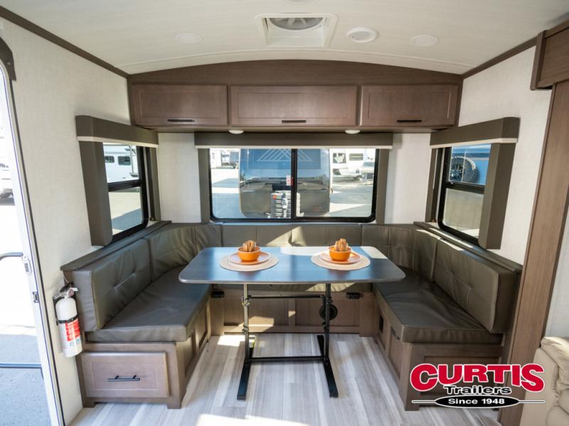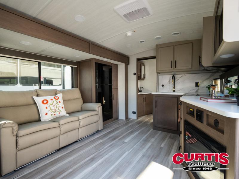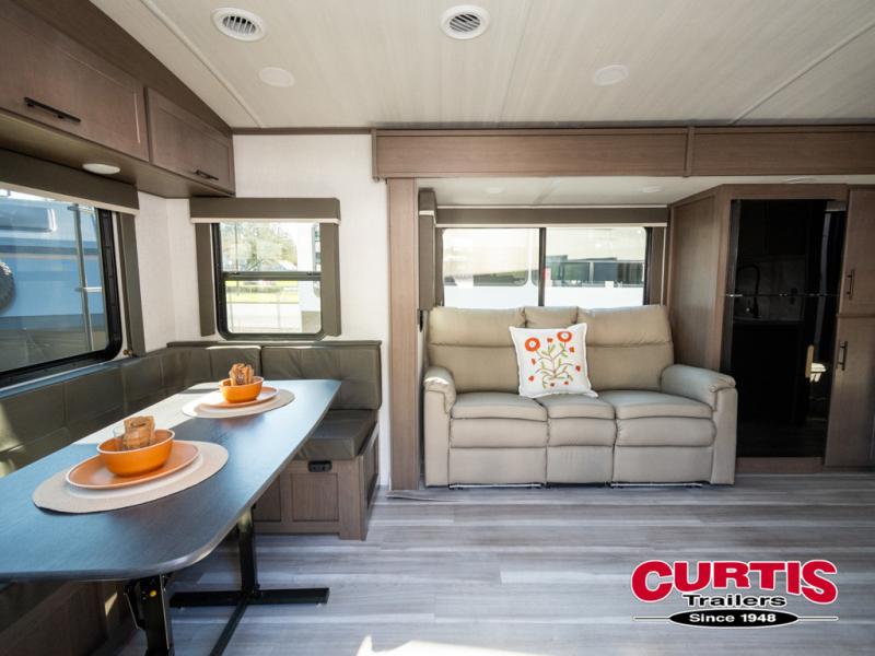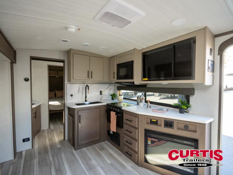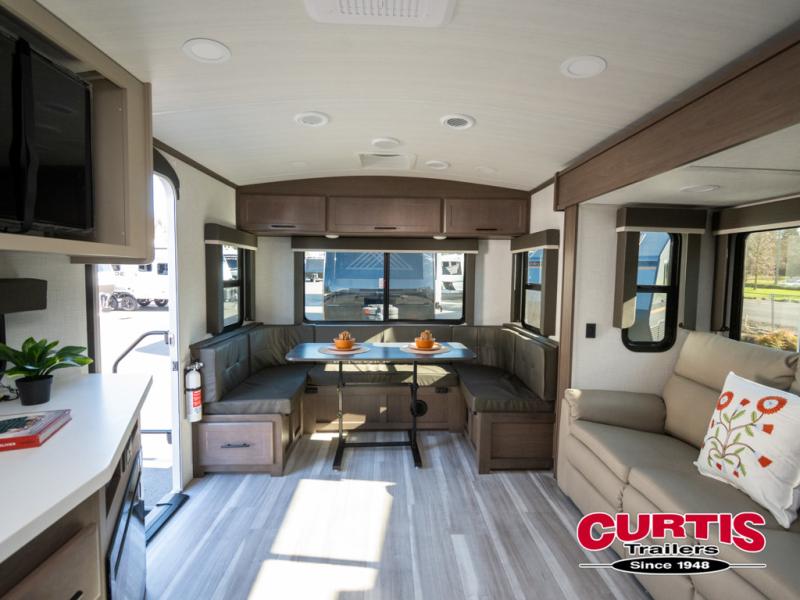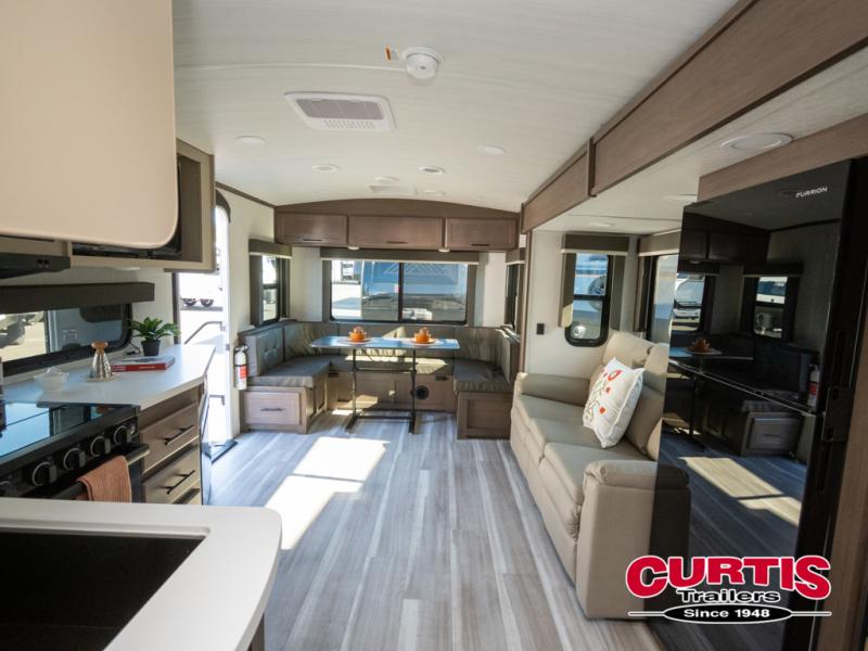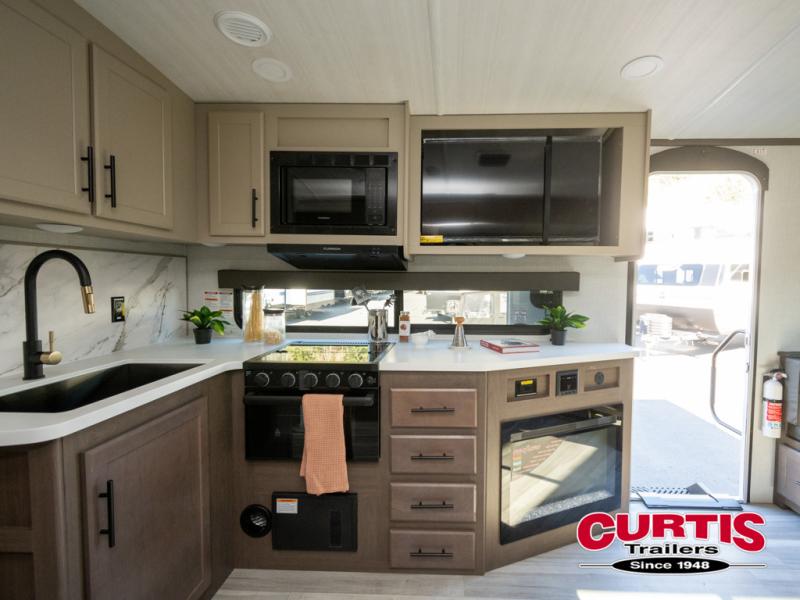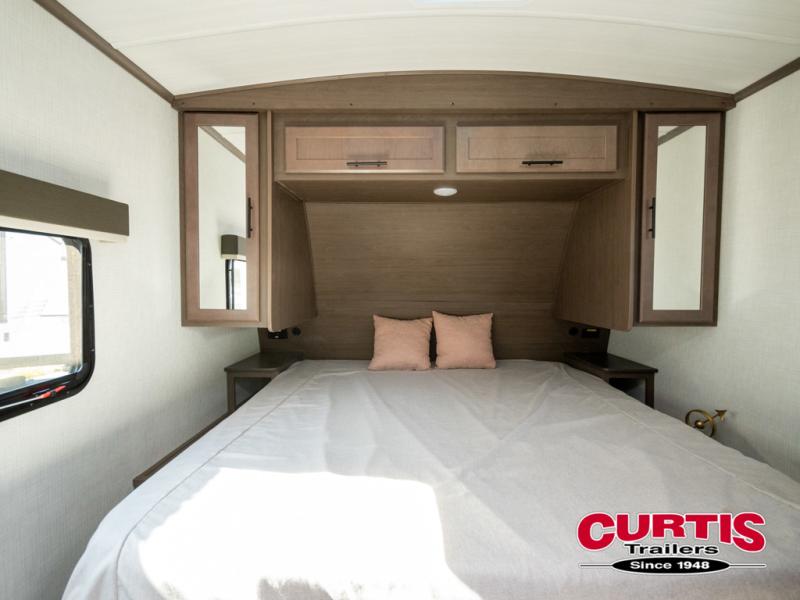 You will enjoy all of your adventures with this Cougar Half-Ton travel trailer in tow! Inside, you will find ample space and seating with a large slide that includes a tri-fold sofa sleeper along one side and a U-shaped dinette across the entire back of the unit making mealtime and game time loads of fun. These features will allow you to easily entertain your RV park friends and overnight guests too. The tri-fold sofa sleeper can comfortably sleep two guests who will also enjoy the cozy fireplace on a cool chilly night. A private front bedroom including a king-size bed will ensure that you have a great night's rest, and the private second entry door into the front bedroom makes it easy to slip out for a morning walk before your guests awake. This unit also features ample storage both inside and out with a front pass-through compartment, wardrobes and overhead cabinetry throughout, and a pantry for your non-perishables.