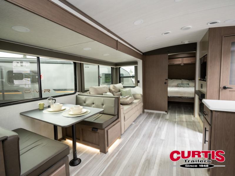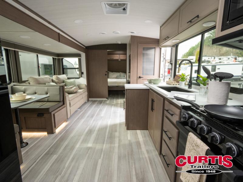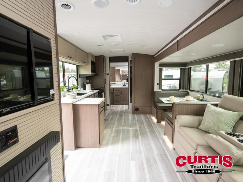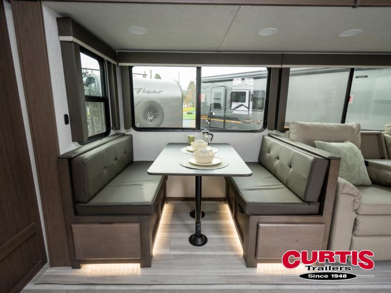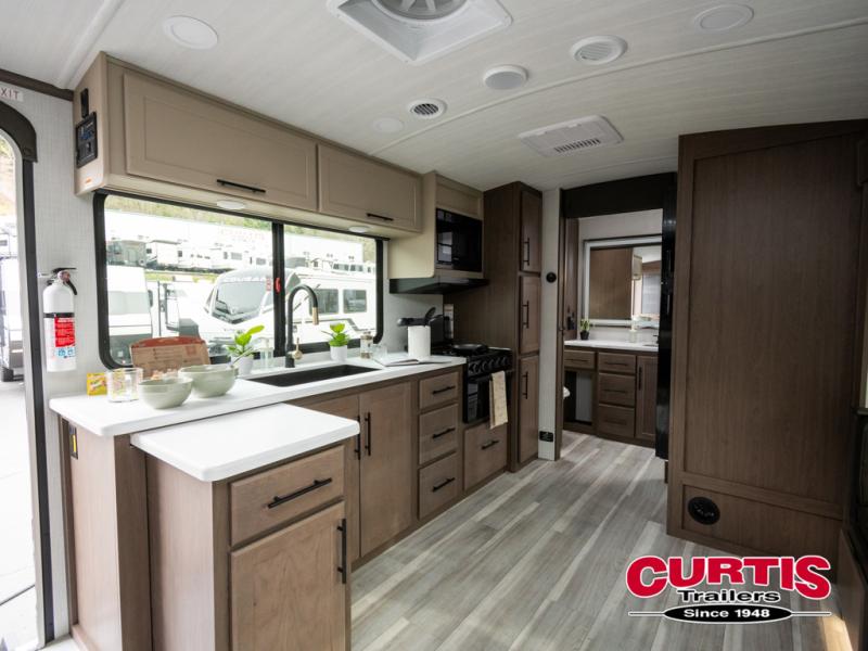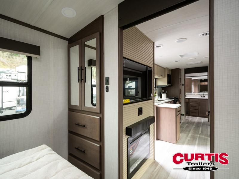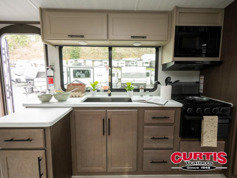 Wherever you decide to camp in this travel trailer, you'll be met with comfort and convenience! The full rear bath includes a space saving sliding door, toilet, sink, and linen closet for towels. A large slide out provides more space to move about, and here you'll enjoy the tri-fold sleeper sofa and booth dinette with storage drawers. There is also a fireplace and TV across from the furniture to enjoy movie nights! The chef of your group can make meals on the cooktop or in the microwave, and there is a pull-out countertop for extra counter space. Up front, a private bedroom includes a king bed, dual nightstands, and washer and dryer prep.