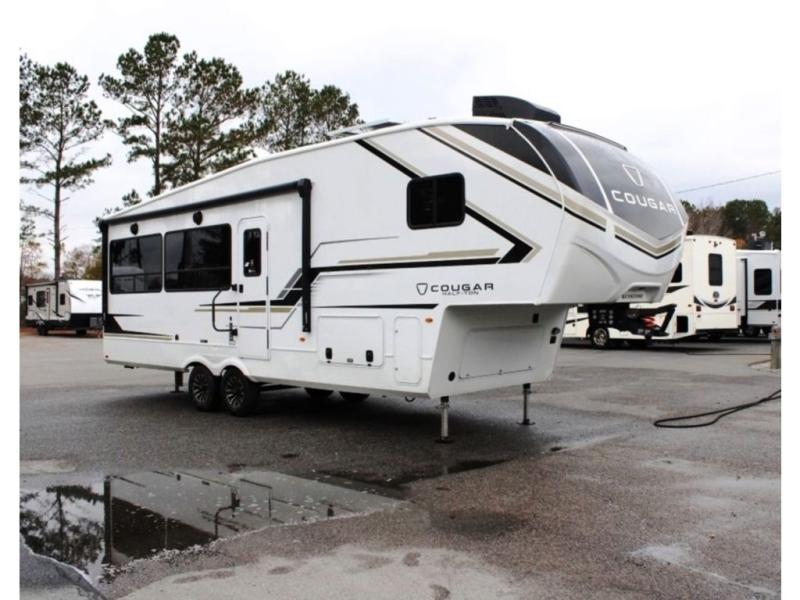 The Keystone Cougar Half-Ton fifth wheel and travel trailers are known as one of America's favorites for a reason! Some of those reasons are the exclusive features that come from Keystone, like the Winegard Air 360+ omni-directional rooftop antenna, the in-floor heating ducts, and the HyperCore composite wall construction with Vixen Fibrogloss high-gloss finish. The Cougar Half-Ton has a Climate Guard protection package with heat-deflecting white sidewalls, two roof attic vents, PEX plumbing and more to enjoy four season camping. Inside, you'll love the dimmable lighting, night roller shades throughout, shower skylight, and bedside USB outlets to keep your electronics charged.