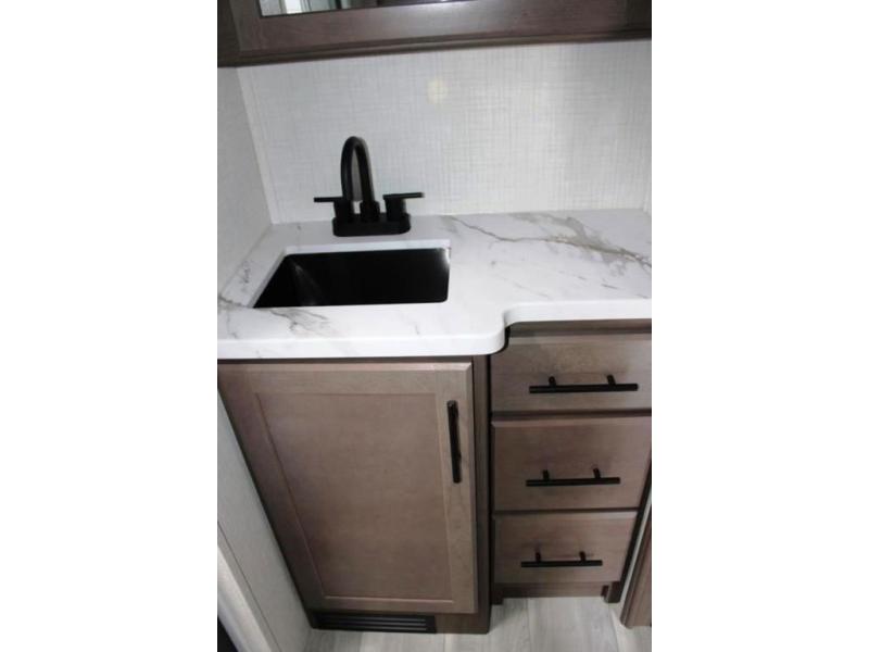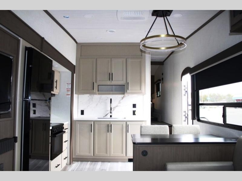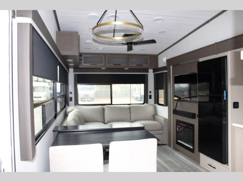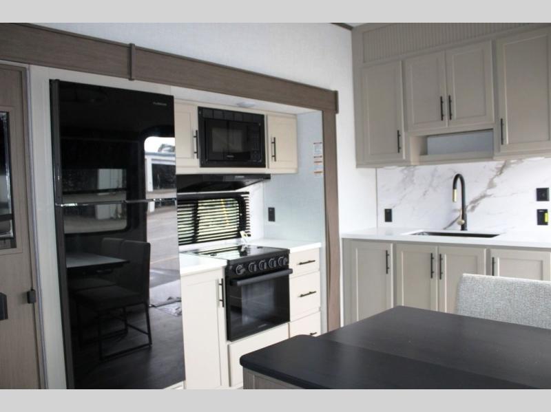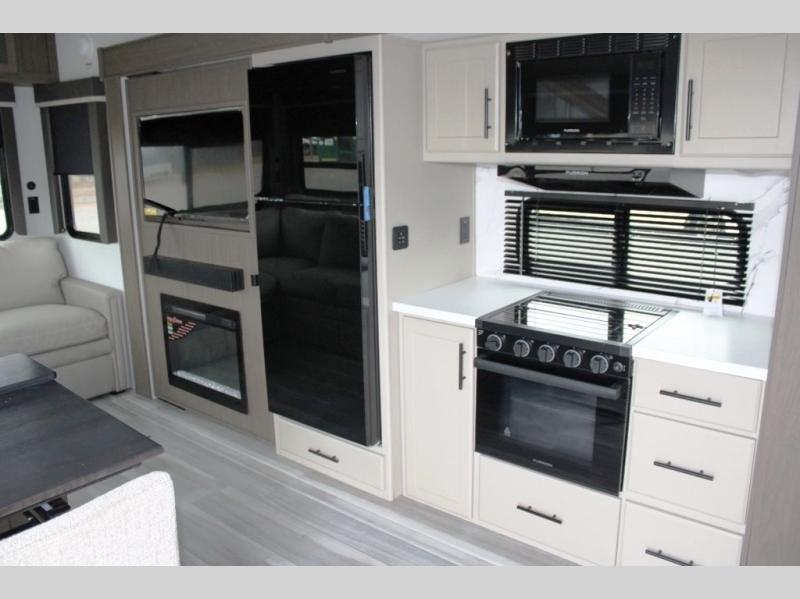 Comfort is just a step away in this fifth wheel with a large slide out. Here, you'll find the hidden pantry behind the pivoting entertainment door plus your kitchen appliances. The stainless steel sink will let you easily clean up, and the pivot dinette with two extra folding chairs provides versatile space to dine or work. Your crew can get comfortable on the L-shaped sofa after dinner, or head outdoors under the 18' power awning. A full bath lets you clean up after a day at the lake, and the front private bedroom with a king bed gives you your own space at night. There are also dual wardrobes and nightstands plus a wardrobe with washer and dryer prep for the option to go full-time!