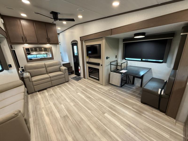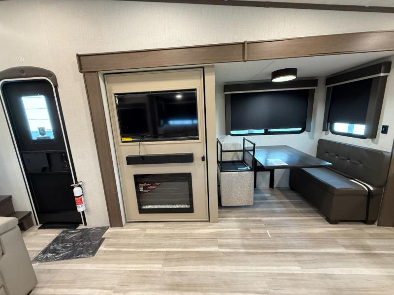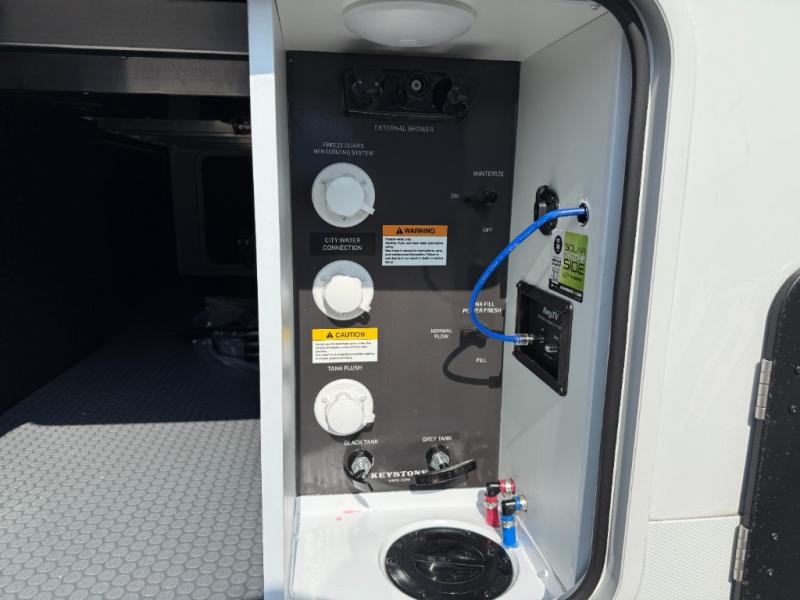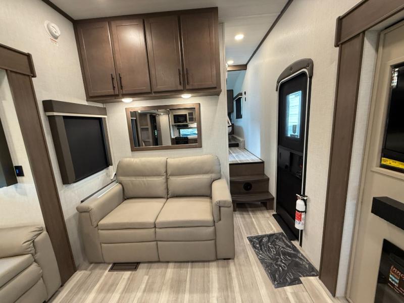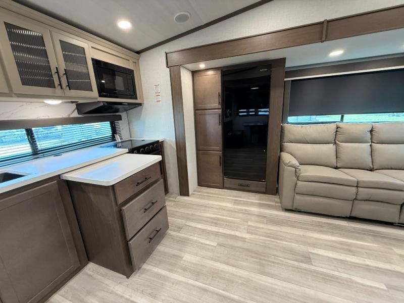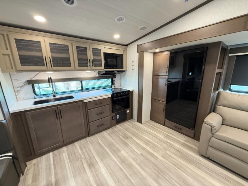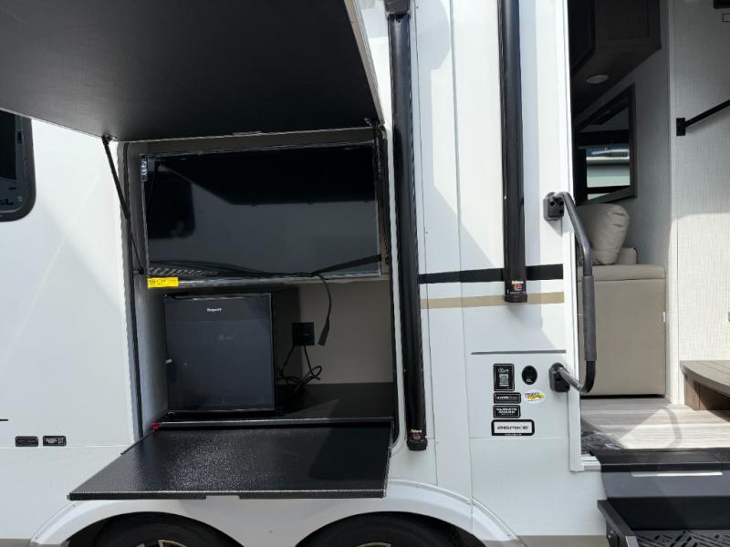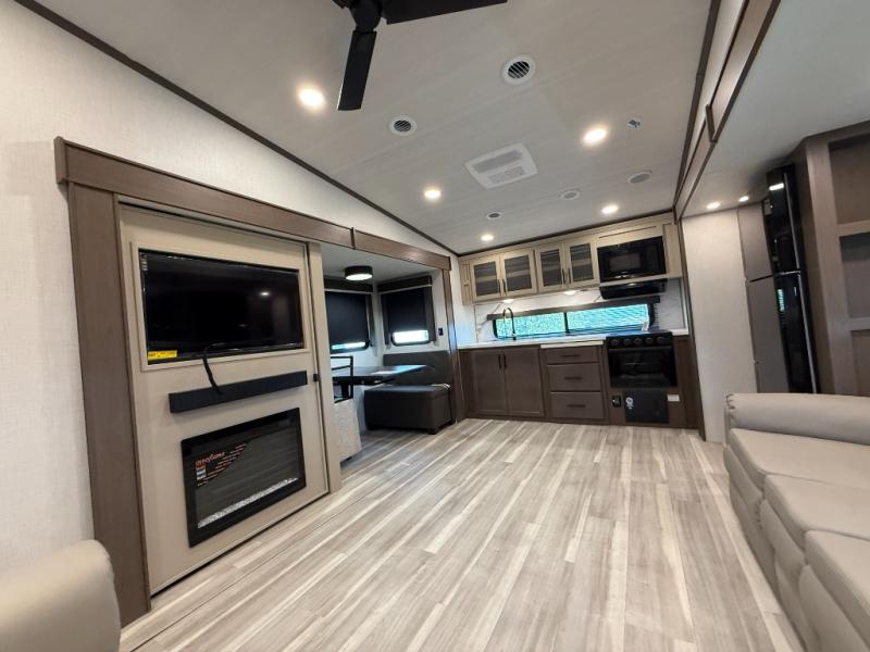 Time spent at the campground in this fifth wheel will be time well spent! Once you arrive, you can unload the unobstructed pass-thru storage, put out the two power awnings, and grab a cold drink from the outdoor mini refrigerator. Head inside to relax on the tri-fold sleeper sofa or theater seating across from the LED HDTV. The rear kitchen includes everything you need to make meals each day, including a pull-out countertop for more space plus a pantry and 12V refrigerator for food storage. The full bath with a 30" x 36" shower will let you freshen up before bed, and speaking of bedtime, the king bed in the front private bedroom is sure to bring a great night's rest. There are also dual wardrobes and nightstands here for your things, plus a third wardrobe with washer and dryer prep if you want to add these appliances.