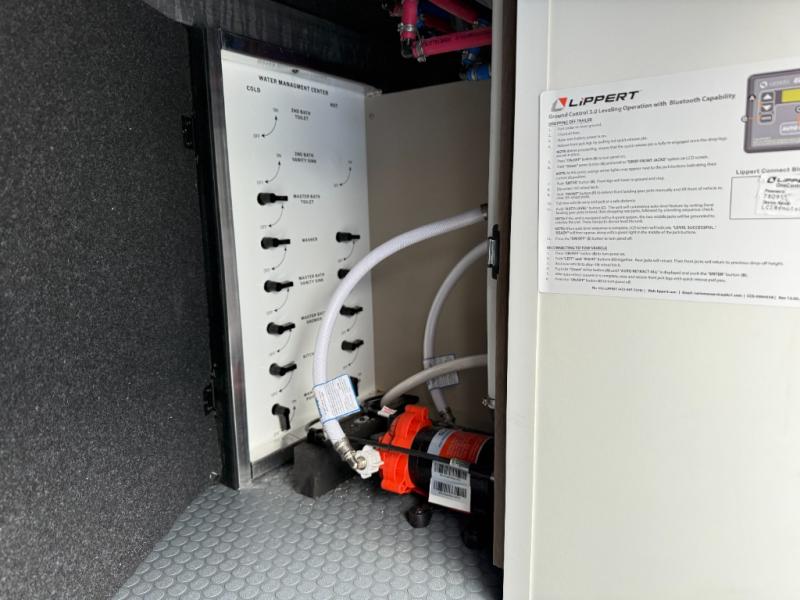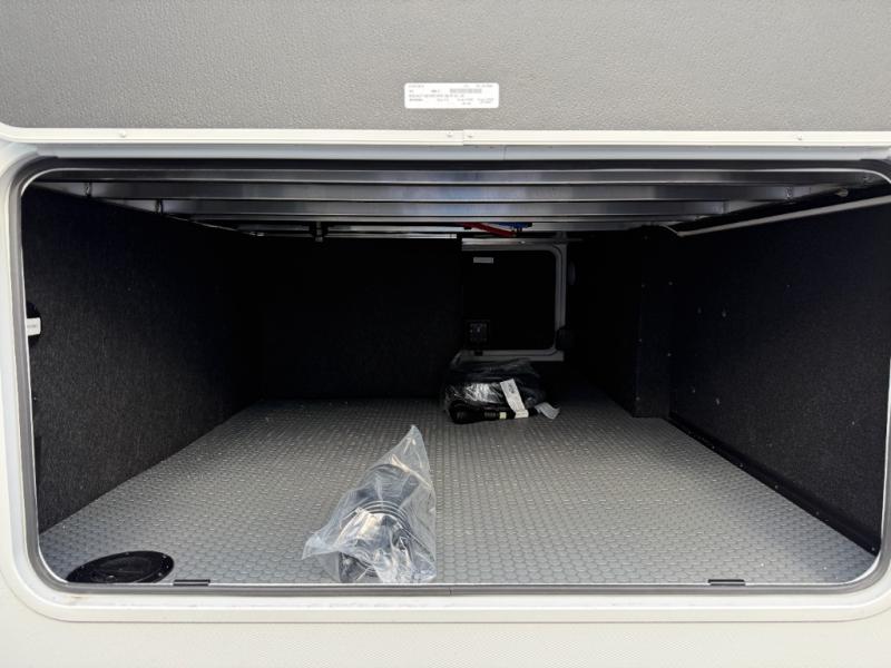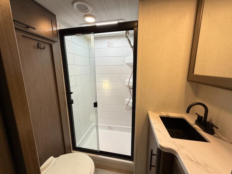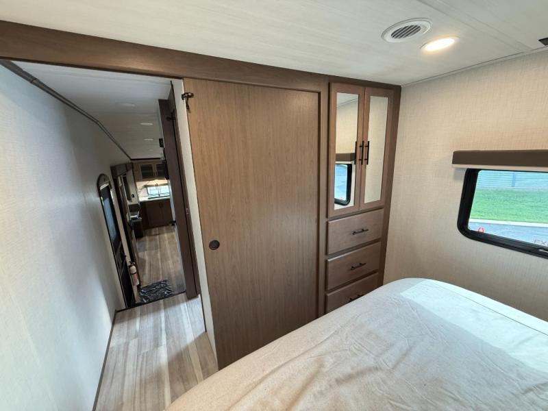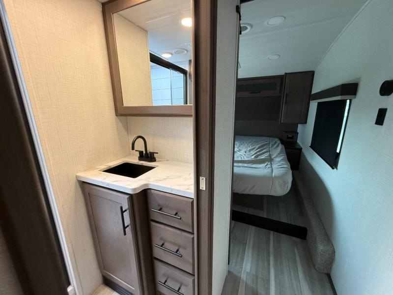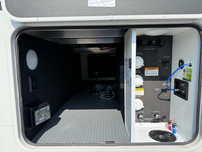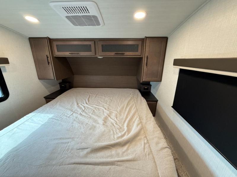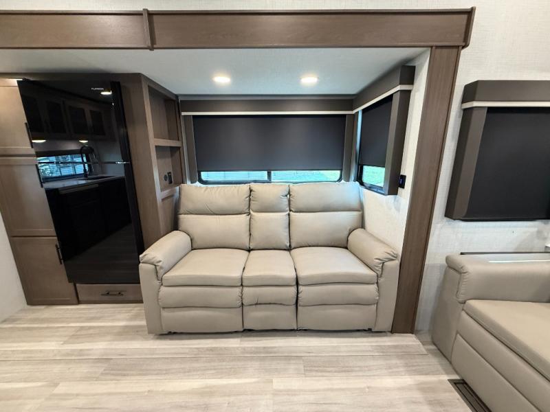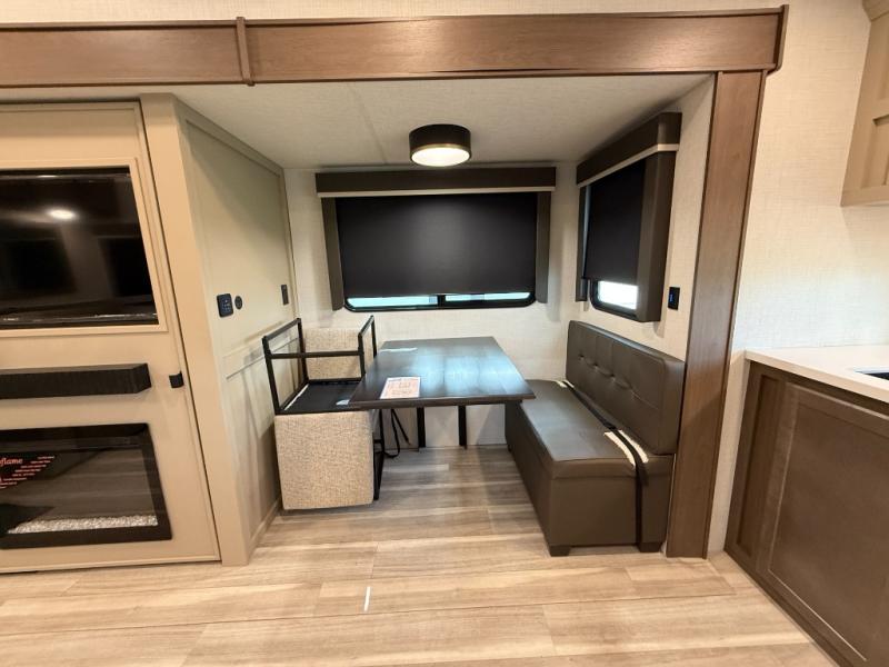Time spent at the campground in this fifth wheel will be time well spent! Once you arrive, you can unload the unobstructed pass-thru storage, put out the two power awnings, and grab a cold drink from the outdoor mini refrigerator. Head inside to relax on the tri-fold sleeper sofa or theater seating across from the LED HDTV. The rear kitchen includes everything you need to make meals each day, including a pull-out countertop for more space plus a pantry and 12V refrigerator for food storage. The full bath with a 30" x 36" shower will let you freshen up before bed, and speaking of bedtime, the king bed in the front private bedroom is sure to bring a great night's rest. There are also dual wardrobes and nightstands here for your things, plus a third wardrobe with washer and dryer prep if you want to add these appliances.