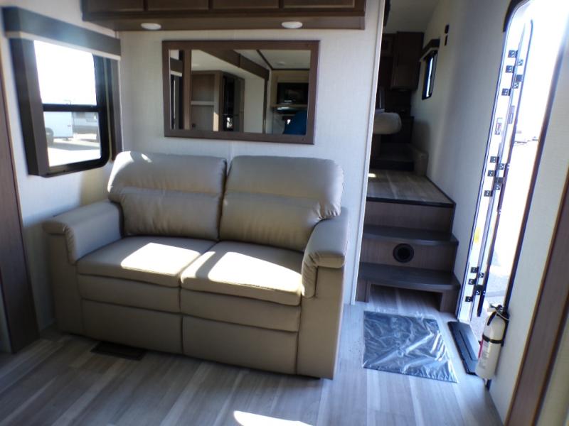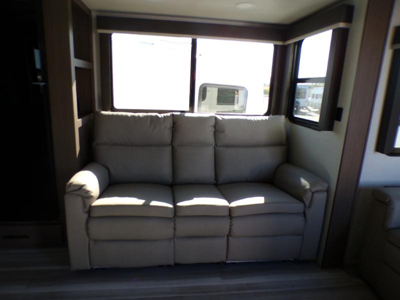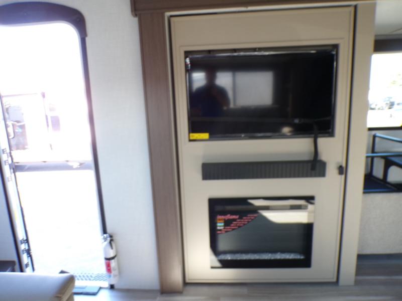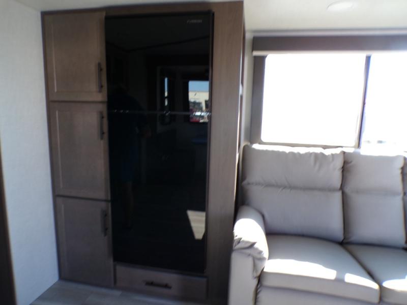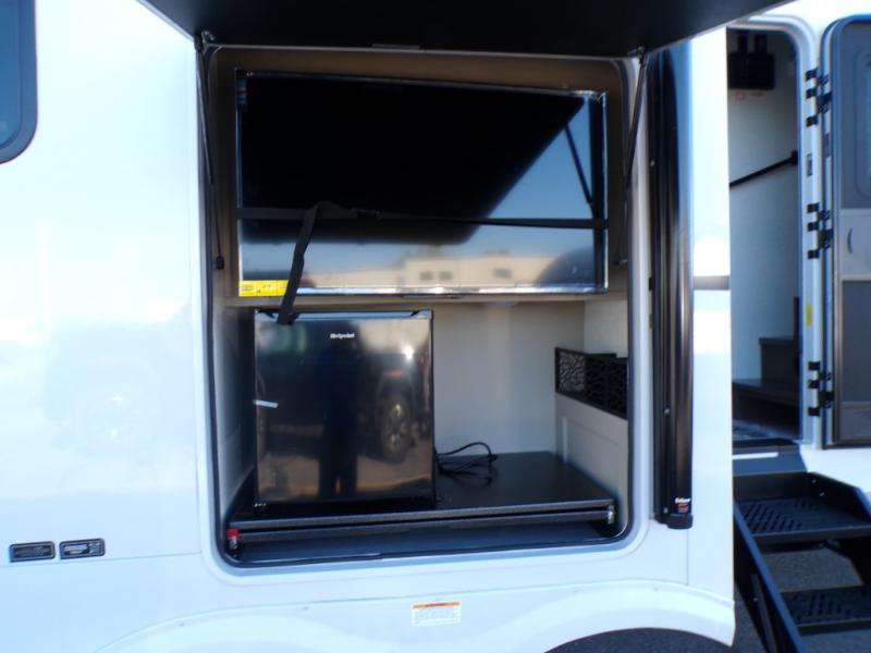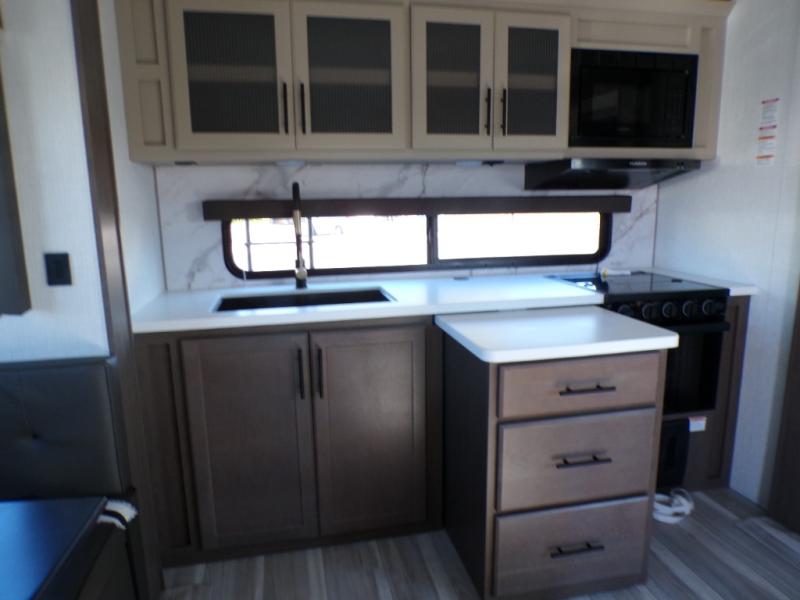 Time spent at the campground in this fifth wheel will be time well spent! Once you arrive, you can unload the unobstructed pass-thru storage, put out the two power awnings, and grab a cold drink from the outdoor mini refrigerator. Head inside to relax on the tri-fold sleeper sofa or theater seating across from the LED HDTV. The rear kitchen includes everything you need to make meals each day, including a pull-out countertop for more space plus a pantry and 12V refrigerator for food storage. The full bath with a 30" x 36" shower will let you freshen up before bed, and speaking of bedtime, the king bed in the front private bedroom is sure to bring a great night's rest. There are also dual wardrobes and nightstands here for your things, plus a third wardrobe with washer and dryer prep if you want to add these appliances.