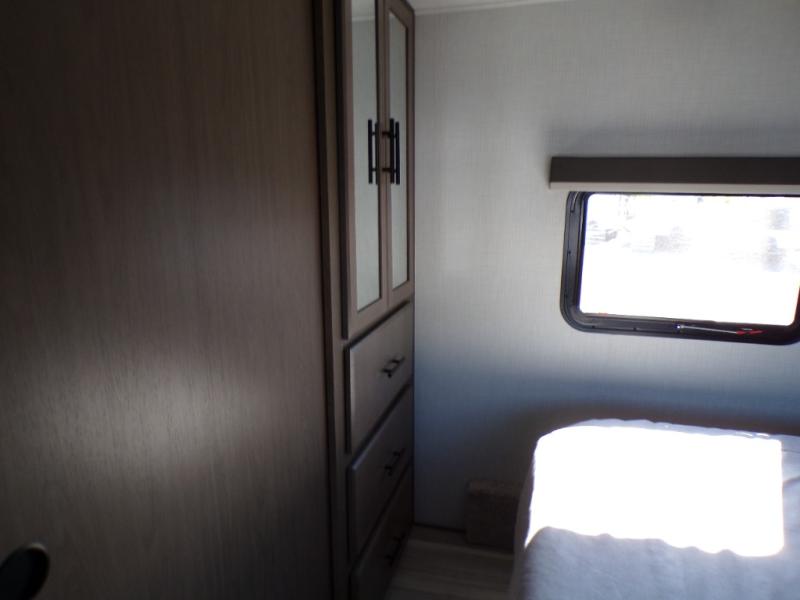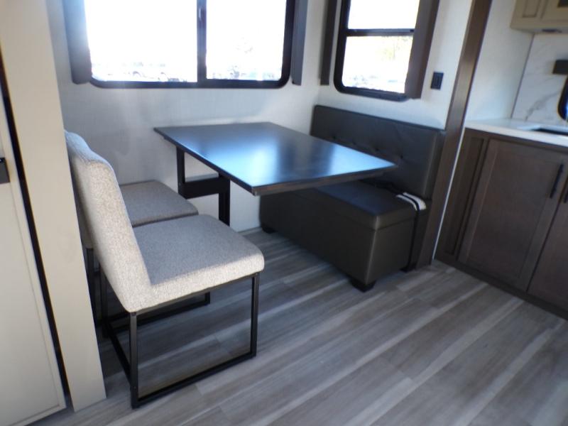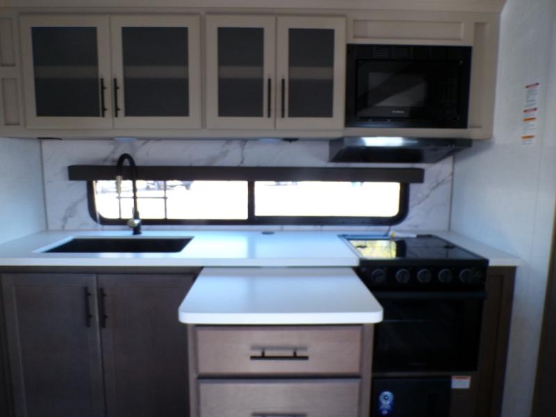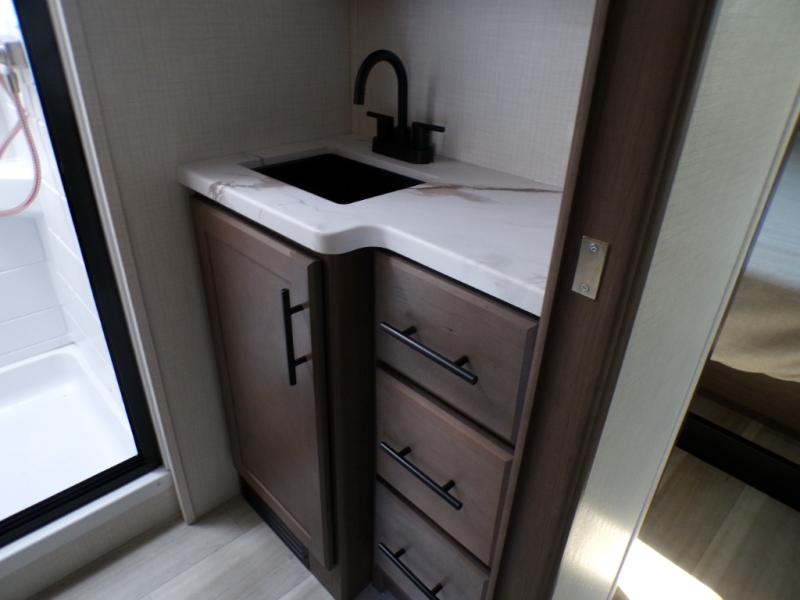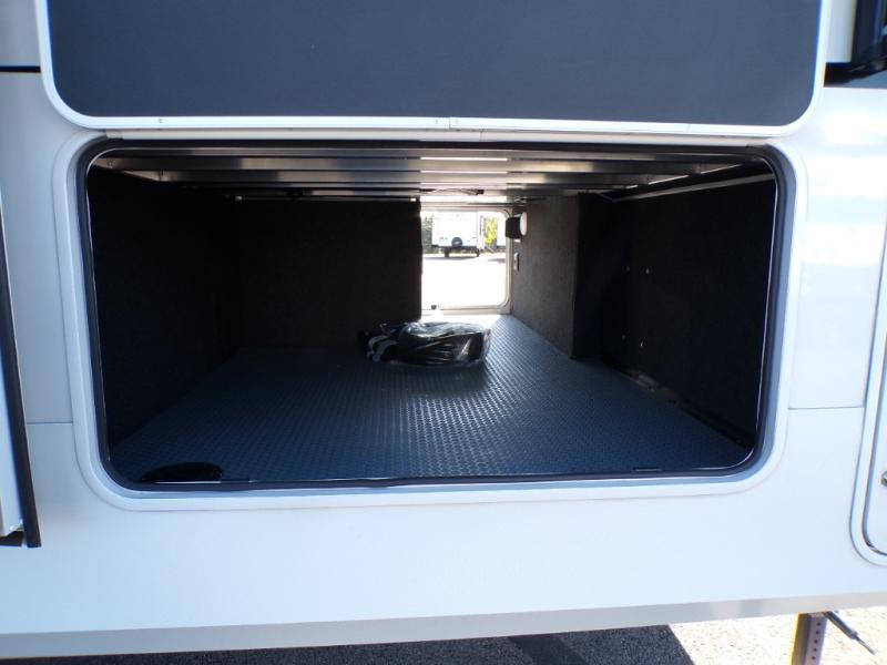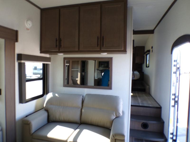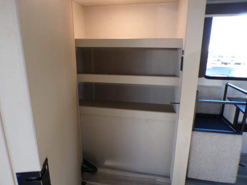 Time spent at the campground in this fifth wheel will be time well spent! Once you arrive, you can unload the unobstructed pass-thru storage, put out the two power awnings, and grab a cold drink from the outdoor mini refrigerator. Head inside to relax on the tri-fold sleeper sofa or theater seating across from the LED HDTV. The rear kitchen includes everything you need to make meals each day, including a pull-out countertop for more space plus a pantry and 12V refrigerator for food storage. The full bath with a 30" x 36" shower will let you freshen up before bed, and speaking of bedtime, the king bed in the front private bedroom is sure to bring a great night's rest. There are also dual wardrobes and nightstands here for your things, plus a third wardrobe with washer and dryer prep if you want to add these appliances.