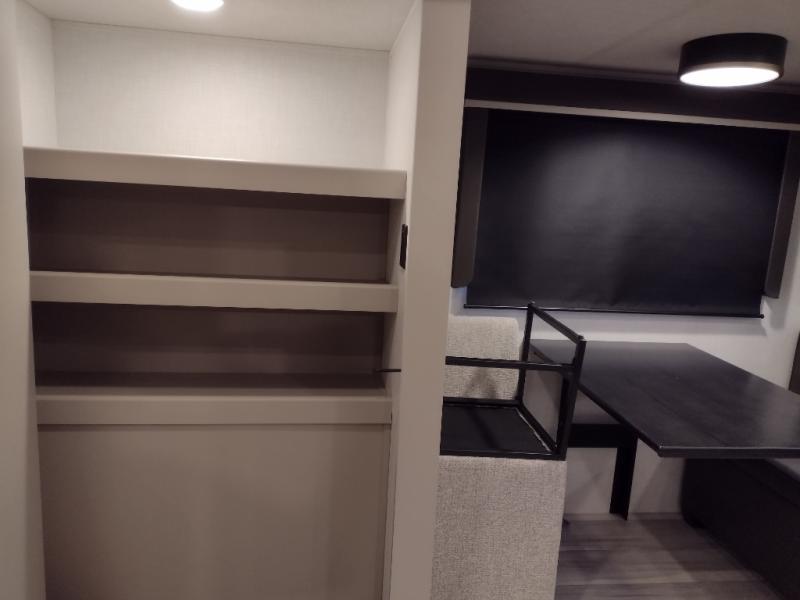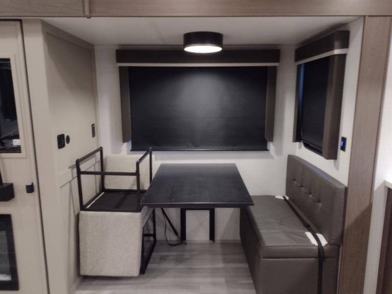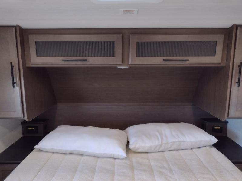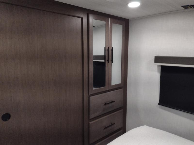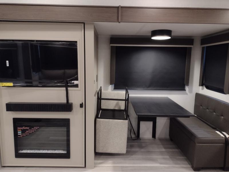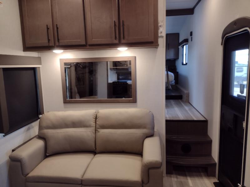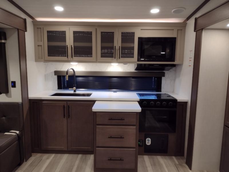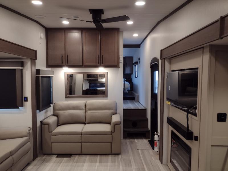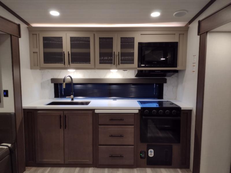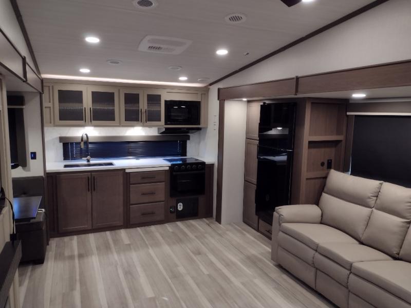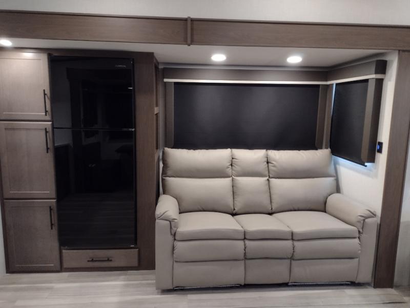 Time spent at the campground in this fifth wheel will be time well spent! Once you arrive, you can unload the unobstructed pass-thru storage, put out the two power awnings, and grab a cold drink from the outdoor mini refrigerator. Head inside to relax on the tri-fold sleeper sofa or theater seating across from the LED HDTV. The rear kitchen includes everything you need to make meals each day, including a pull-out countertop for more space plus a pantry and 12V refrigerator for food storage. The full bath with a 30" x 36" shower will let you freshen up before bed, and speaking of bedtime, the king bed in the front private bedroom is sure to bring a great night's rest. There are also dual wardrobes and nightstands here for your things, plus a third wardrobe with washer and dryer prep if you want to add these appliances.