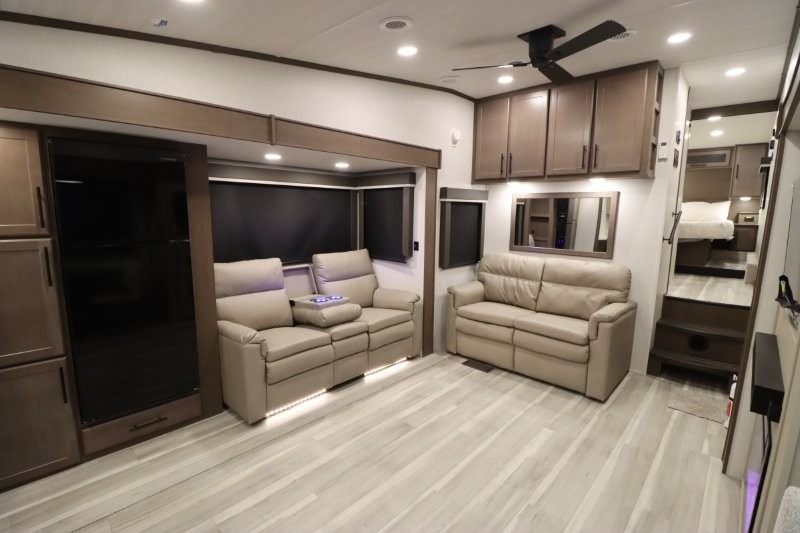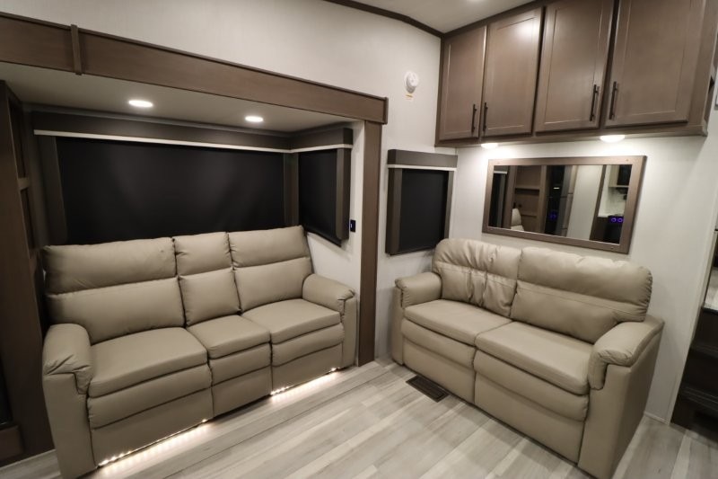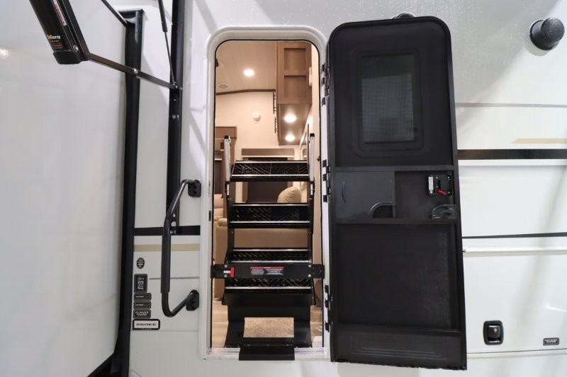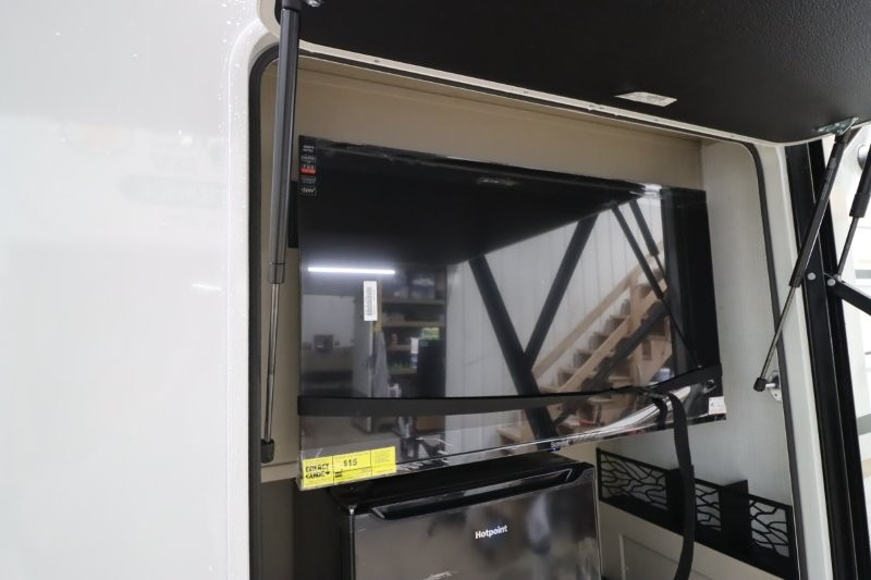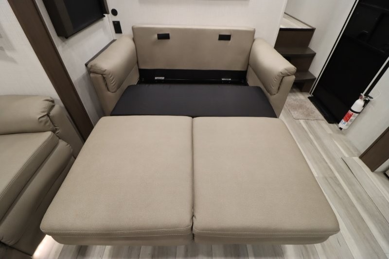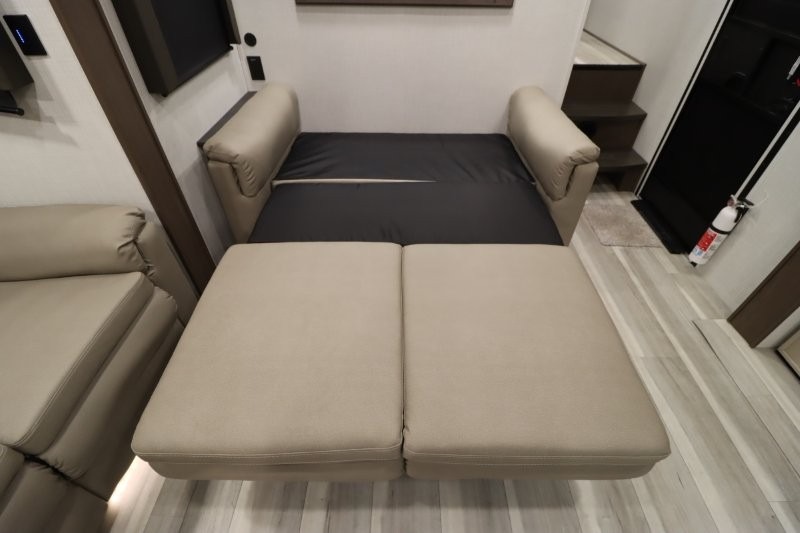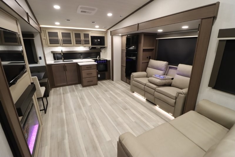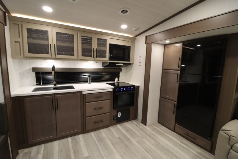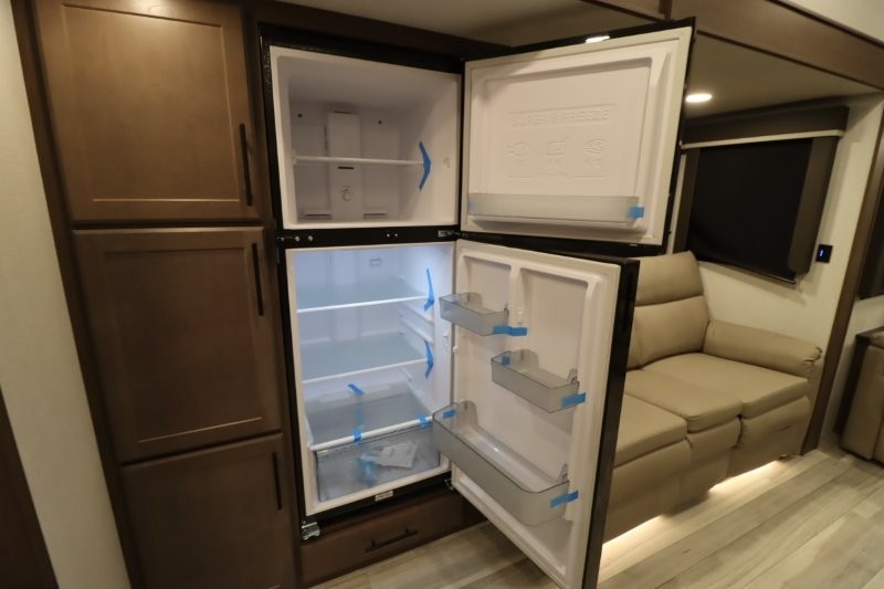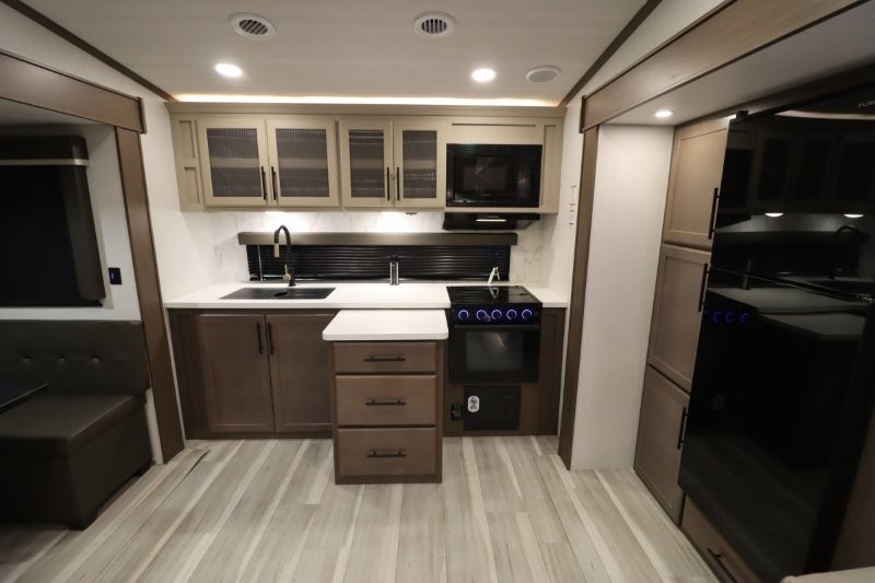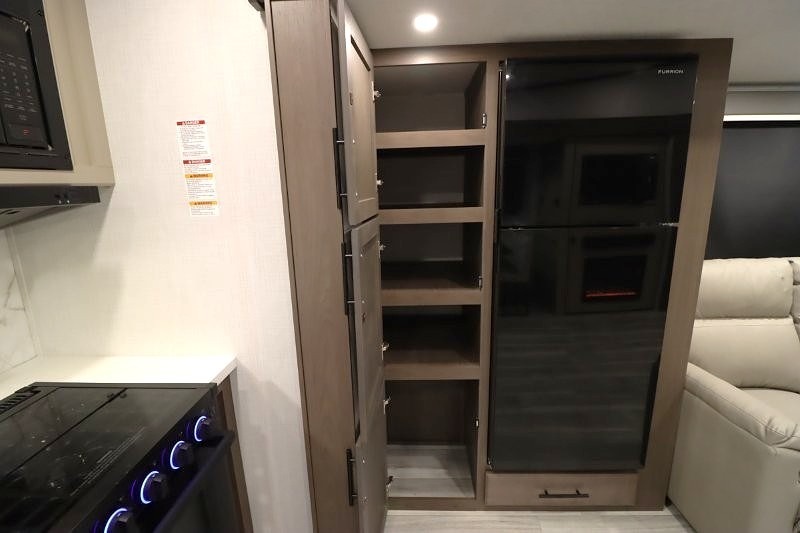 Time spent at the campground in this fifth wheel will be time well spent! Once you arrive, you can unload the unobstructed pass-thru storage, put out the two power awnings, and grab a cold drink from the outdoor mini refrigerator. Head inside to relax on the tri-fold sleeper sofa or theater seating across from the LED HDTV. The rear kitchen includes everything you need to make meals each day, including a pull-out countertop for more space plus a pantry and 12V refrigerator for food storage. The full bath with a 30" x 36" shower will let you freshen up before bed, and speaking of bedtime, the king bed in the front private bedroom is sure to bring a great night's rest. There are also dual wardrobes and nightstands here for your things, plus a third wardrobe with washer and dryer prep if you want to add these appliances.