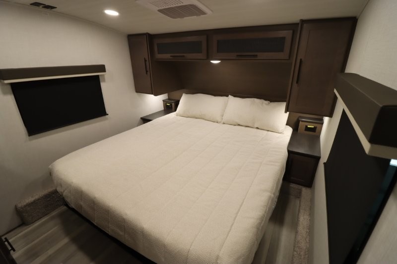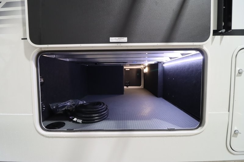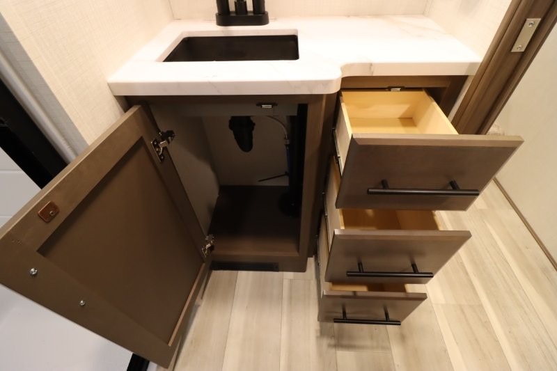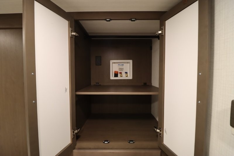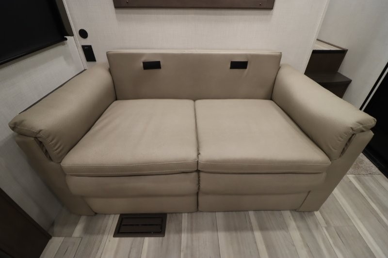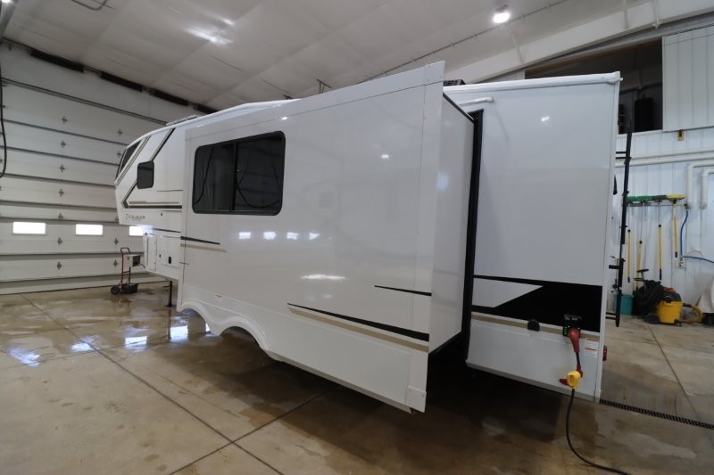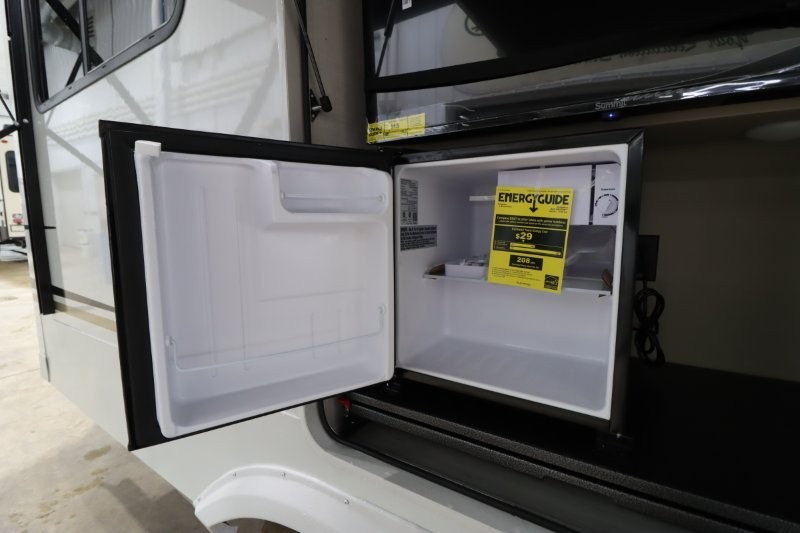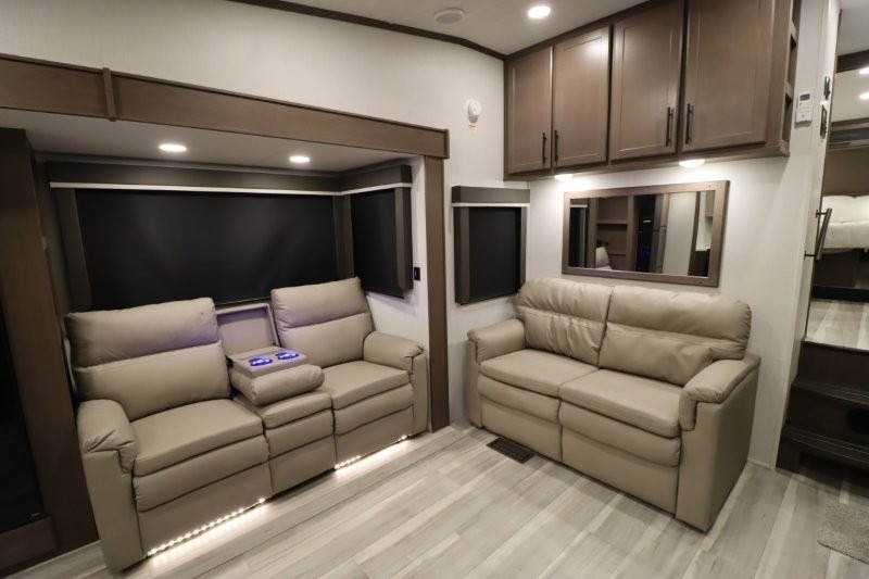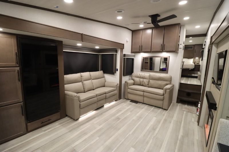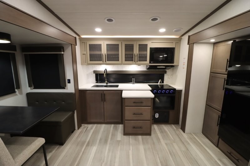 Time spent at the campground in this fifth wheel will be time well spent! Once you arrive, you can unload the unobstructed pass-thru storage, put out the two power awnings, and grab a cold drink from the outdoor mini refrigerator. Head inside to relax on the tri-fold sleeper sofa or theater seating across from the LED HDTV. The rear kitchen includes everything you need to make meals each day, including a pull-out countertop for more space plus a pantry and 12V refrigerator for food storage. The full bath with a 30" x 36" shower will let you freshen up before bed, and speaking of bedtime, the king bed in the front private bedroom is sure to bring a great night's rest. There are also dual wardrobes and nightstands here for your things, plus a third wardrobe with washer and dryer prep if you want to add these appliances.