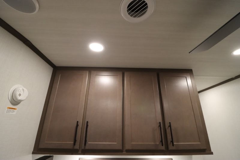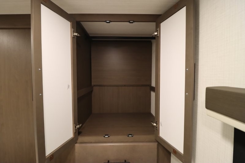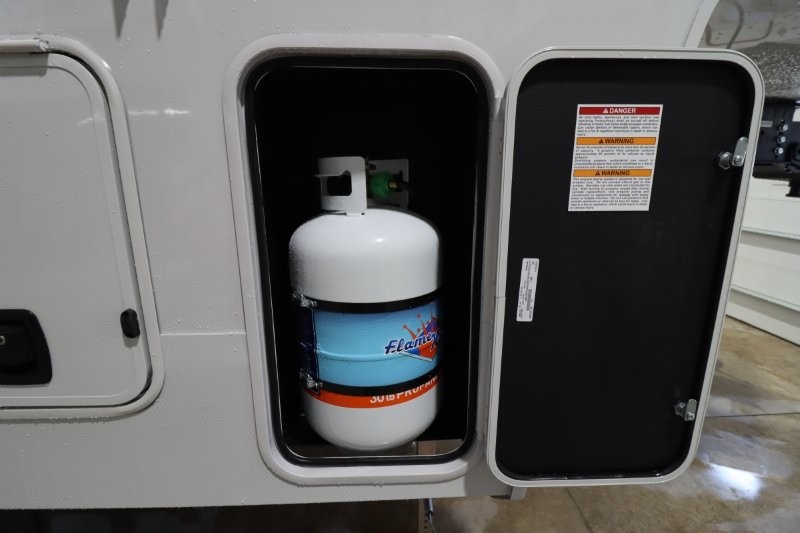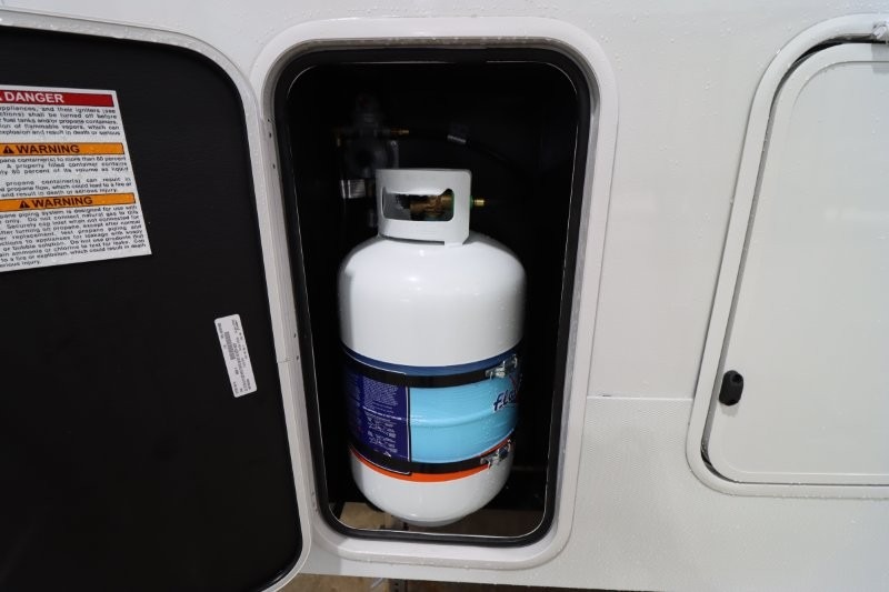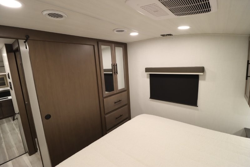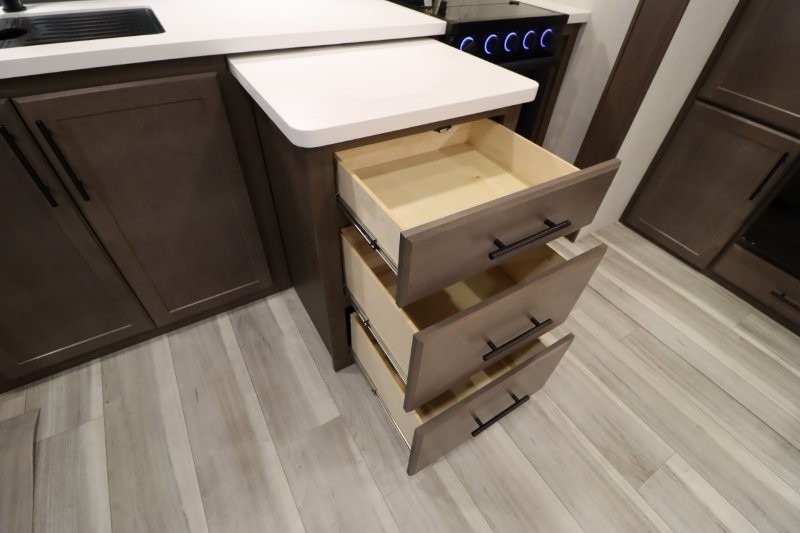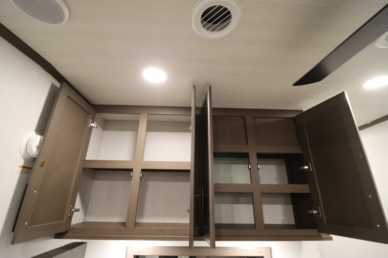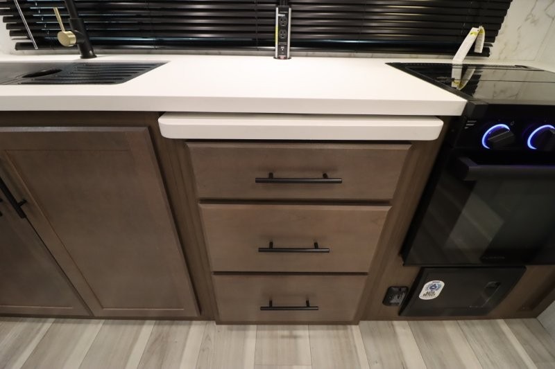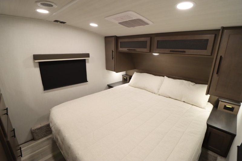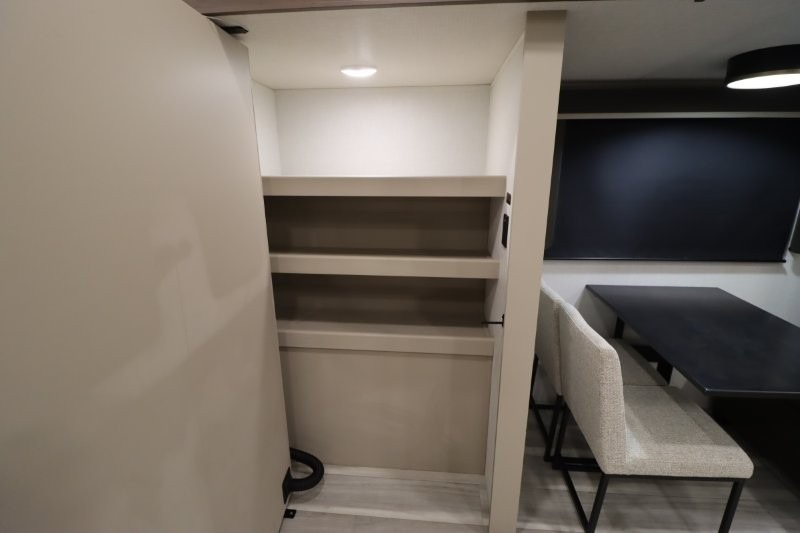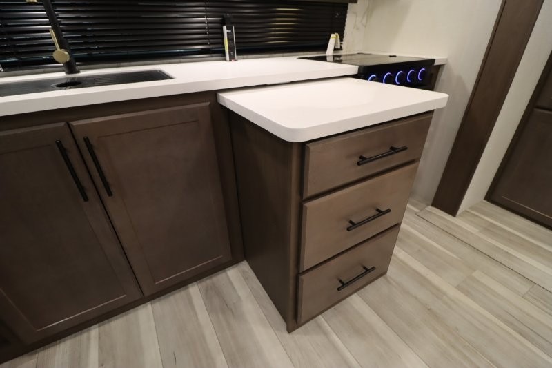 Time spent at the campground in this fifth wheel will be time well spent! Once you arrive, you can unload the unobstructed pass-thru storage, put out the two power awnings, and grab a cold drink from the outdoor mini refrigerator. Head inside to relax on the tri-fold sleeper sofa or theater seating across from the LED HDTV. The rear kitchen includes everything you need to make meals each day, including a pull-out countertop for more space plus a pantry and 12V refrigerator for food storage. The full bath with a 30" x 36" shower will let you freshen up before bed, and speaking of bedtime, the king bed in the front private bedroom is sure to bring a great night's rest. There are also dual wardrobes and nightstands here for your things, plus a third wardrobe with washer and dryer prep if you want to add these appliances.