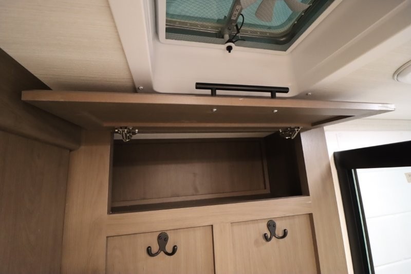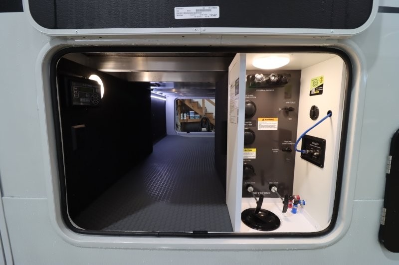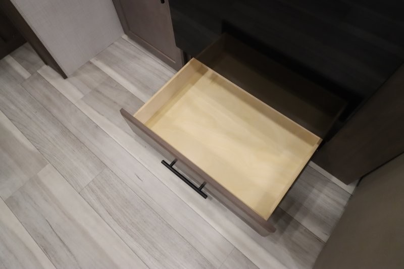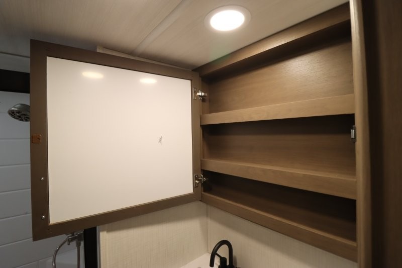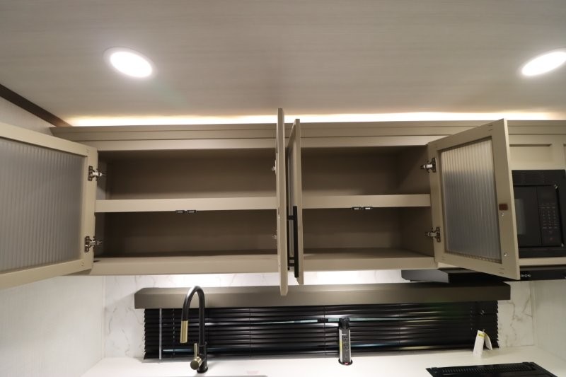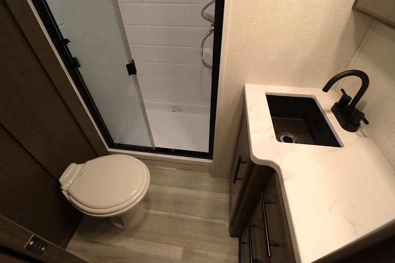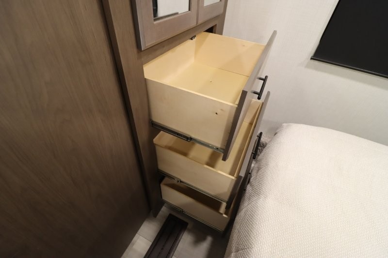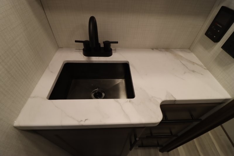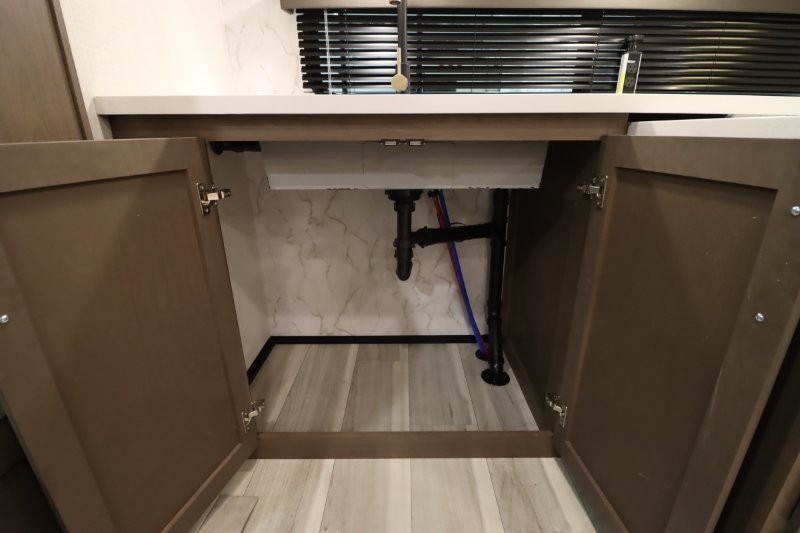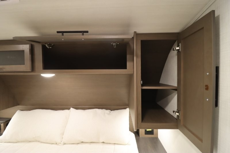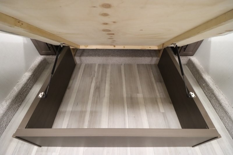 Time spent at the campground in this fifth wheel will be time well spent! Once you arrive, you can unload the unobstructed pass-thru storage, put out the two power awnings, and grab a cold drink from the outdoor mini refrigerator. Head inside to relax on the tri-fold sleeper sofa or theater seating across from the LED HDTV. The rear kitchen includes everything you need to make meals each day, including a pull-out countertop for more space plus a pantry and 12V refrigerator for food storage. The full bath with a 30" x 36" shower will let you freshen up before bed, and speaking of bedtime, the king bed in the front private bedroom is sure to bring a great night's rest. There are also dual wardrobes and nightstands here for your things, plus a third wardrobe with washer and dryer prep if you want to add these appliances.