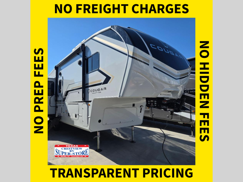 The Keystone Cougar Half-Ton fifth wheel and travel trailers are known as one of America's favorites for a reason! Some of those reasons are the exclusive features that come from Keystone, like the Winegard Air 360+ omni-directional rooftop antenna, the in-floor heating ducts, and the HyperCore composite wall construction with Vixen Fibrogloss high-gloss finish. The Cougar Half-Ton has a Climate Guard protection package with heat-deflecting white sidewalls, two roof attic vents, PEX plumbing and more to enjoy four season camping. Inside, you'll love the dimmable lighting, night roller shades throughout, shower skylight, and bedside USB outlets to keep your electronics charged.