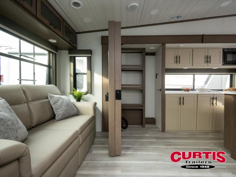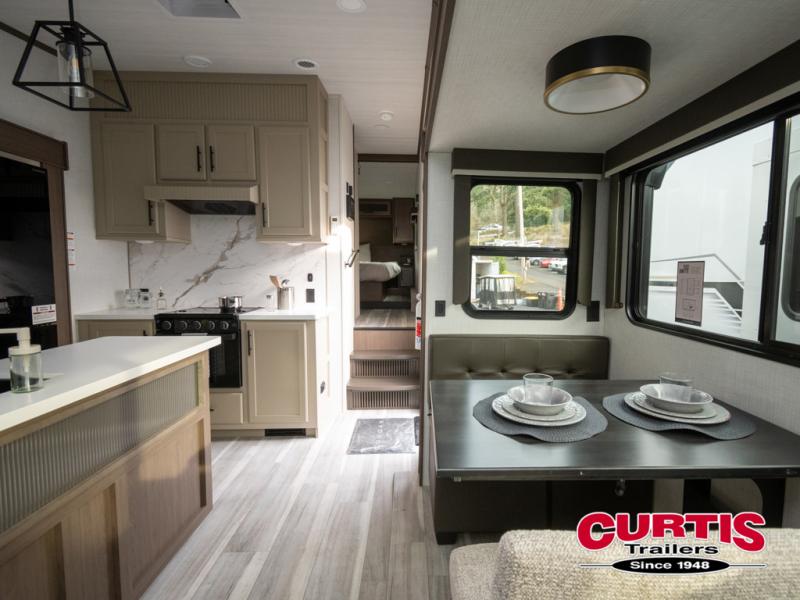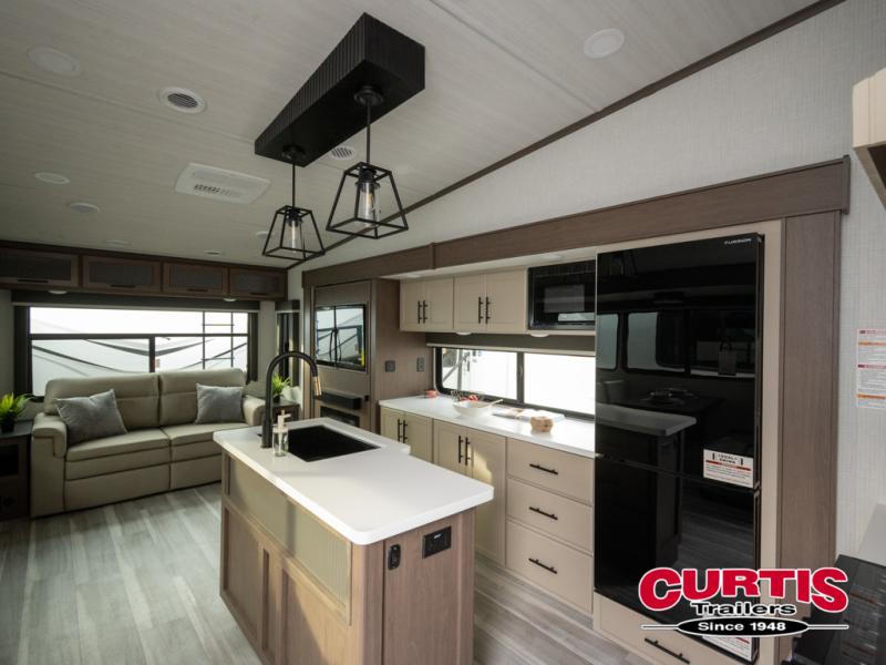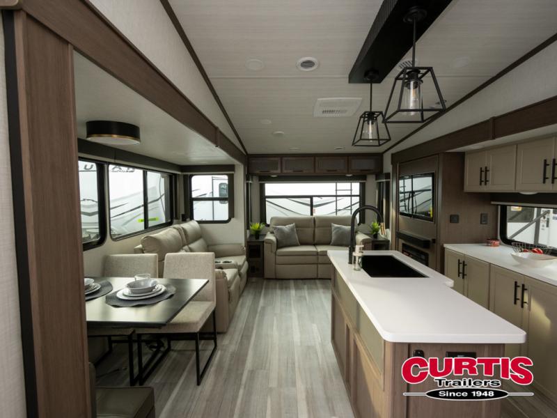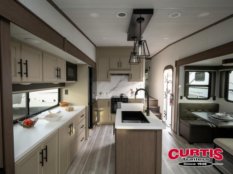 You will have the time of your life in this Cougar Half-Ton fifth wheel! There is so much comfort with the theater seating and tri-fold sleeper sofa with end tables in the living area. You also have lots of space in this area because of the opposing slides, so you can work freely around the kitchen island preparing dinner or washing dishes. The booth dinette is right next to the kitchen, so you won't have to go far to set the table. If you don't need the dinette to double as a bed, then you might be interested in switching it out for the optional free-standing table with chairs and an ottoman. You will also love the gourmet kitchen prep space with ample counter space to make your best meals!