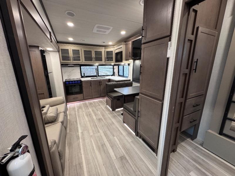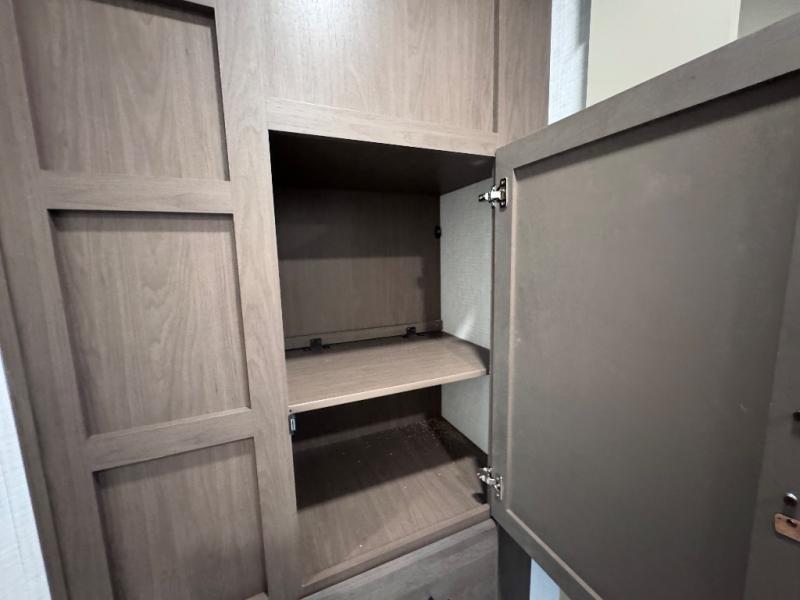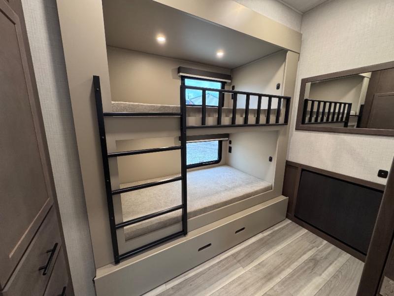 The whole crew will love camping trips in this spacious fifth wheel! From the front bedroom with a walk-around king bed to the rear kitchen with ample counter space, this is something for everyone. A middle bunkroom includes built-in bunk beds with a lower trundle bed and a flip-up table if some work needs done. Once your meals are made, you can dine at the booth dinette, relax on the sofa, or head outdoors to enjoy the power awnings. The full bath is towards the front near the bedroom for convenience. Here, you'll find a king bed, dual nightstands, plus a wardrobe with washer and dryer prep if you choose to add these appliances!