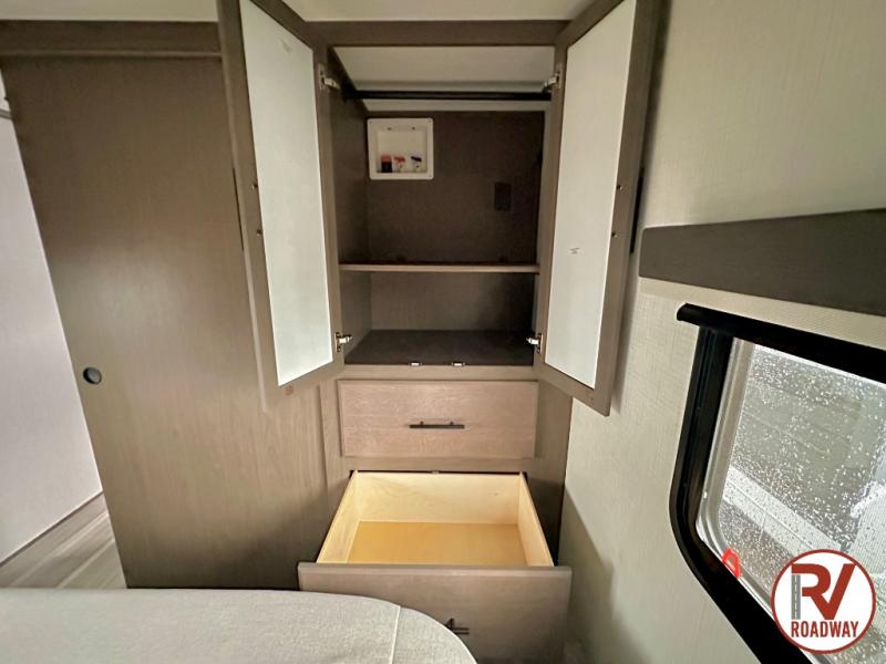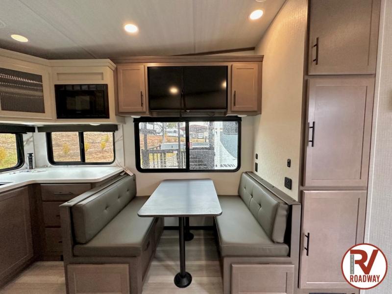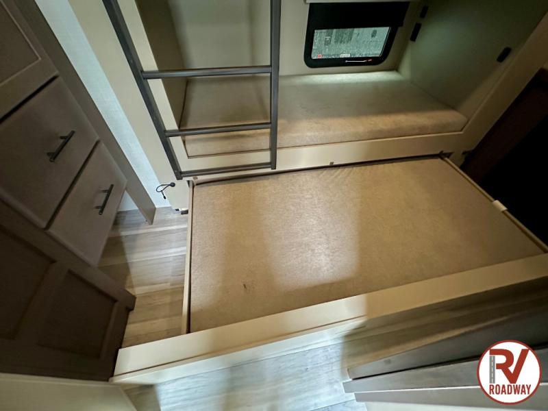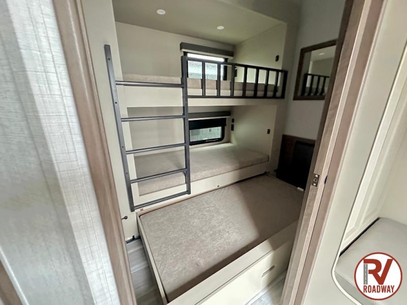 The whole crew will love camping trips in this spacious fifth wheel! From the front bedroom with a walk-around king bed to the rear kitchen with ample counter space, this is something for everyone. A middle bunkroom includes built-in bunk beds with a lower trundle bed and a flip-up table if some work needs done. Once your meals are made, you can dine at the booth dinette, relax on the sofa, or head outdoors to enjoy the power awnings. The full bath is towards the front near the bedroom for convenience. Here, you'll find a king bed, dual nightstands, plus a wardrobe with washer and dryer prep if you choose to add these appliances!