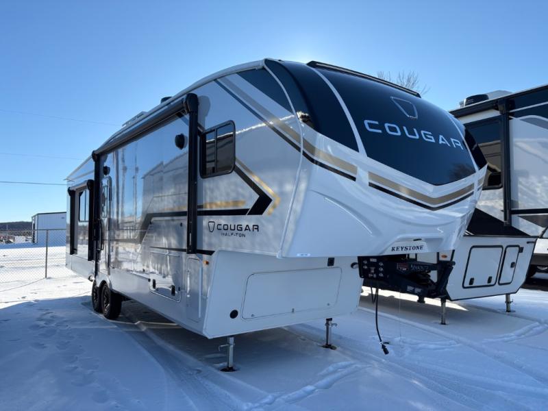 The Keystone Cougar Half-Ton fifth wheel and travel trailers are known as one of America's favorites for a reason! Some of those reasons are the exclusive features that come from Keystone, like the Winegard Air 360+ omni-directional rooftop antenna, the in-floor heating ducts, and the HyperCore composite wall construction with Vixen Fibrogloss high-gloss finish. The Cougar Half-Ton has a Climate Guard protection package with heat-deflecting white sidewalls, two roof attic vents, PEX plumbing and more to enjoy four season camping. Inside, you'll love the dimmable lighting, night roller shades throughout, shower skylight, and bedside USB outlets to keep your electronics charged.