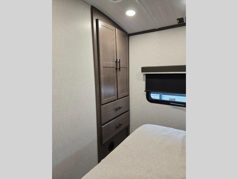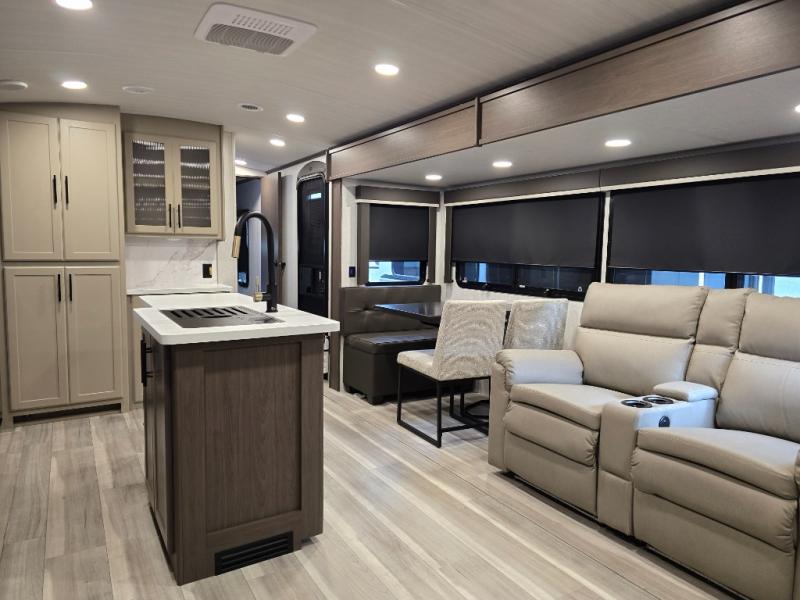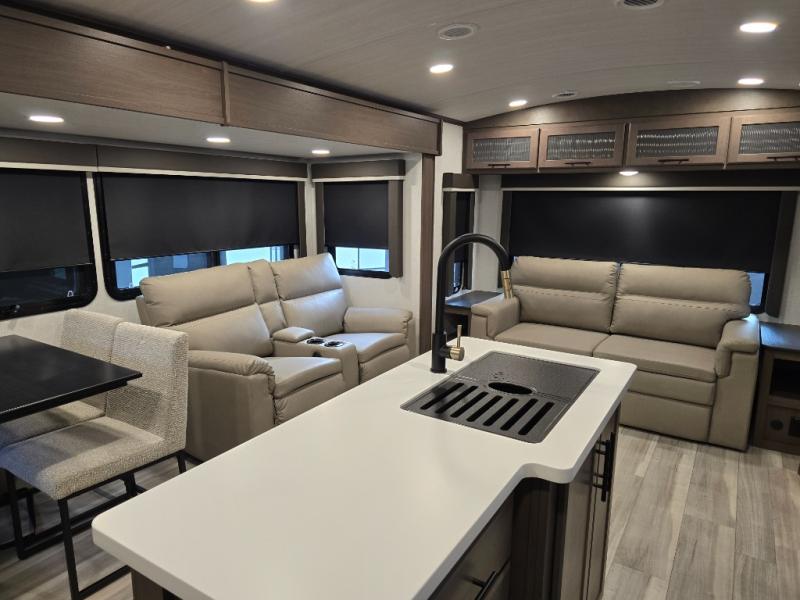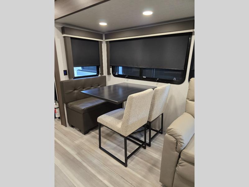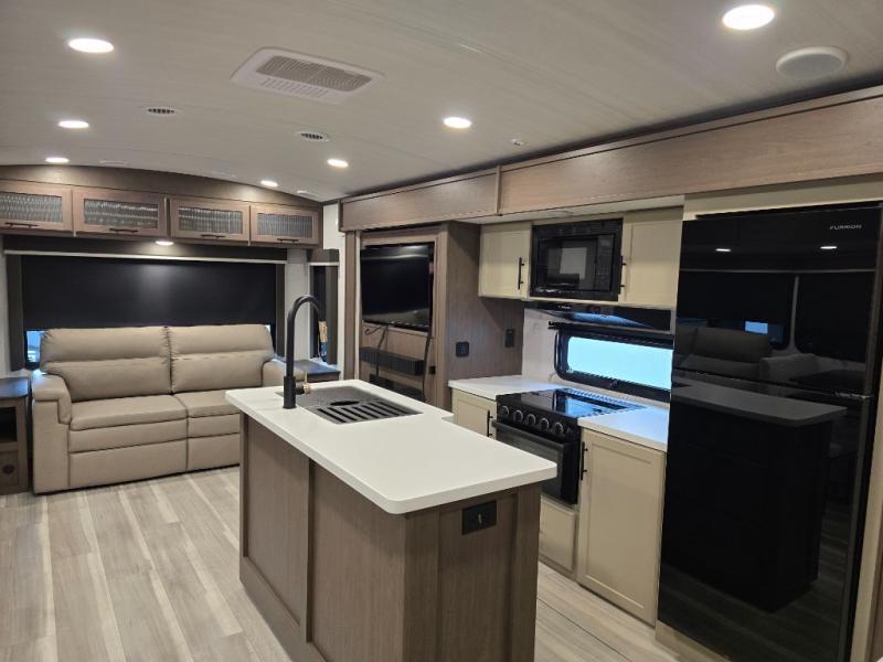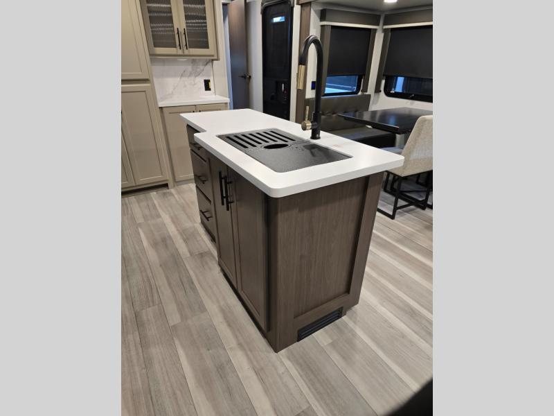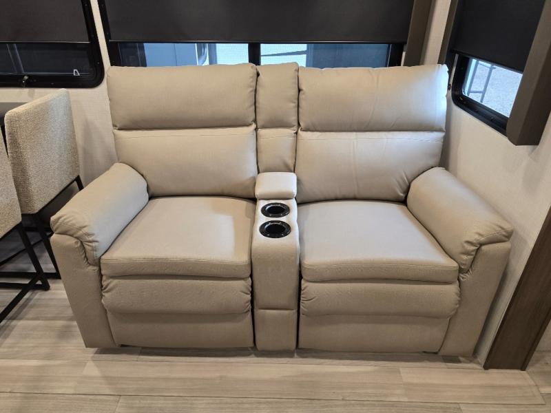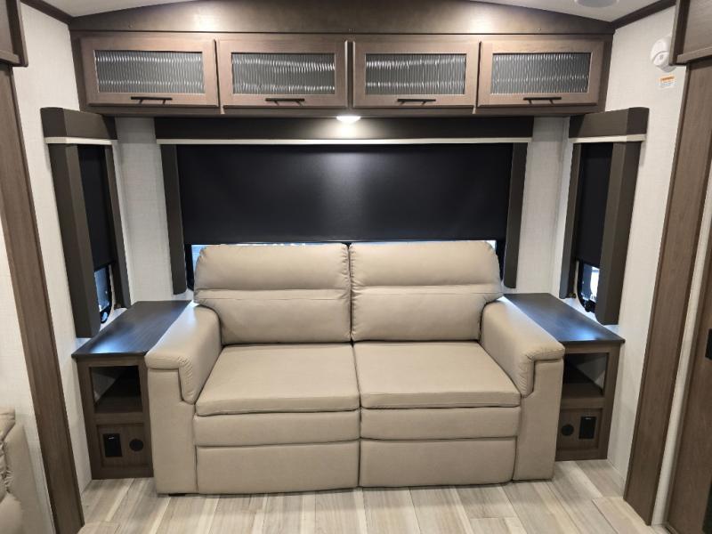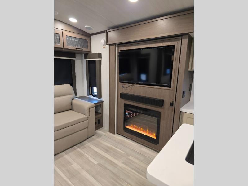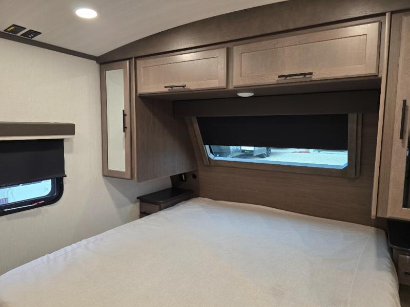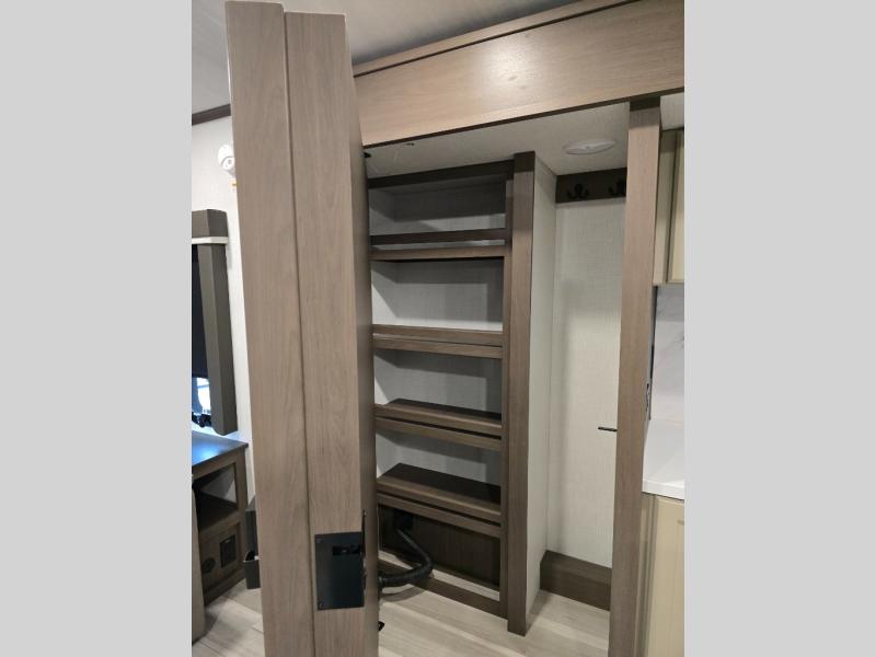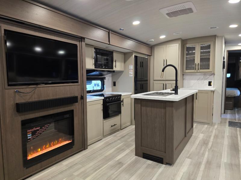 Trips spent in this travel trailer are sure to bring memories! The dual opposing slides in the combined kitchen and living area provide your crew with plenty of space to relax on the theater seating, dine at the dinette table, and prep meals with the kitchen island. There is also a tri-fold sleeper sofa here for guests and a pivoting entertainment center with a hidden pantry to keep snacks stocked. And a second pantry and hutch provides even more storage! You'll love having your own private bedroom up front, complete with a king bed, dual bedside drawers and nightstands and additional storage drawers to keep your space tidy. Outside, you'll find two power awnings, a 2" accessory hitch, and a drop frame pass-thru storage for fishing poles, hiking gear, and more!