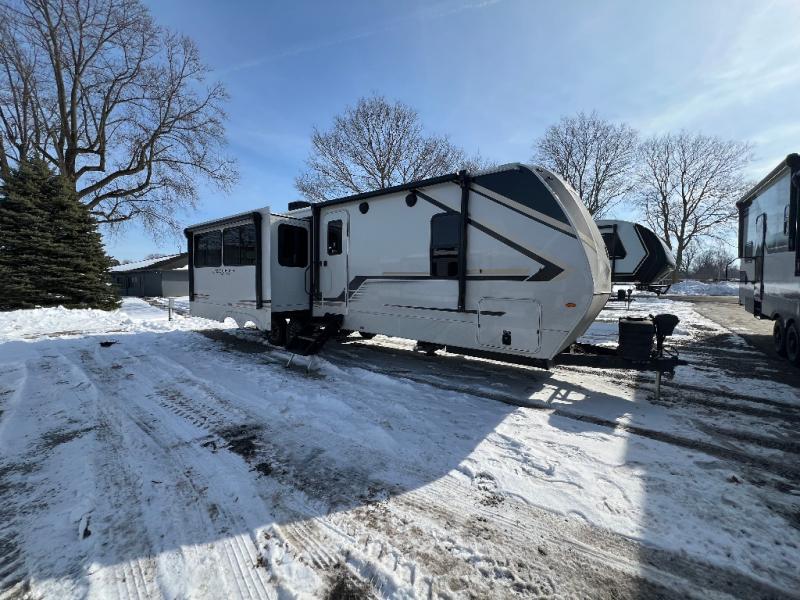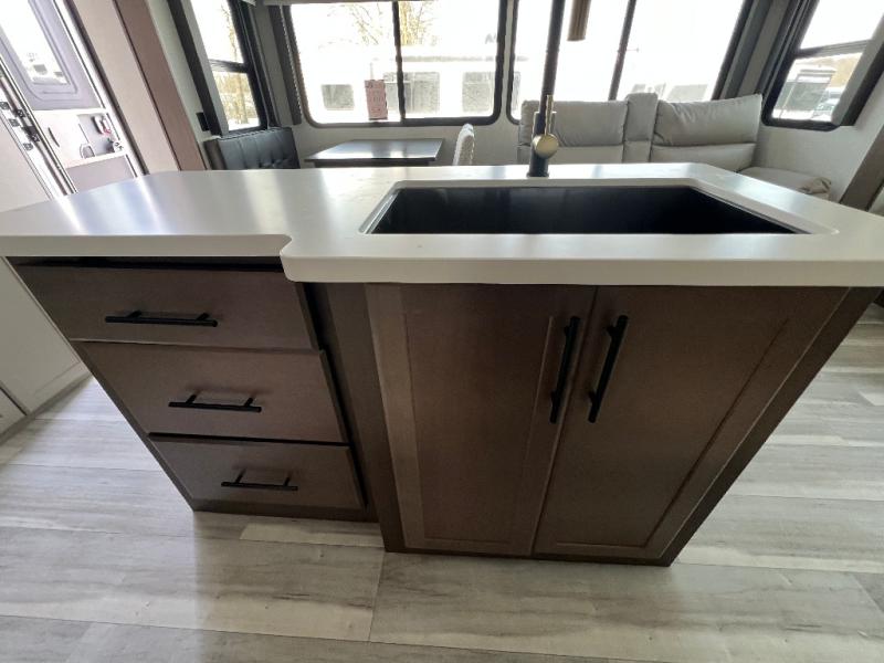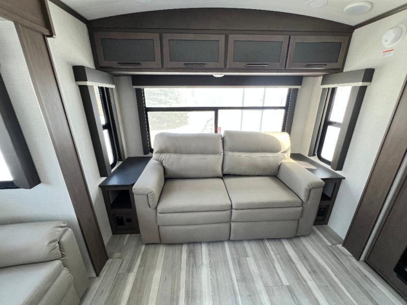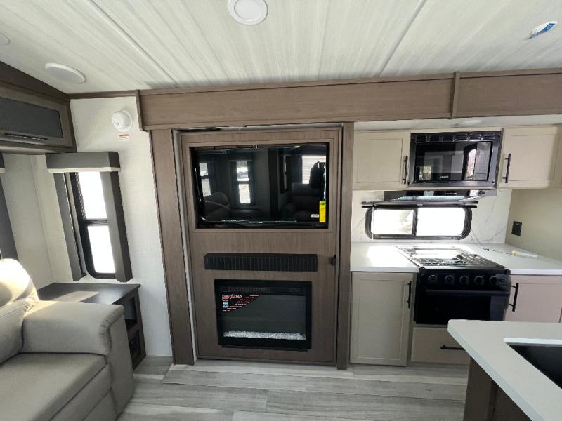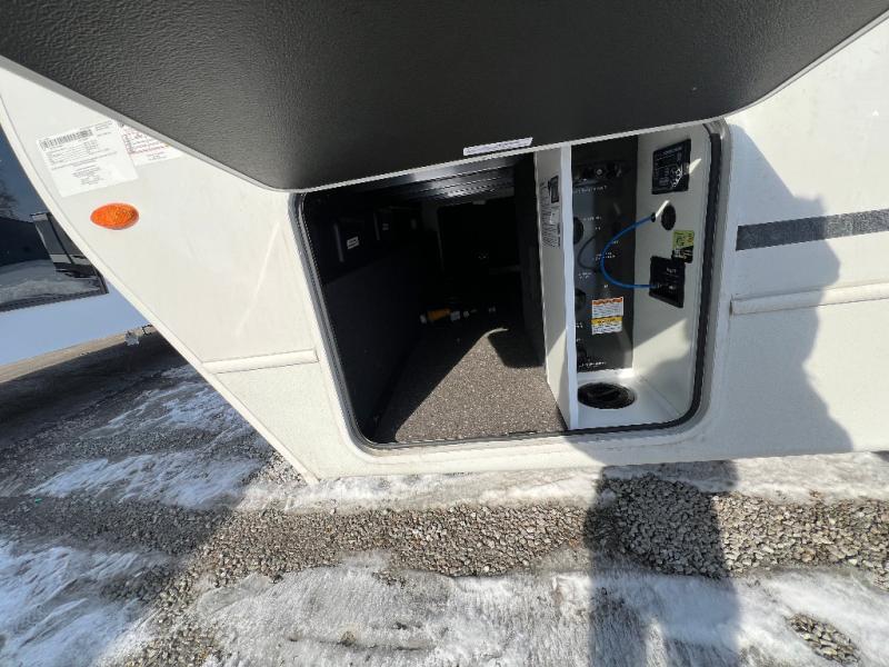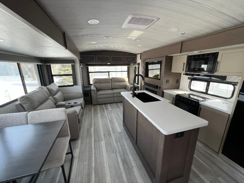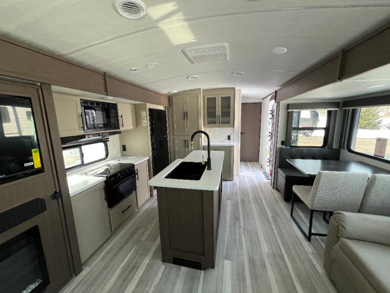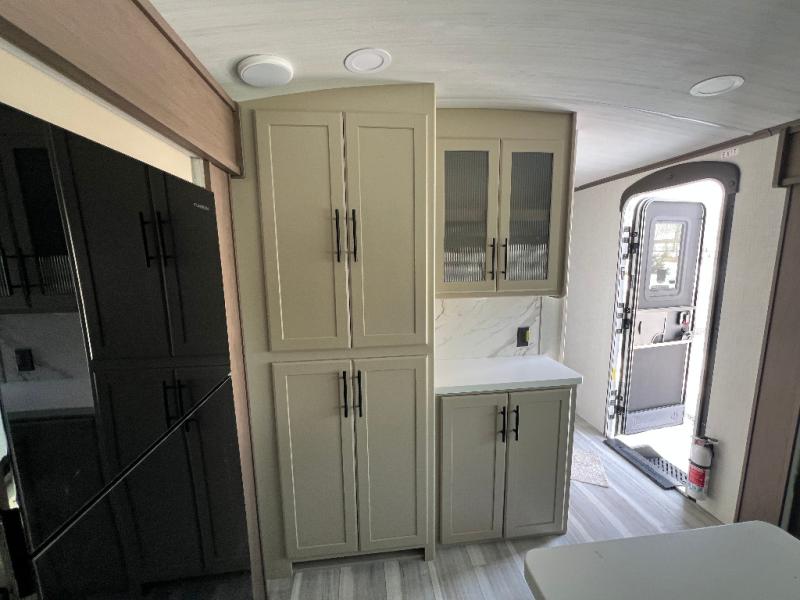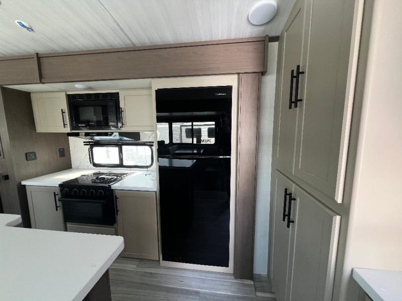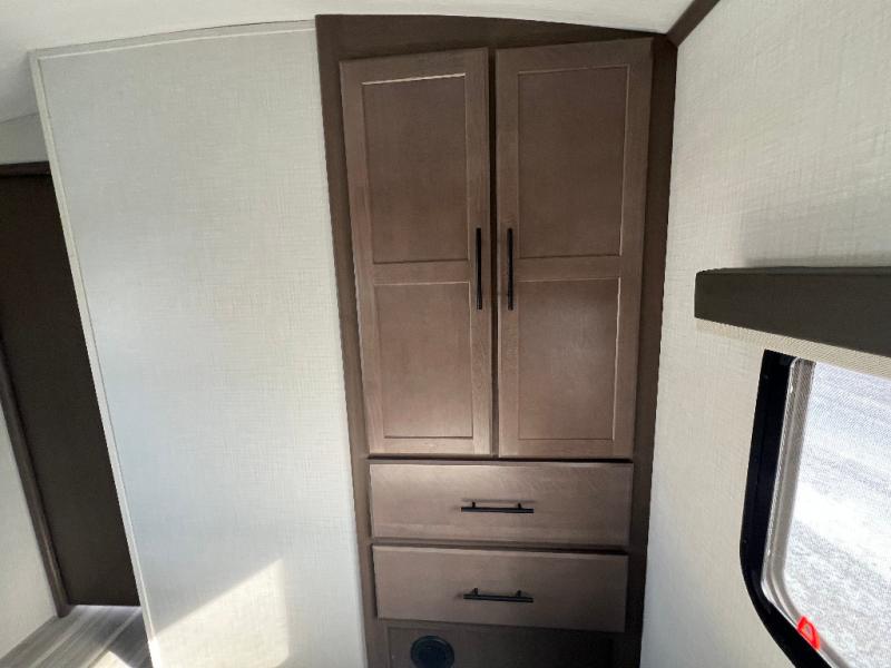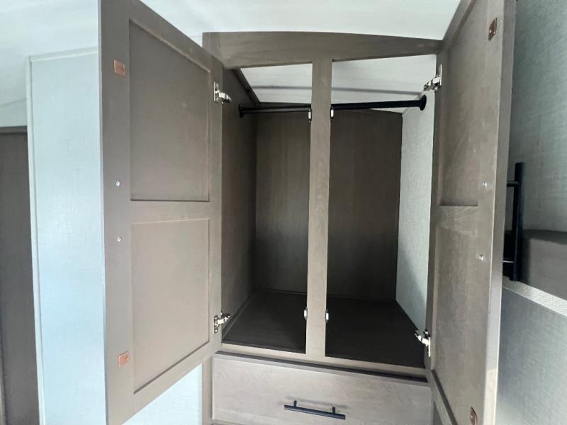 Trips spent in this travel trailer are sure to bring memories! The dual opposing slides in the combined kitchen and living area provide your crew with plenty of space to relax on the theater seating, dine at the dinette table, and prep meals with the kitchen island. There is also a tri-fold sleeper sofa here for guests and a pivoting entertainment center with a hidden pantry to keep snacks stocked. And a second pantry and hutch provides even more storage! You'll love having your own private bedroom up front, complete with a king bed, dual bedside drawers and nightstands and additional storage drawers to keep your space tidy. Outside, you'll find two power awnings, a 2" accessory hitch, and a drop frame pass-thru storage for fishing poles, hiking gear, and more!