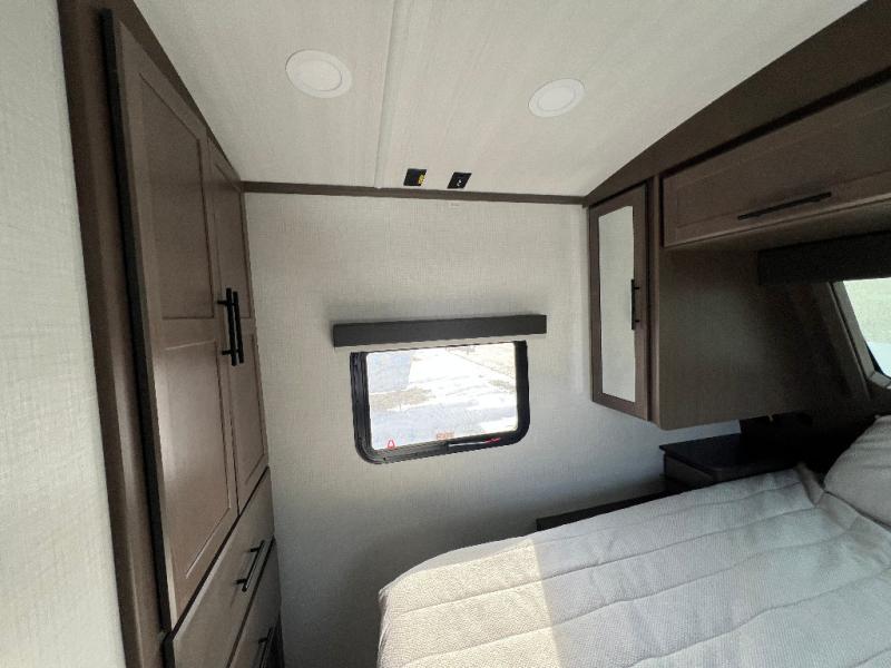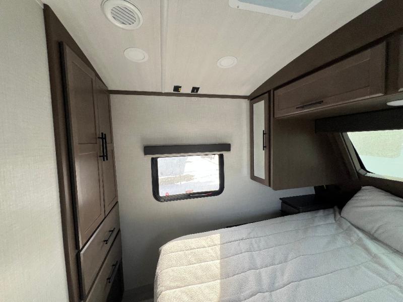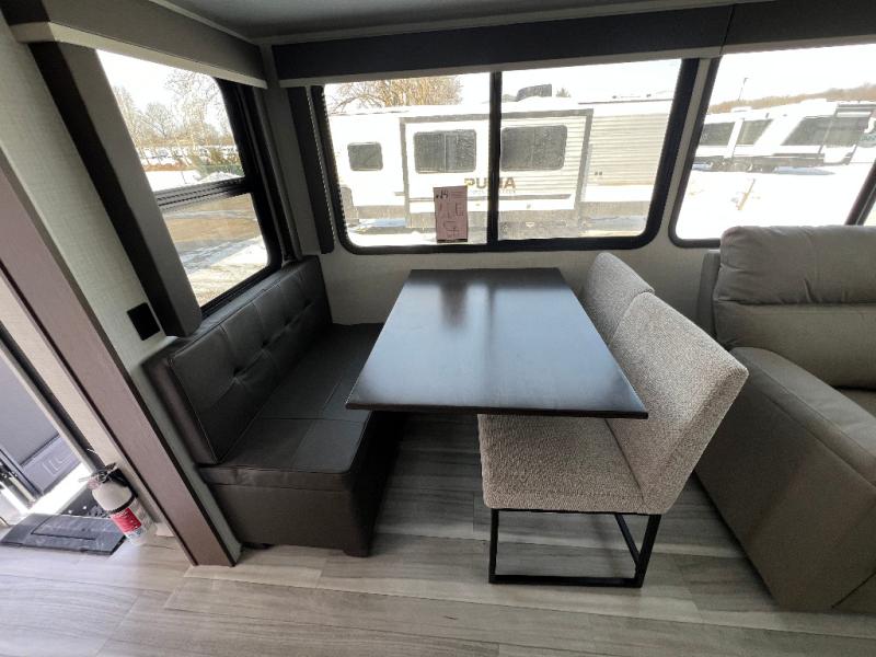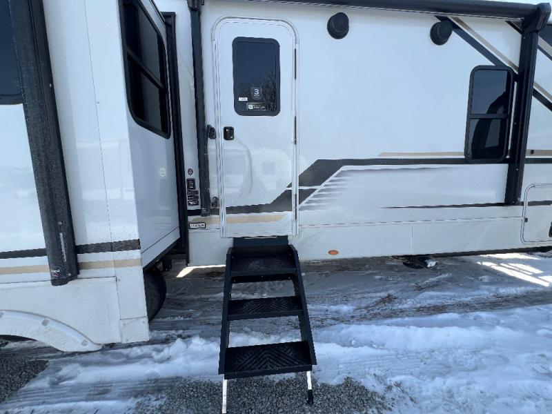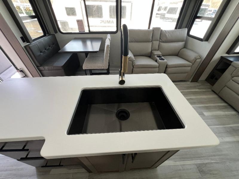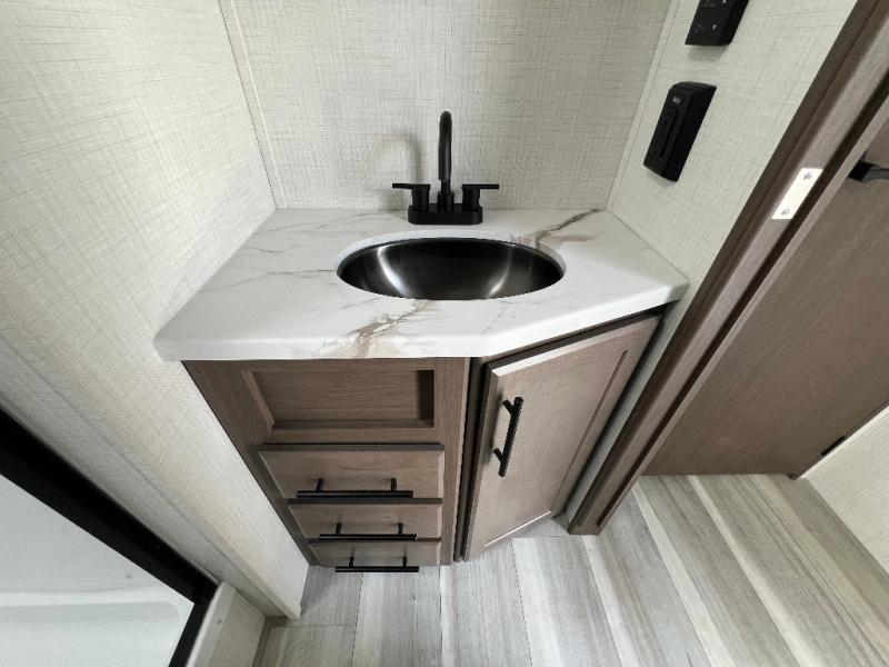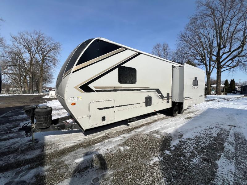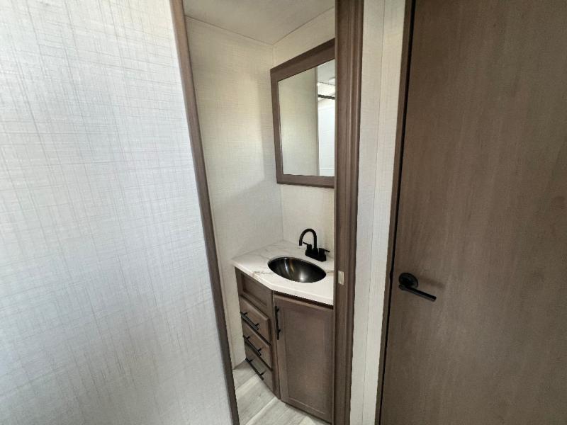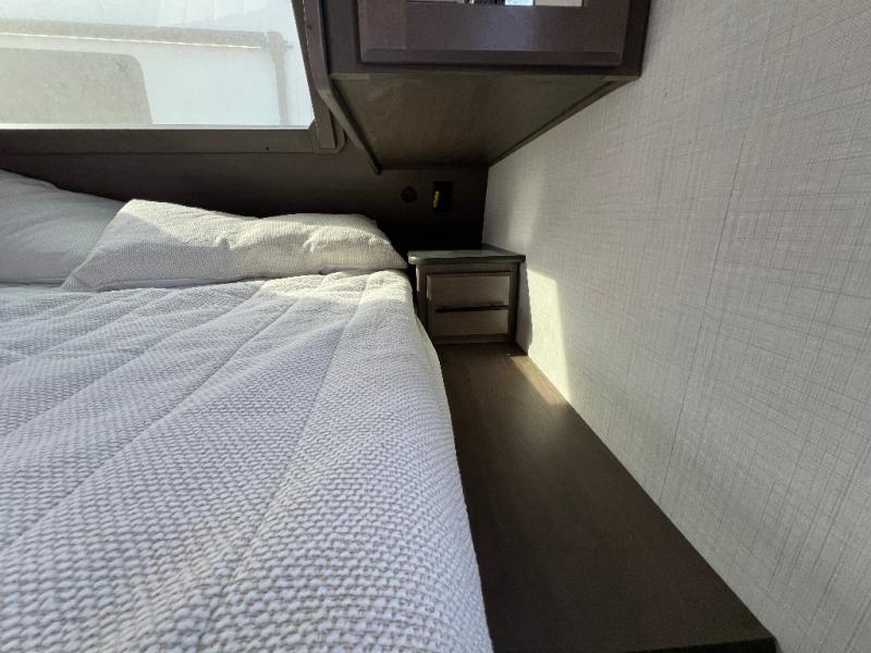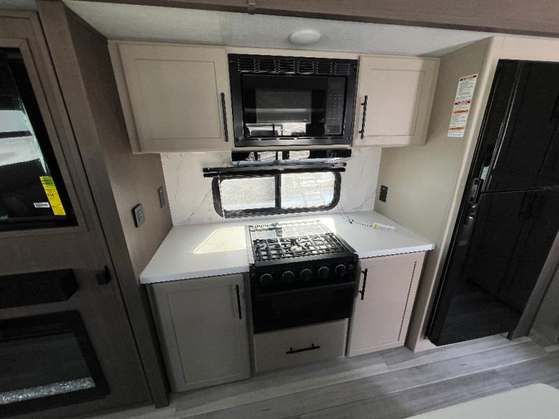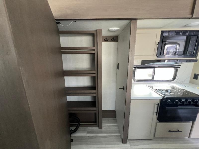 Trips spent in this travel trailer are sure to bring memories! The dual opposing slides in the combined kitchen and living area provide your crew with plenty of space to relax on the theater seating, dine at the dinette table, and prep meals with the kitchen island. There is also a tri-fold sleeper sofa here for guests and a pivoting entertainment center with a hidden pantry to keep snacks stocked. And a second pantry and hutch provides even more storage! You'll love having your own private bedroom up front, complete with a king bed, dual bedside drawers and nightstands and additional storage drawers to keep your space tidy. Outside, you'll find two power awnings, a 2" accessory hitch, and a drop frame pass-thru storage for fishing poles, hiking gear, and more!