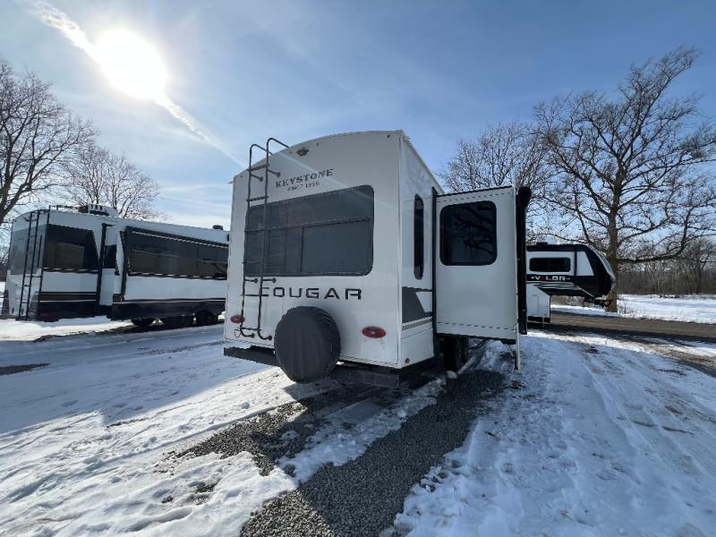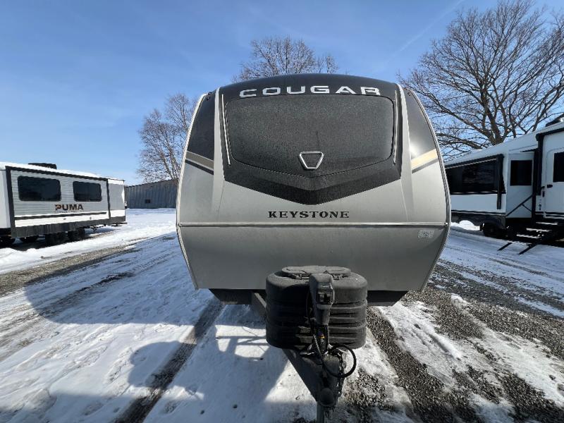 The Keystone Cougar Half-Ton fifth wheel and travel trailers are known as one of America's favorites for a reason! Some of those reasons are the exclusive features that come from Keystone, like the Winegard Air 360+ omni-directional rooftop antenna, the in-floor heating ducts, and the HyperCore composite wall construction with Vixen Fibrogloss high-gloss finish. The Cougar Half-Ton has a Climate Guard protection package with heat-deflecting white sidewalls, two roof attic vents, PEX plumbing and more to enjoy four season camping. Inside, you'll love the dimmable lighting, night roller shades throughout, shower skylight, and bedside USB outlets to keep your electronics charged.