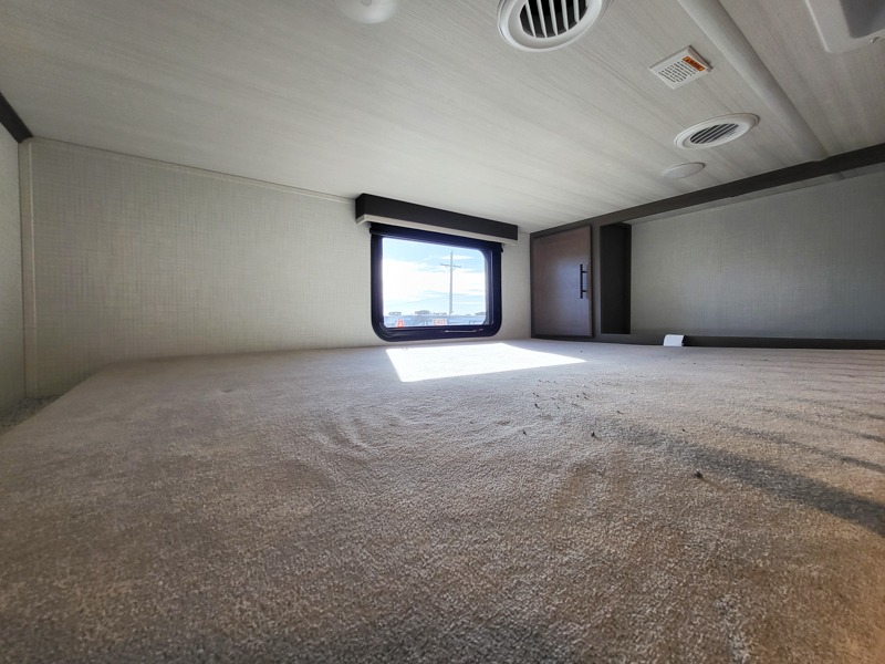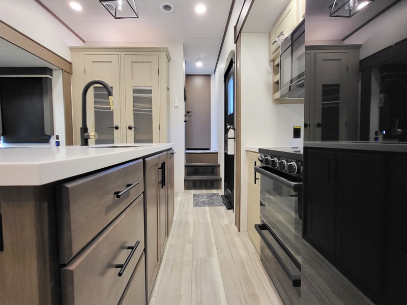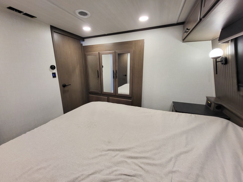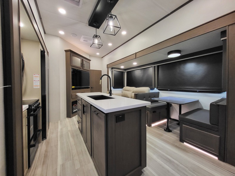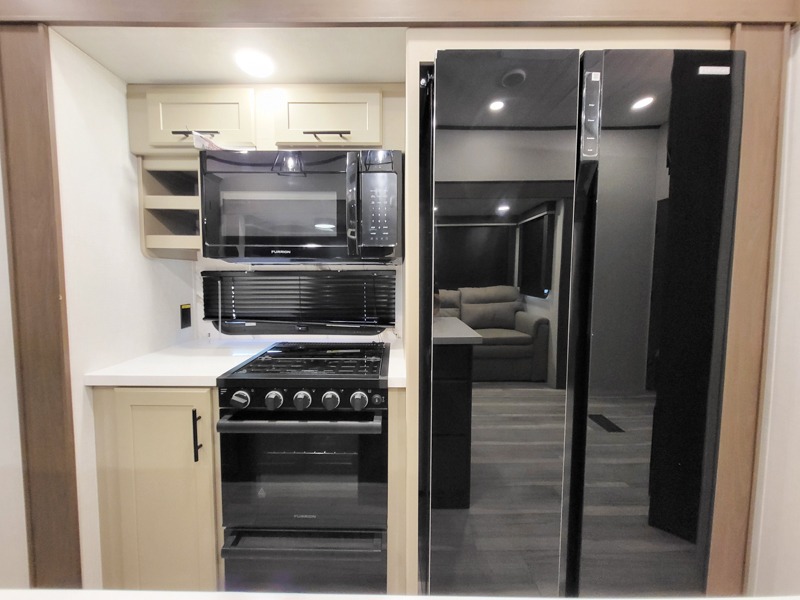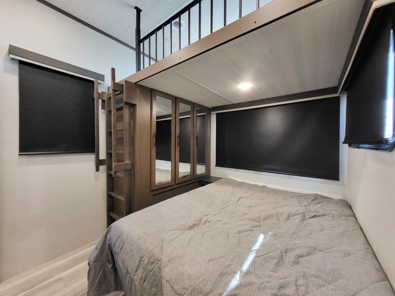You'll want to pounce on this Cougar fifth wheel because of its amazing sleeping accommodations! Not only is there a master suite up front, but there is also a bedroom suite in the back. This rear suite has a 54" x 74" bed with a 54" x 74" loft bed above it. Plus, the second exterior entry door leads into the half bathroom, so you can exit the fifth wheel from this rear bedroom too. When you do exit, you'll be right next to the outdoor kitchen prep area with a mini refrigerator, and two 12' power awnings. A 68" tri-fold sleeper sofa and booth dinette adds more sleeping space, and it also gives you a comfortable place to watch the LED HDTV at night. A kitchen island will be helpful to use while you're cooking, and the 16 cu. ft. 12V refrigerator will hold perishables for the whole week!