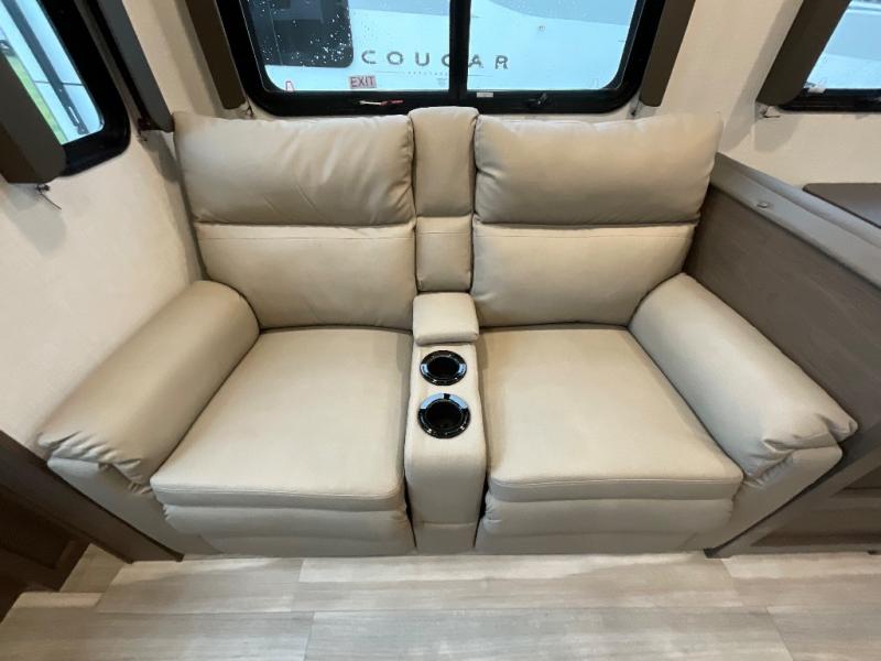 The Cougar Sport structural I-beam frame with stamped steel cross-members and outriggers, plus its AlphaPly roof membrane are what active RVers love about the construction of the Cougar line. The Cougar Sport models are no exception when it comes to a great package, as well as being smaller and lighter weight than their big brother Cougar models. A one-piece, heated and enclosed polypropylene underbelly will add protection against the elements, and the electric stabilizer jacks will provide more stability. On the inside, residential shaker style hardwood cabinet doors and decorative crown molding, plus seamless pressed countertops and an on-demand water heater will make your unit feel even more like home. You are also sure to appreciate the shiplap style decorative accent wall behind the bed, a porcelain foot flush toilet in the bathroom, plus residential kitchen hardware, and so much more.