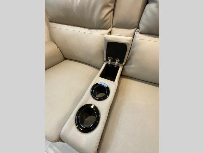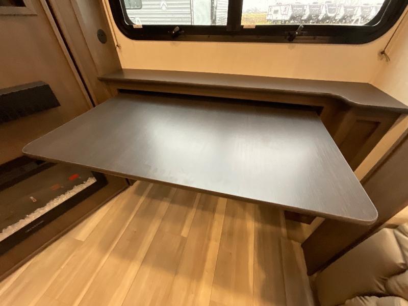 This lightweight fifth wheel is big enough for your small family to camp together! Enter to find a convenient combined kitchen and living space with large slide for added space. The slide features theater seating and a booth dinette which offers ample seating for meals and hanging out. There is a flip up table along the rear wall with a nearby 40" LED TV which features a butler pantry behind. Head up the steps to the right of the entry door to a complete bath and private front bedroom featuring a queen size bed with dual nightstands on both sides of the bed. The bathroom offers a shower with a skylight for added headroom and natural lighting. Outside, a 16' awning provides added living space protected from the elements!