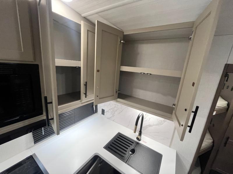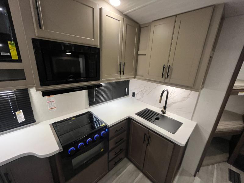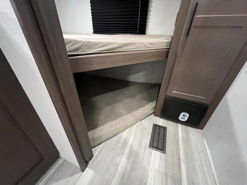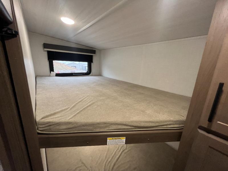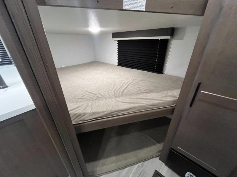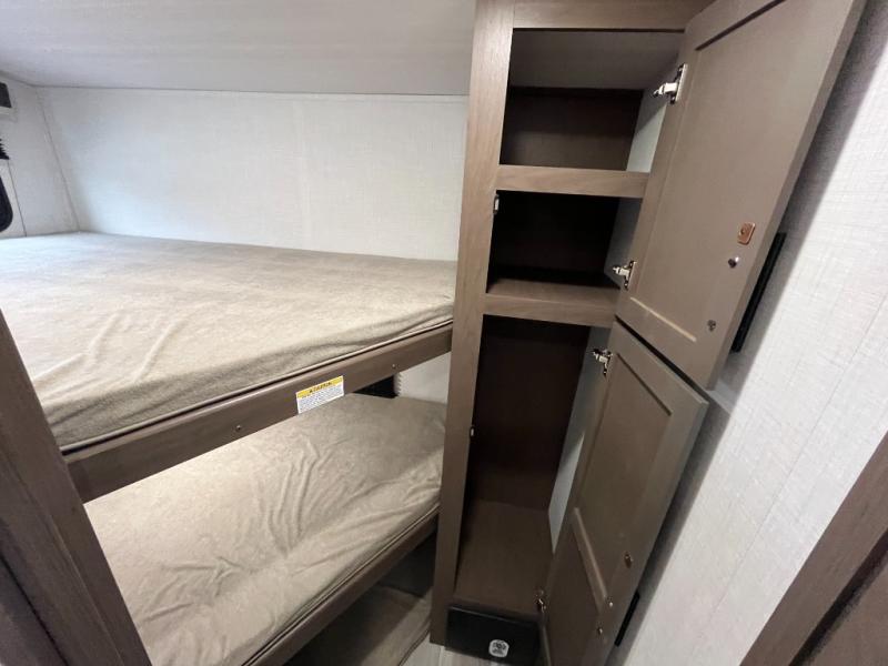 This lightweight Cougar Sport bunk model features sleeping for ten or more with triple stacked bed bunks in the rear bunkhouse, a large U-shaped dinette that can be transformed into sleep space, as well as a tri-fold sofa sleeper and a queen bed in the private bedroom up front. A fully equipped kitchen with an overhead microwave, a three burner range, and large sink plus storage will make it easy to keep everyone fed and happy. A 10.4 Cu. Ft. 12 volt refrigerator will keep all of your perishable items fresh, and there are plenty of cabinets for storing snacks and dry goods as well. Head up the steps to the bathroom featuring a shower with a skylight, sink with an overhead medicine cabinet, and toilet. The private front bedroom takes you away from the hustle and bustle of the main living area and bunkhouse to provide a relaxing retreat including a comfy queen bed, dual nightstands and a wardrobe for clothes!