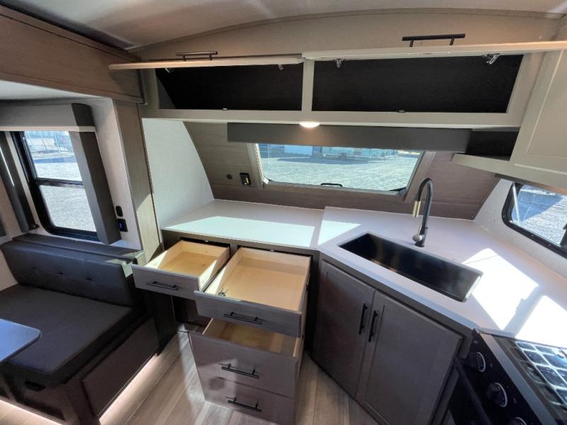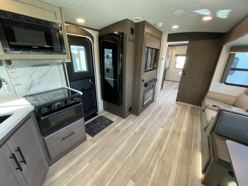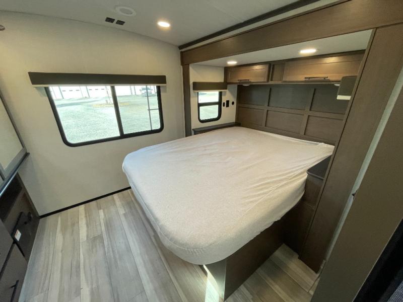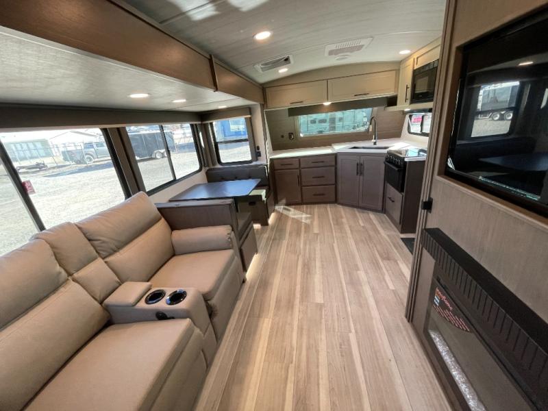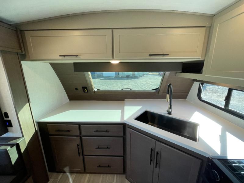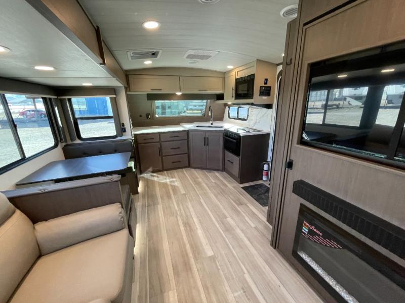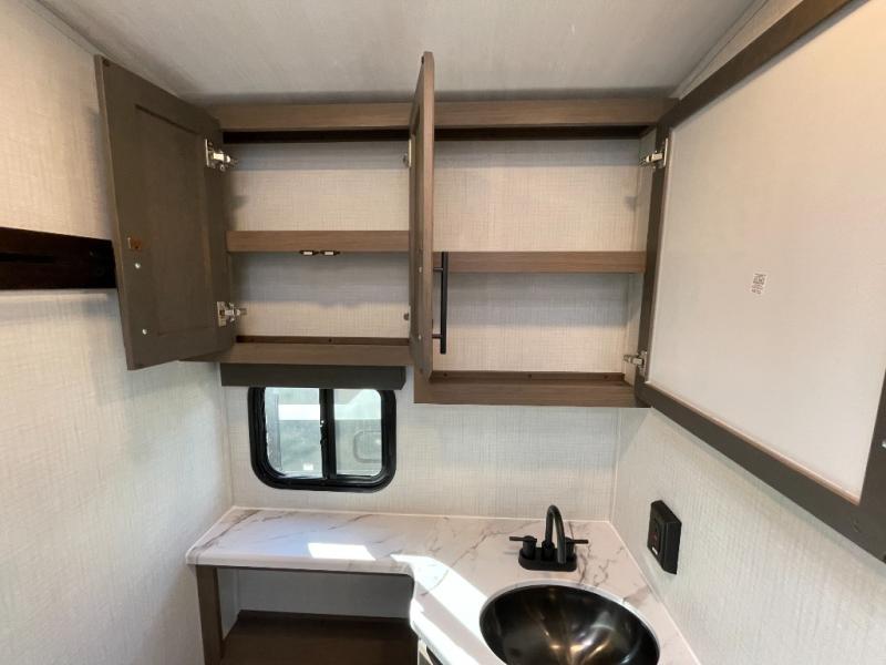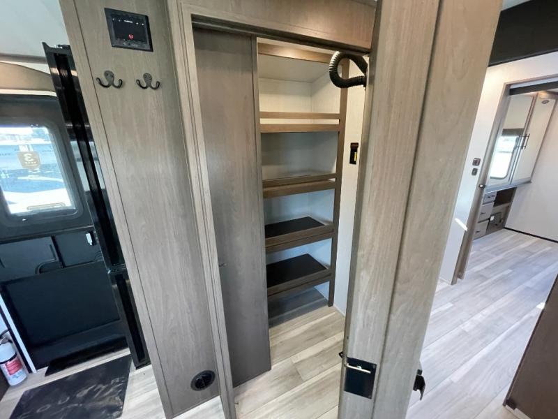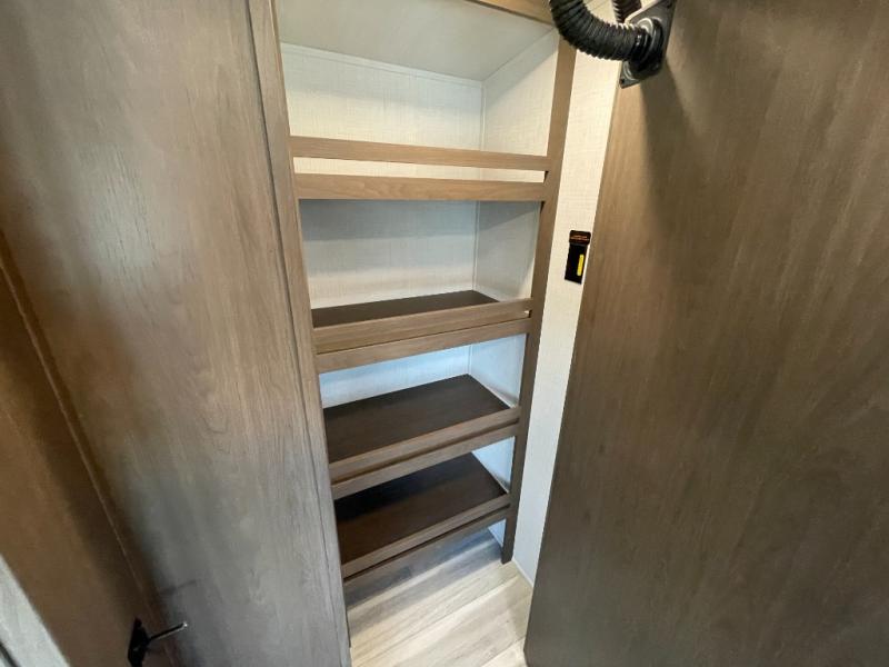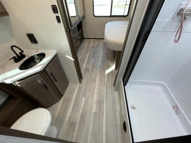 With a queen-size bed and a king bed option, this travel trailer shows that you can still be comfortable even while you're away from home! The bed slides out to provide more floor space and there is a wardrobe and dresser opposite near the private entry door. The main entry up front leads into a spacious combined kitchen and living area with the front kitchen offering plenty of counter space and overhead storage. There is a 12-volt refrigerator to the left of the entry door, and access to a walk-in pantry is right around the corner from the pivoting entertainment center opposite a tri-fold sofa sleeper and booth dinette slide. This unit also features a full-width walk-thru bath giving you plenty of room to shower and change.