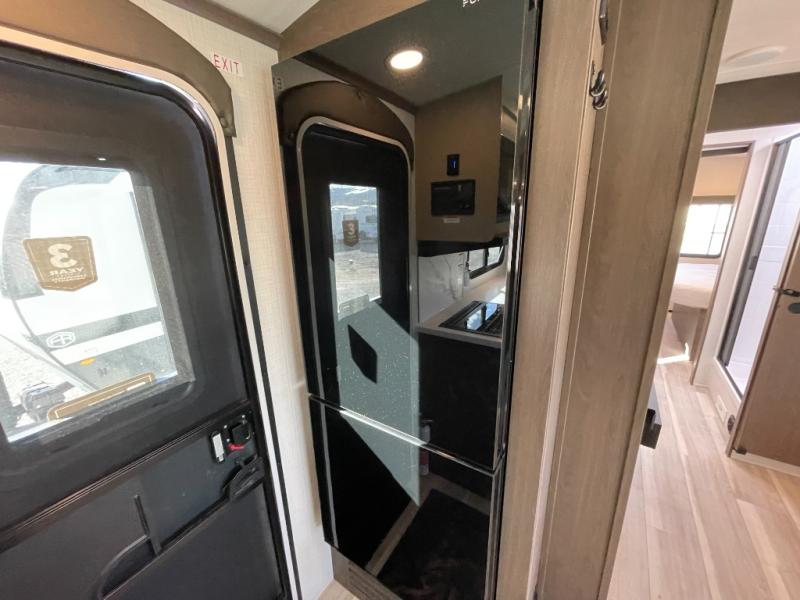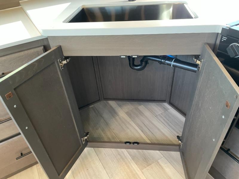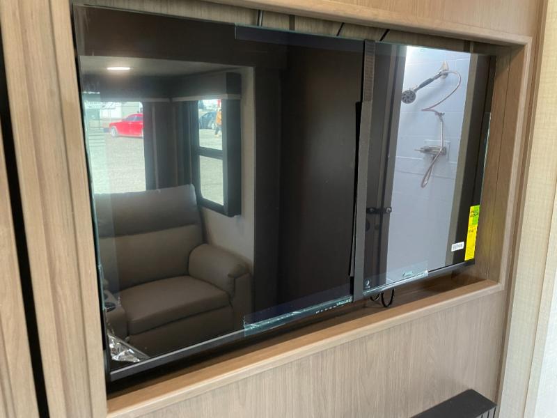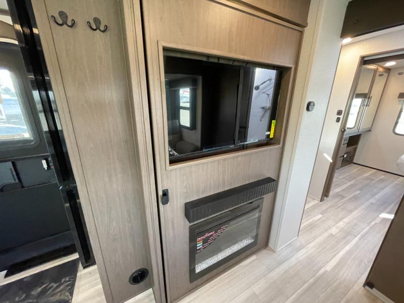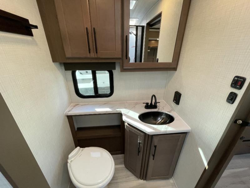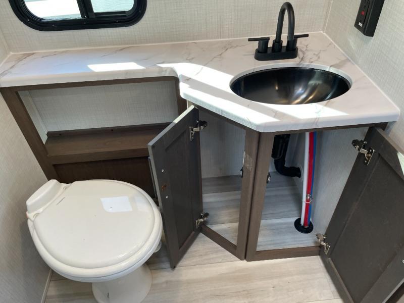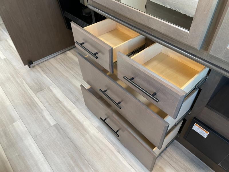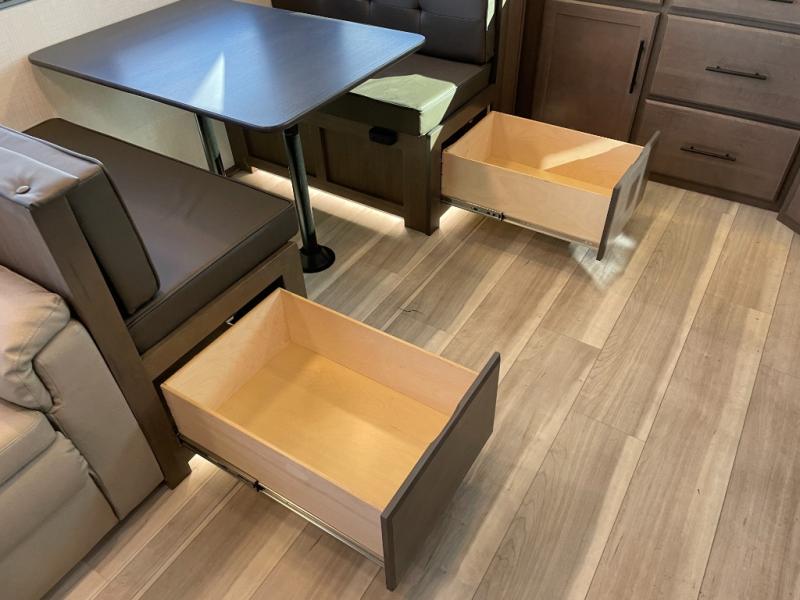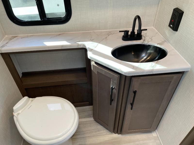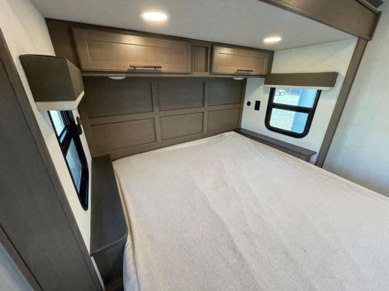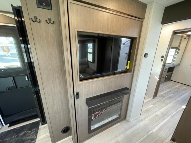 With a queen-size bed and a king bed option, this travel trailer shows that you can still be comfortable even while you're away from home! The bed slides out to provide more floor space and there is a wardrobe and dresser opposite near the private entry door. The main entry up front leads into a spacious combined kitchen and living area with the front kitchen offering plenty of counter space and overhead storage. There is a 12-volt refrigerator to the left of the entry door, and access to a walk-in pantry is right around the corner from the pivoting entertainment center opposite a tri-fold sofa sleeper and booth dinette slide. This unit also features a full-width walk-thru bath giving you plenty of room to shower and change.