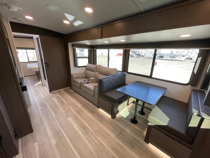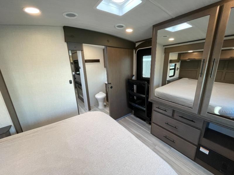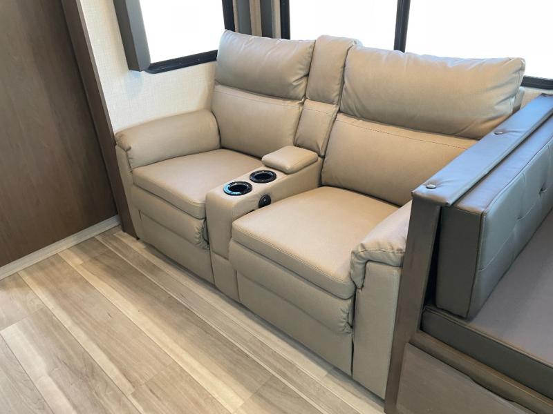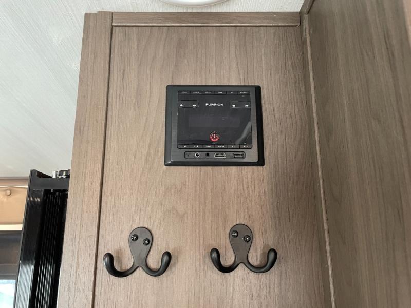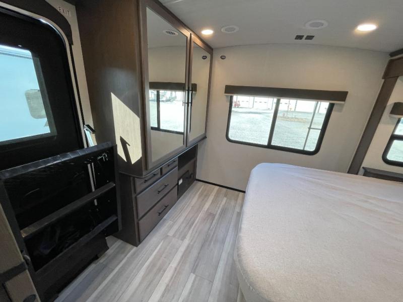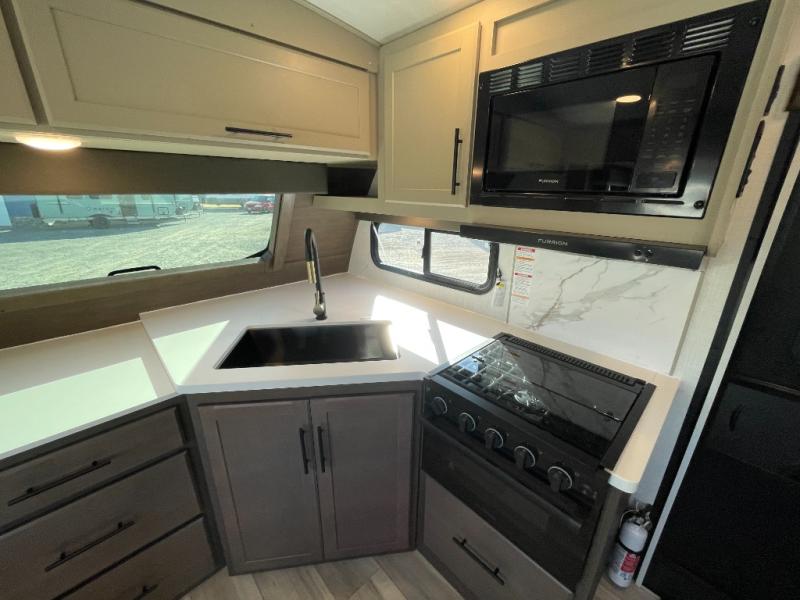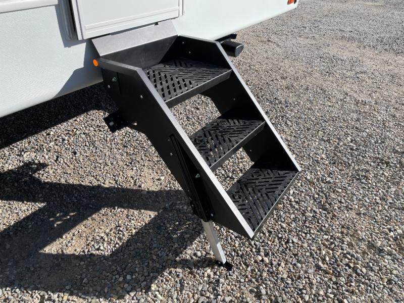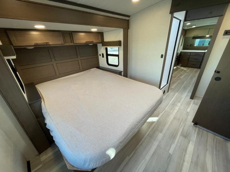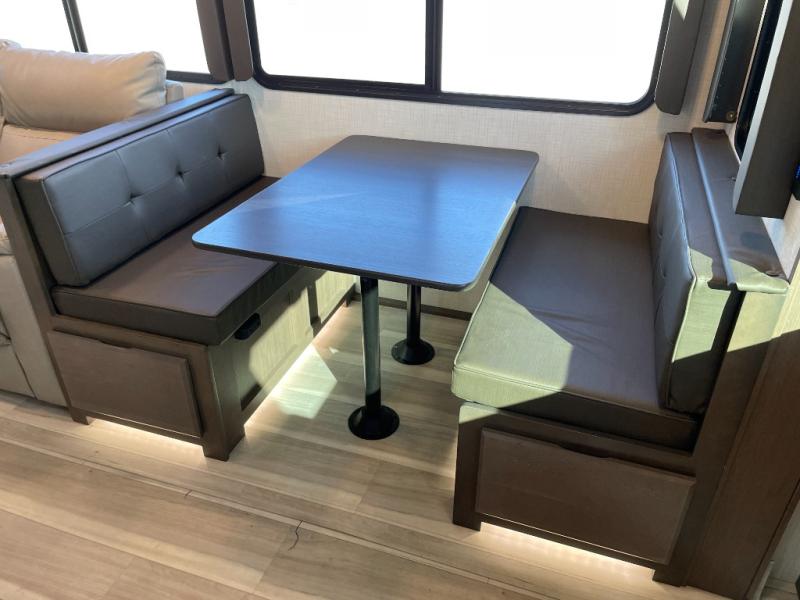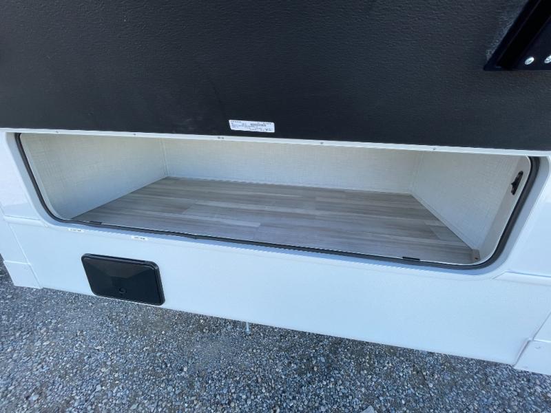 With a queen-size bed and a king bed option, this travel trailer shows that you can still be comfortable even while you're away from home! The bed slides out to provide more floor space and there is a wardrobe and dresser opposite near the private entry door. The main entry up front leads into a spacious combined kitchen and living area with the front kitchen offering plenty of counter space and overhead storage. There is a 12-volt refrigerator to the left of the entry door, and access to a walk-in pantry is right around the corner from the pivoting entertainment center opposite a tri-fold sofa sleeper and booth dinette slide. This unit also features a full-width walk-thru bath giving you plenty of room to shower and change.