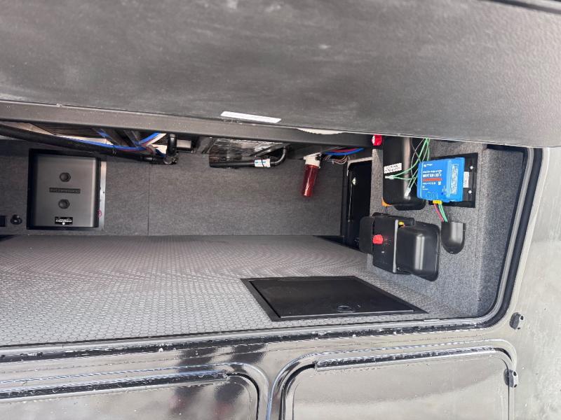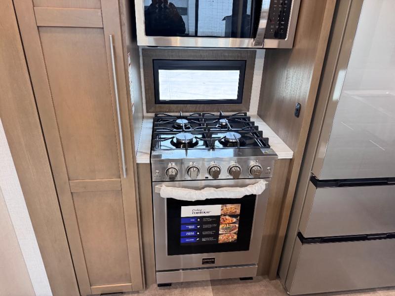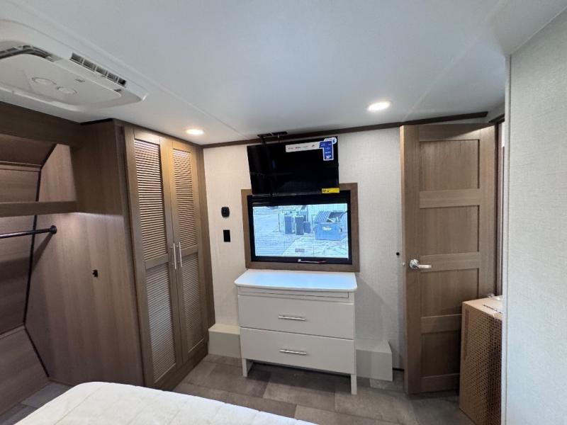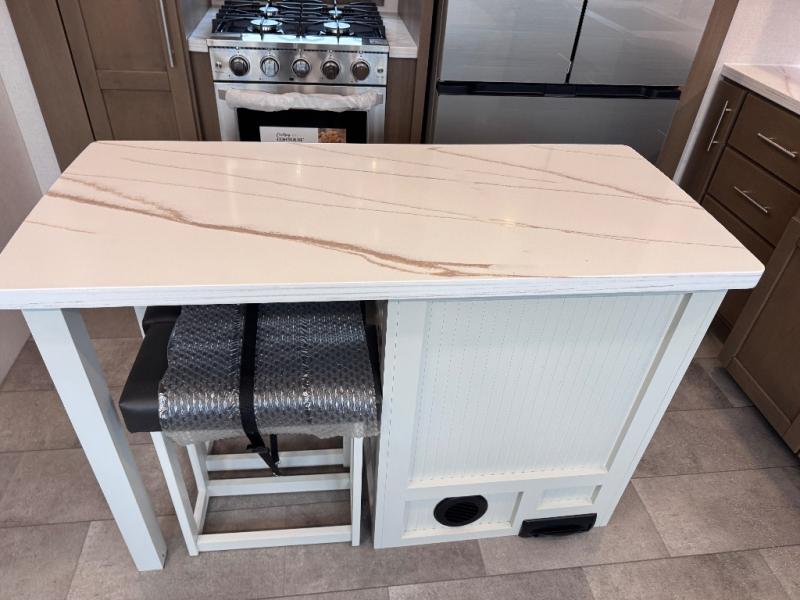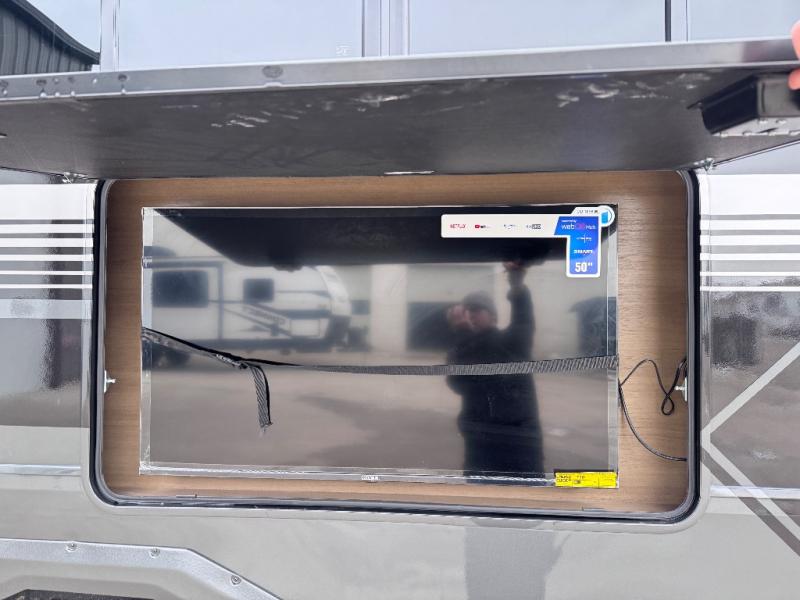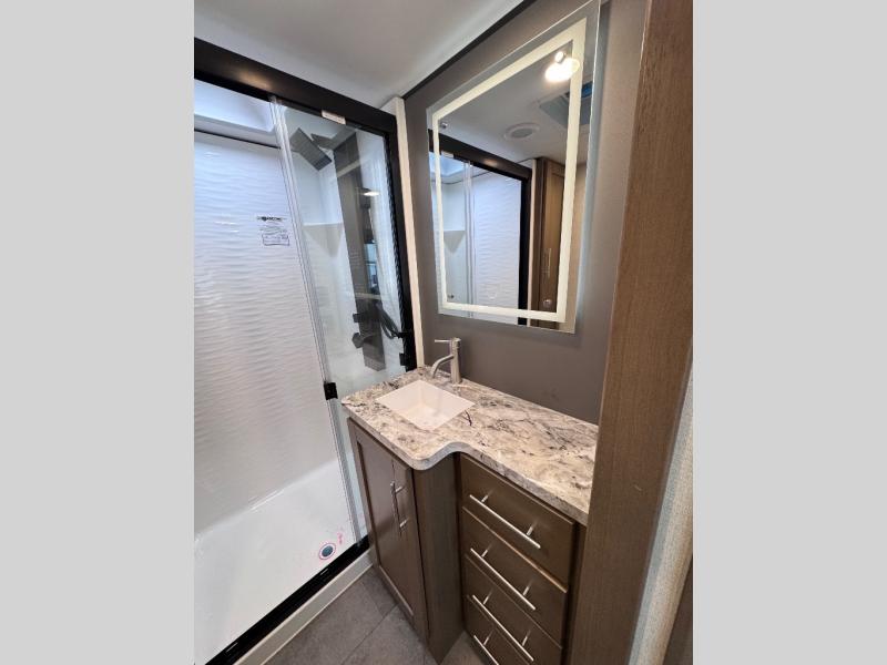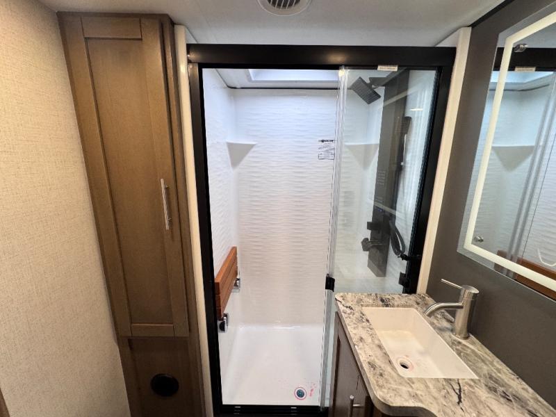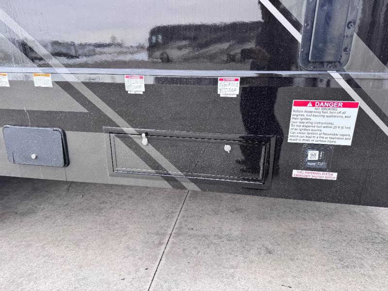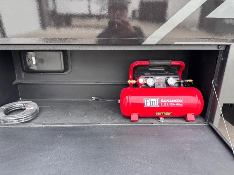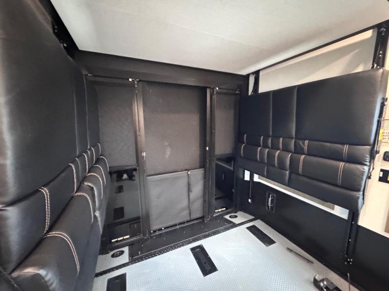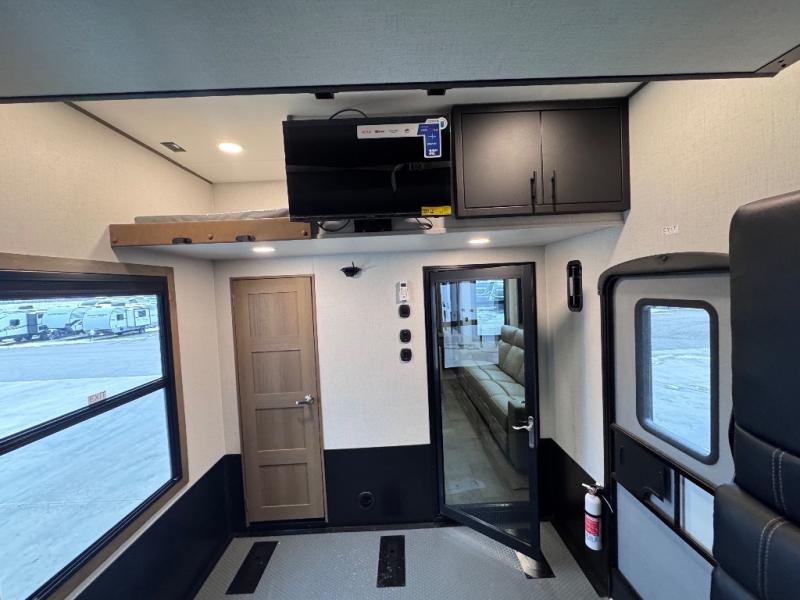 Don't leave your favorite off-road toys behind, simply load them up with the 8' LCI powered ramp door into the 11' garage area of this toy hauler! The garage area isn't just for your toys; it's for eating, sleeping, and entertaining too with dual opposing sofas with a queen bed above them, a loft with a bunk mat, an LED TV, and even a half bathroom for your convenience. The residential four person sofa slide comes with heat, massage, and 110V/USB ports for an ultimate relaxing evening across from the entertainment center. The kitchen island table has stools for you to enjoy a cup of coffee at in the mornings and the full bath has a residential shower with a seat to freshen up. You will love the front private bedroom which has a Fuzion king bed slide across from a dresser with a Smart TV and a front master closet with washer and dryer prep!