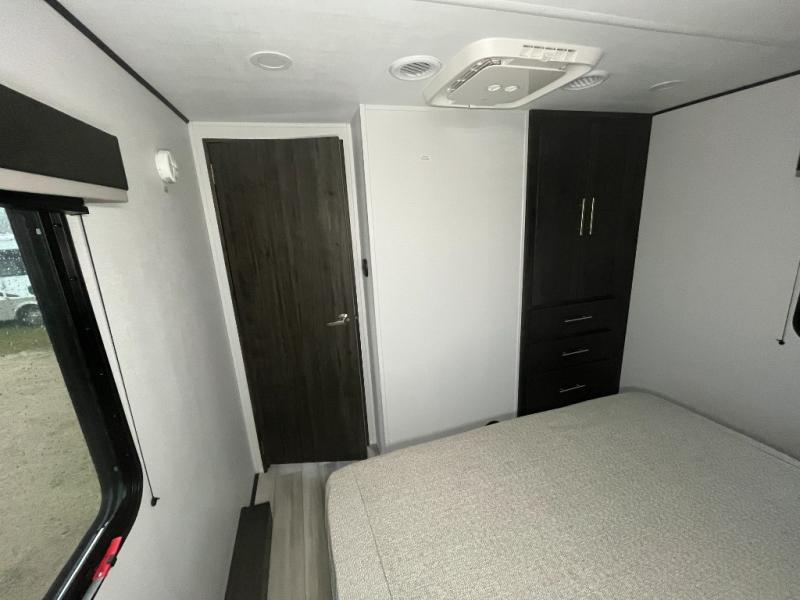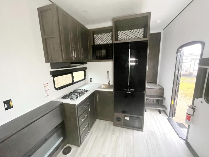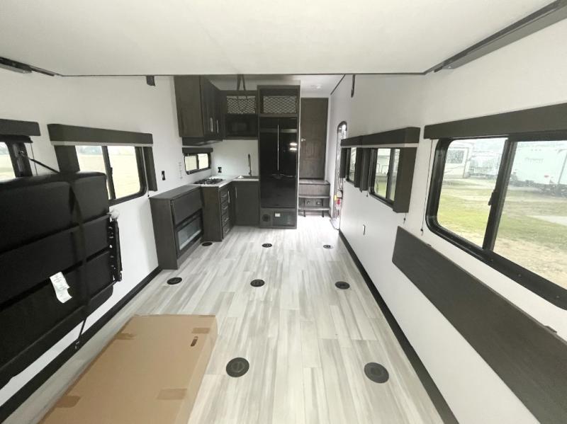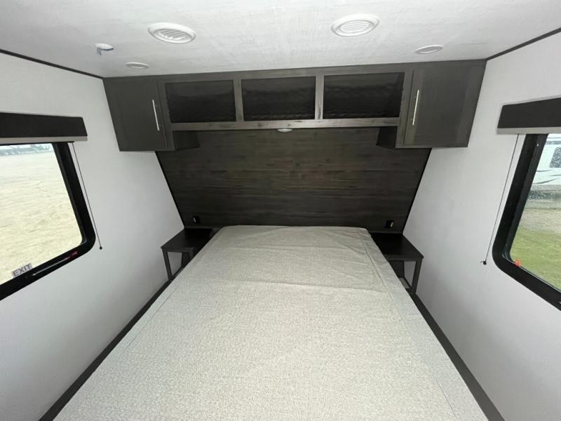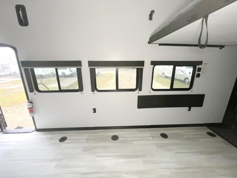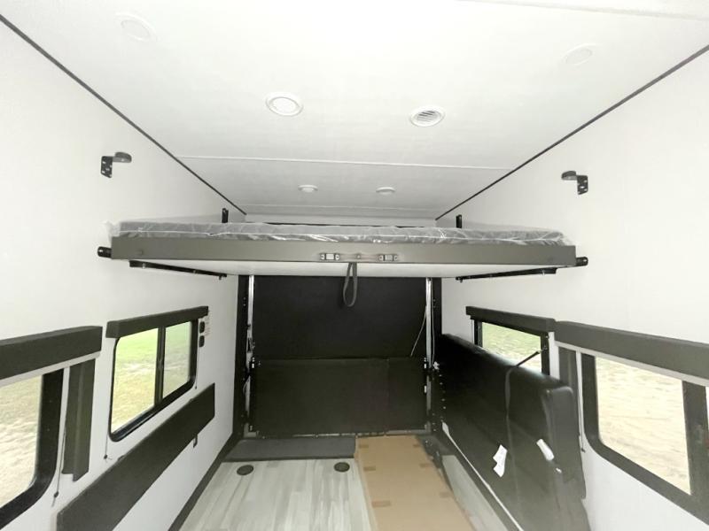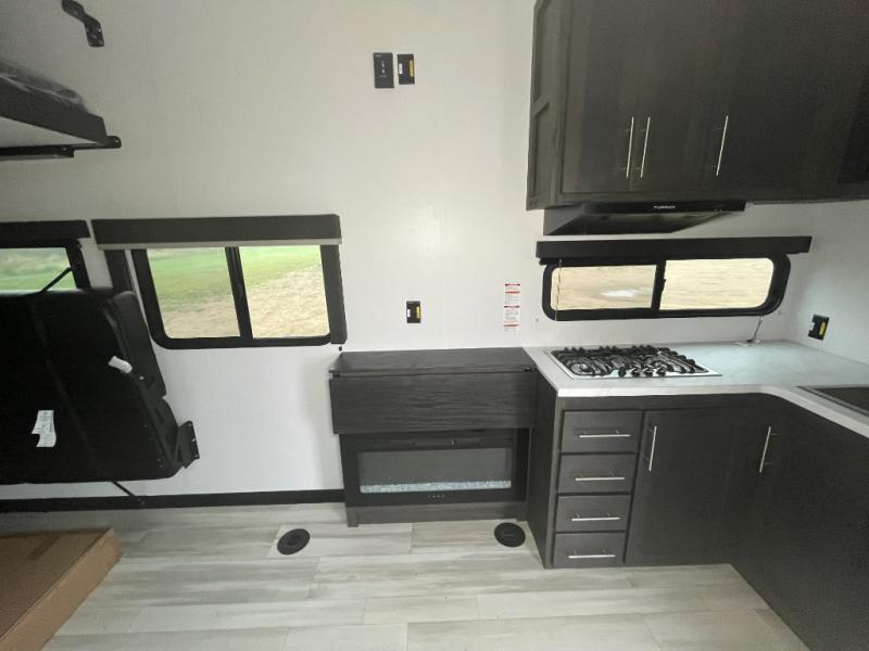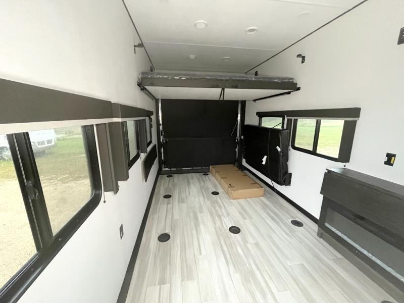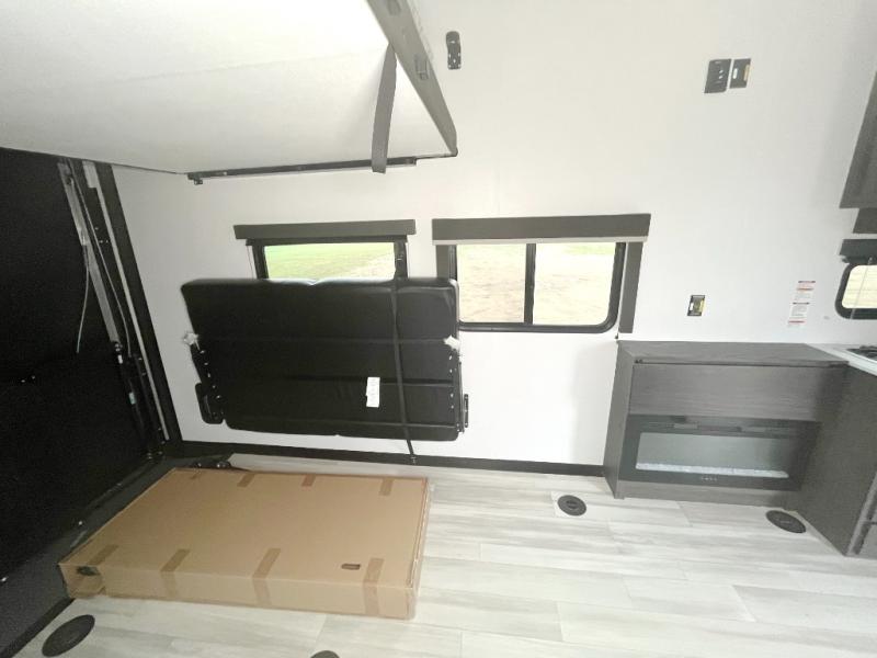 You'll love every minute camping in this spacious toy hauler! There are 5k lb. frame welded tie-downs to help keep your toys secure, and the 15' 8" garage area can easily transform to living and sleeping space. There is a sofa with a top queen bed here for guests, and a flip-up countertop with a window across the room that will be perfect to set your things on and enjoy the view. Head to the kitchen where you'll find a cooktop, a 12V refrigerator, and a second flip-up countertop with a fireplace below to make your space more cozy! The full bath towards the front will let you freshen up after a trail ride, and you're sure to appreciate having your own bedroom with a residential queen bed, dual nightstands, and a wardrobe for clothes!