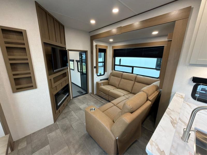 Enjoy time at the campground in this triple slide out toy hauler! The 15' separate garage includes dual opposing sofas with a top queen bed, an 8' garage door, a loft with a bunk mat, plus a half bath! The living area will be a favorite hang-out spot with its L-shaped sofa slide out in great view of the entertainment center with a fireplace. The kitchen features a U-shaped countertop, a spacious pantry and 12V refrigerator, plus a dinette with chairs to dine at. A full bath removes the need to use the camp's facilities, and the front private bedroom will feel just like home with its 60" x 74" queen bed and slide out master closet!