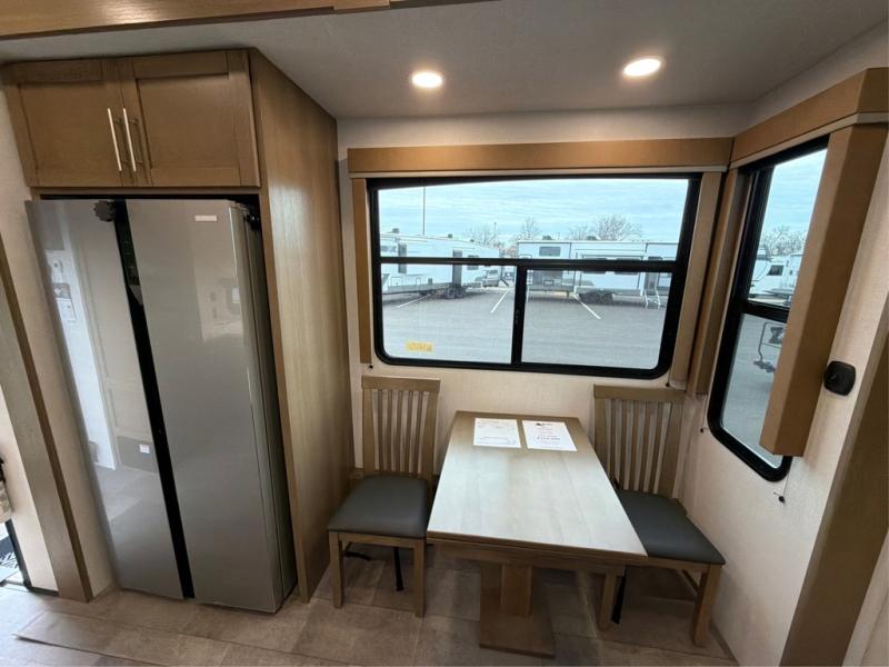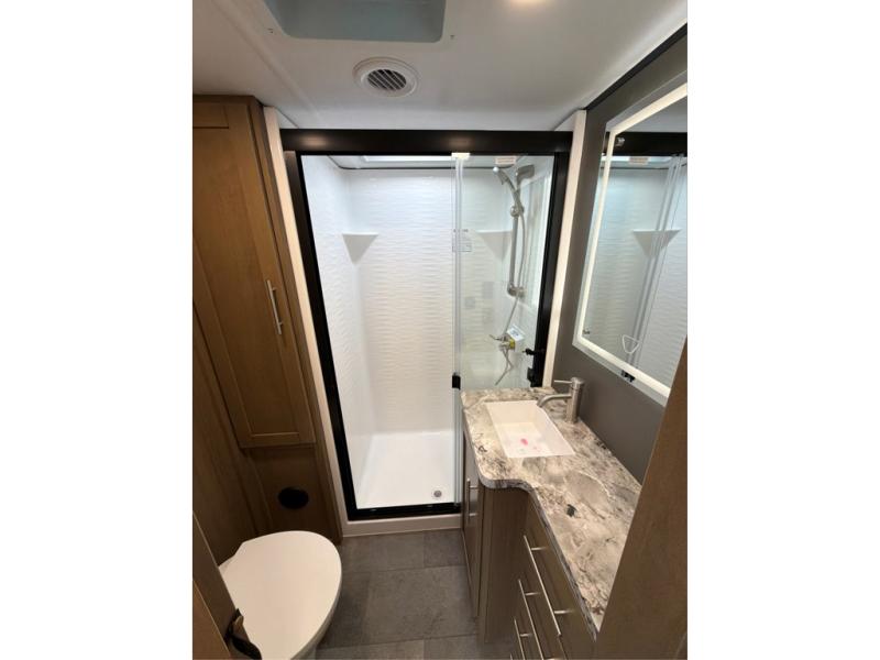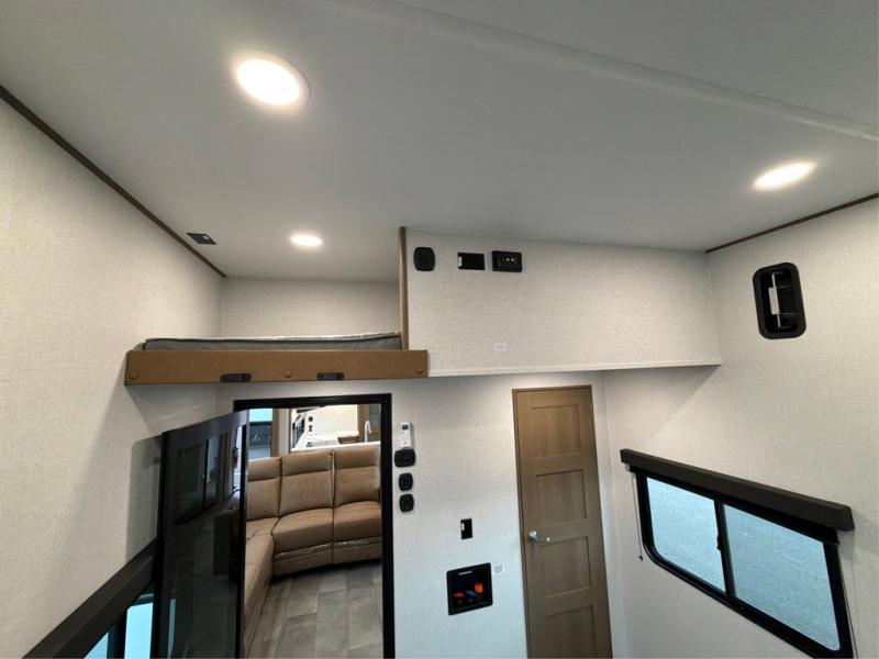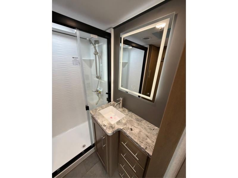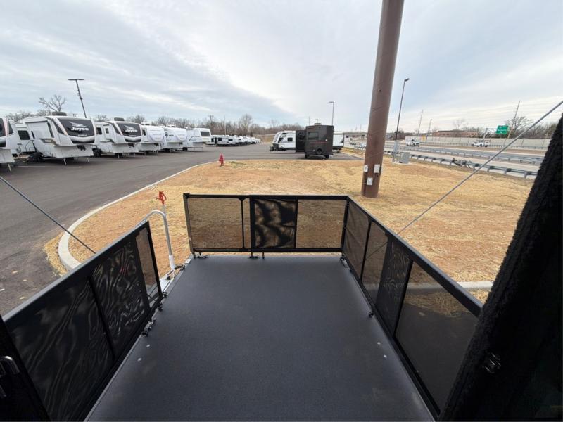 The larger shower is just the beginning - our toy haulers are designed to provide the comforts of home, so you can focus on making memories. All units feature large tinted safety glass windows, providing stunning views and added protection. The Dexter® E-Z Lube® axles ensure smooth towing and reduced maintenance, while the 5K lbs. frame welded tie-downs keep your toys secure and stable on the road. Plus, the one-touch electric awning with LED lights provides shade and ambiance, perfect for relaxing outdoors. And you can always stay connected and safe with the Furrion wireless backup camera prep, making maneuvering a breeze.