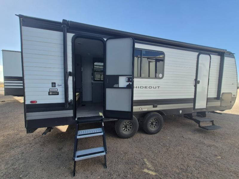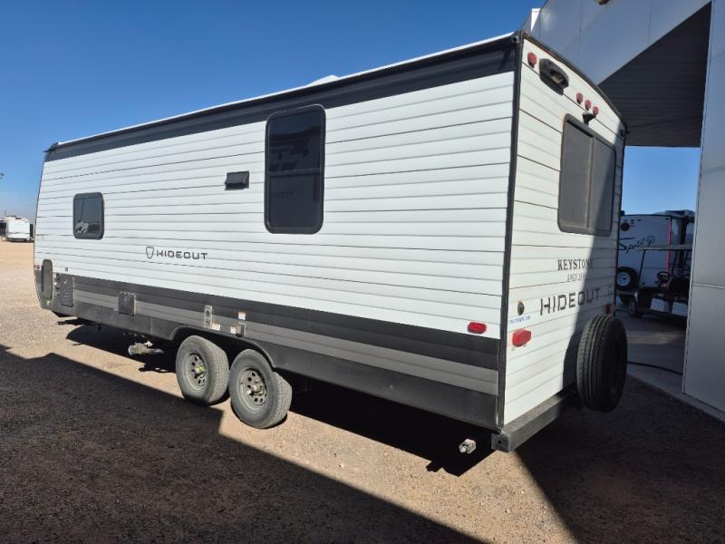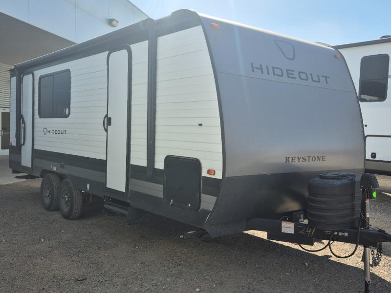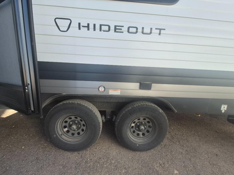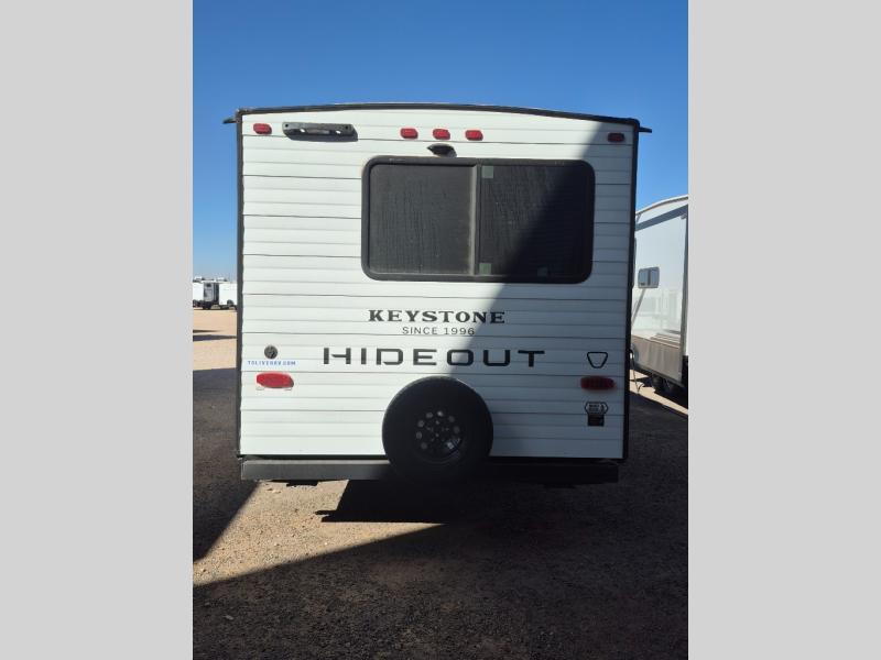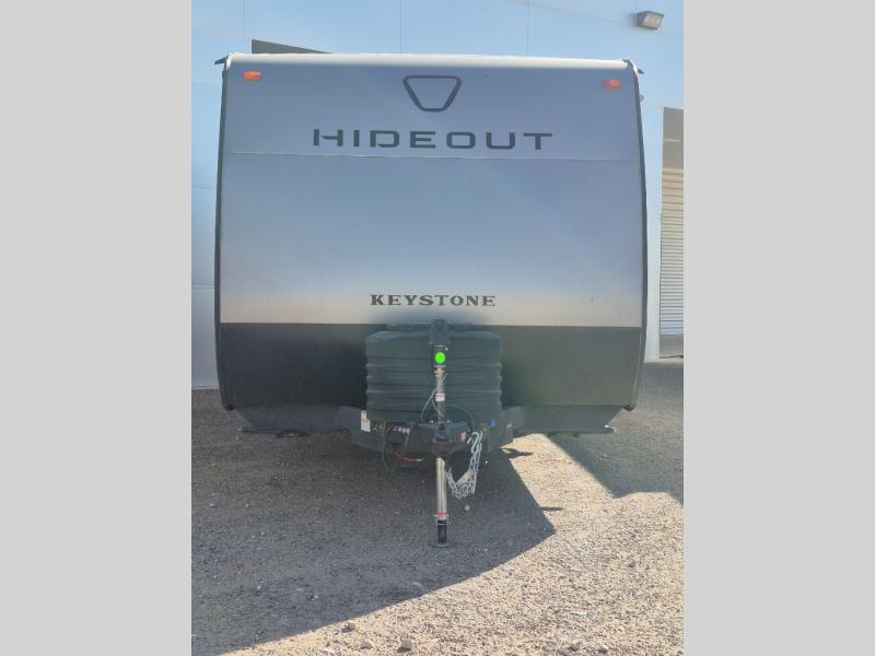 With any Hideout travel trailer by Keystone, you will find functional features and comfort at every turn! Each one is built with tinted safety glass windows and a walkable roof for added durability. There are also Solid Step entry steps outside, along with an outside shower, heavy-duty stabilizer jacks, a spare tire kit and Tire Linc TPMS prep. You'll love the pressed membrane premium countertops inside, plus a decorative tub surround, LED lighting, blackout night shades, and many more comforts. Additional features include a tankless water heater, a porcelain foot flush toilet, a power tongue jack, and an XL entry assist handle to name just a few!