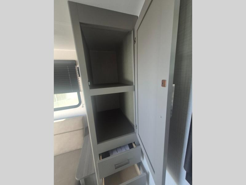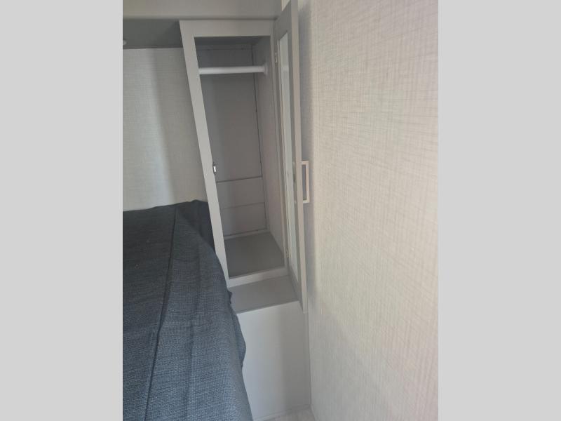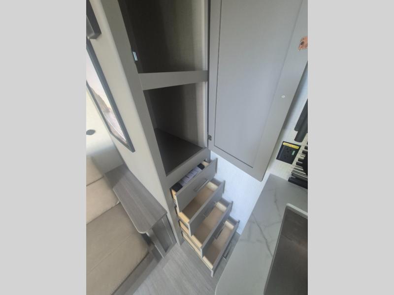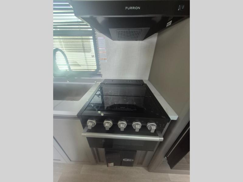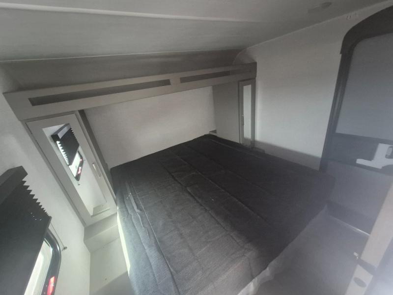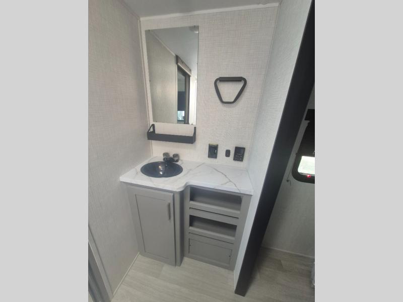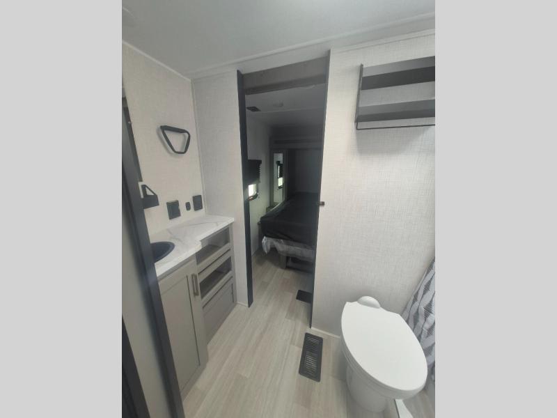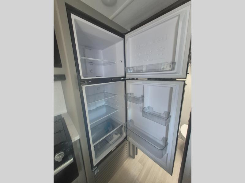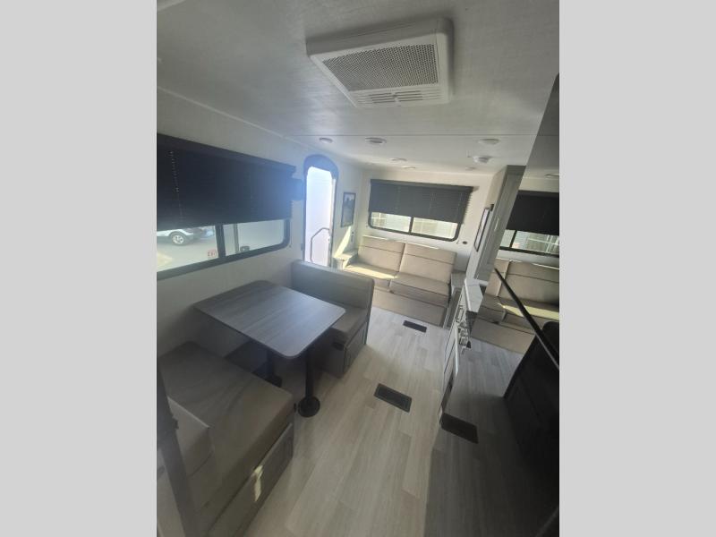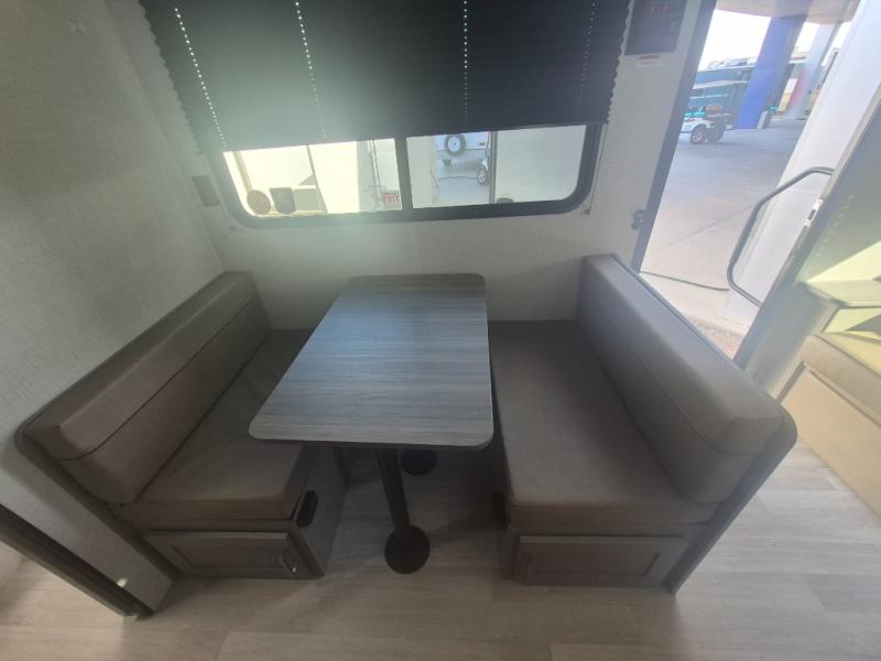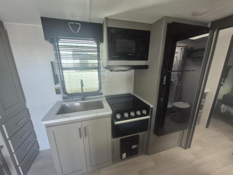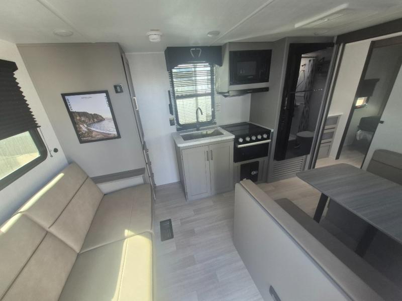 This travel trailer features dual entry doors, allowing you to enter in through the front master bedroom or the rear living room! The rear sofa with end tables provides a place to relax each day, and the booth dinette gives you a place to dine together. And both of these pieces of furniture can double as sleeping space for guests! A three-burner cooktop and air fryer microwave will let you make meals each day, and a 12V refrigerator and pantry will keep food stored away. The walk-thru bath leads to the front master bedroom where you'll find a walk-around RV Olympic RV queen bed, dual wardrobes and an overhead shelf for tons of storage!
