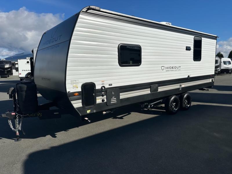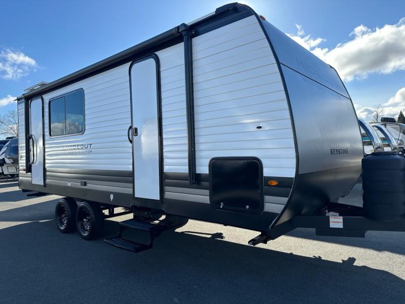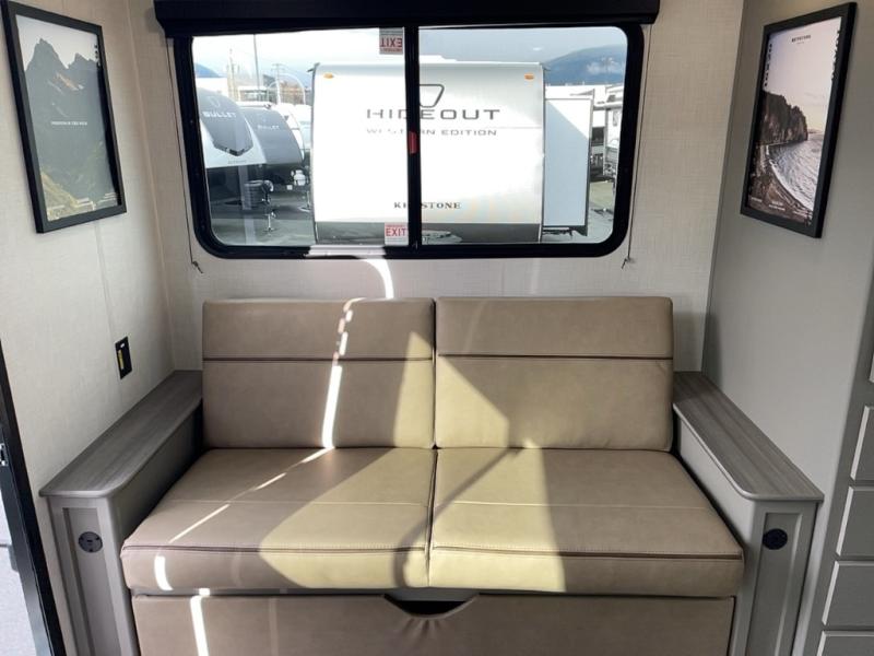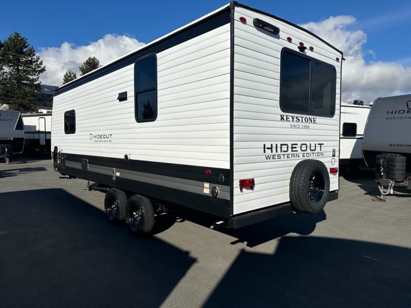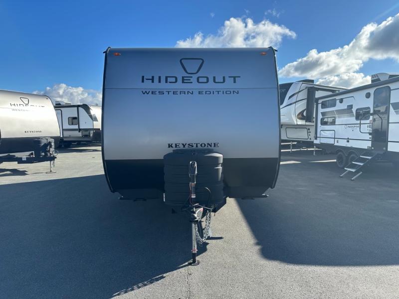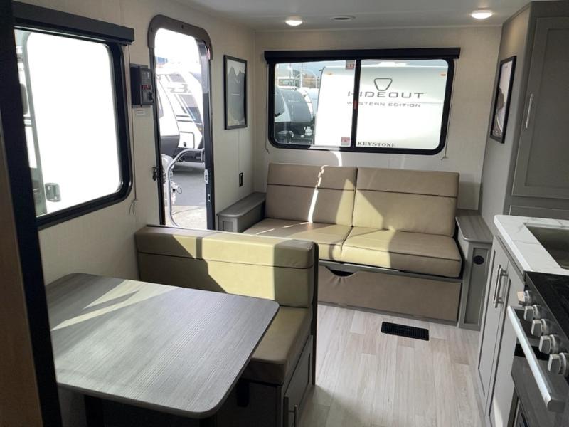 With any Hideout travel trailer by Keystone, you will find functional features and comfort at every turn! Each one is built with tinted safety glass windows and a walkable roof for added durability. There are also Solid Step entry steps outside, along with an outside shower, heavy-duty stabilizer jacks, a spare tire kit and Tire Linc TPMS prep. You'll love the pressed membrane premium countertops inside, plus a decorative tub surround, LED lighting, blackout night shades, and many more comforts. Additional features include a tankless water heater, a porcelain foot flush toilet, a power tongue jack, and an XL entry assist handle to name just a few!