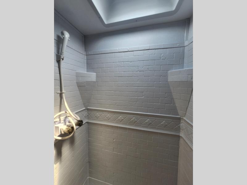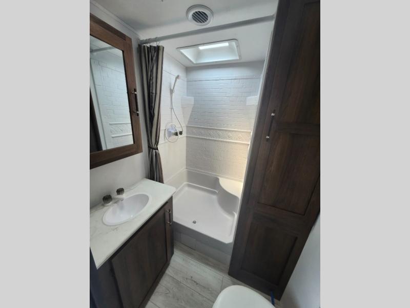 Extended stays are easy in this spacious destination trailer. Since there are two private bedrooms and two full baths, you can camp with family and friends, plus there are triple slides for more space! The front bedroom includes a king bed slide out, a closet, dresser, plus washer and dryer prep if you choose to add those appliances. The master bedroom towards the back features a queen bed slide, dual closets, and a full rear bath, and both bathrooms includes a shower with a seat for more comfort! Everyone can meet in the combined kitchen and living area to relax on the tri-fold sofa, play a game at the flex lounge, or just enjoy the 50" TV and fireplace. And the full kitchen is sure to impress with its three burner gas oven, air fryer microwave, and 16 cu. ft. refrigerator!