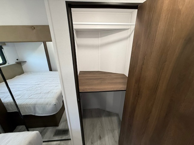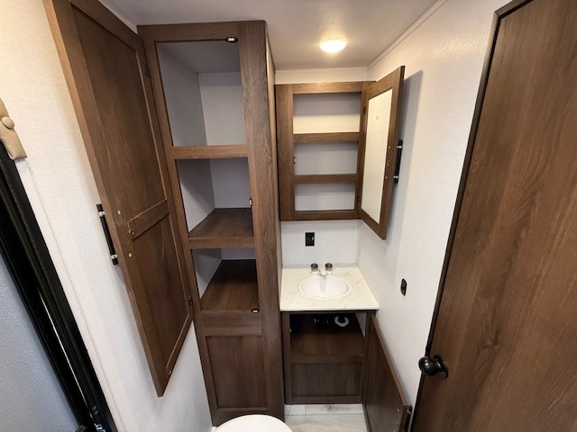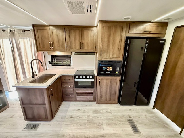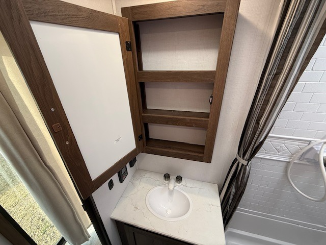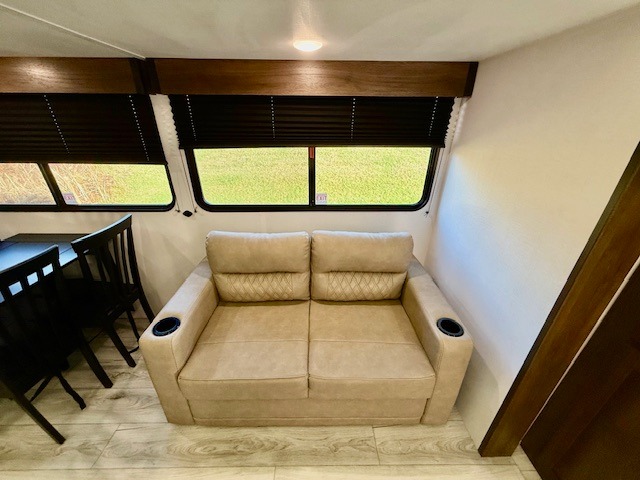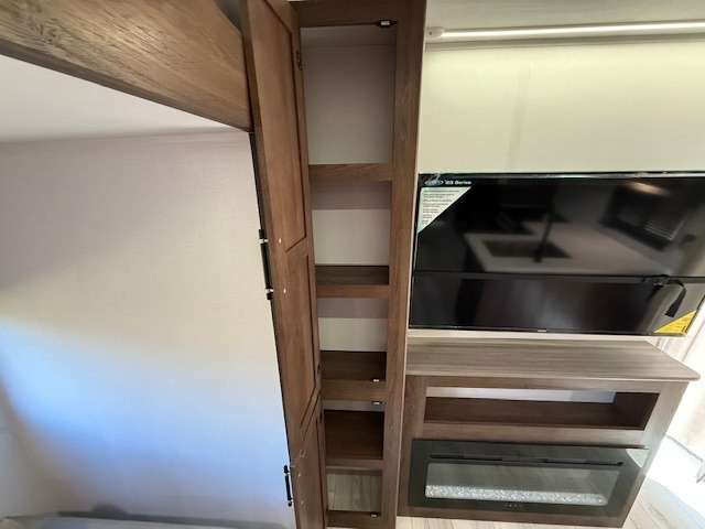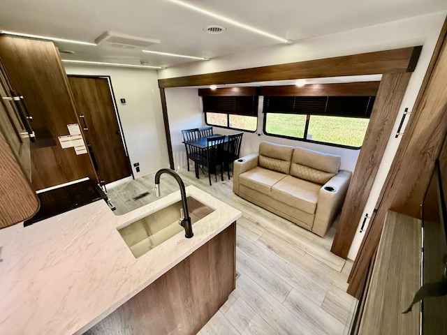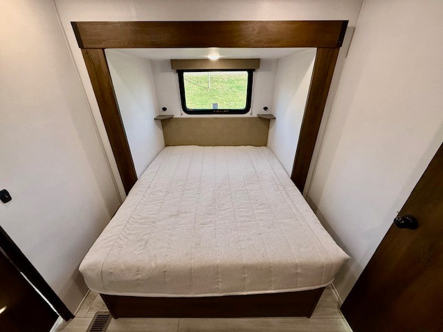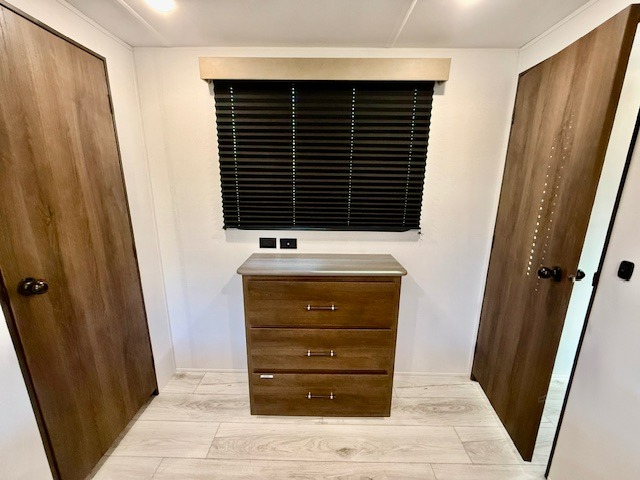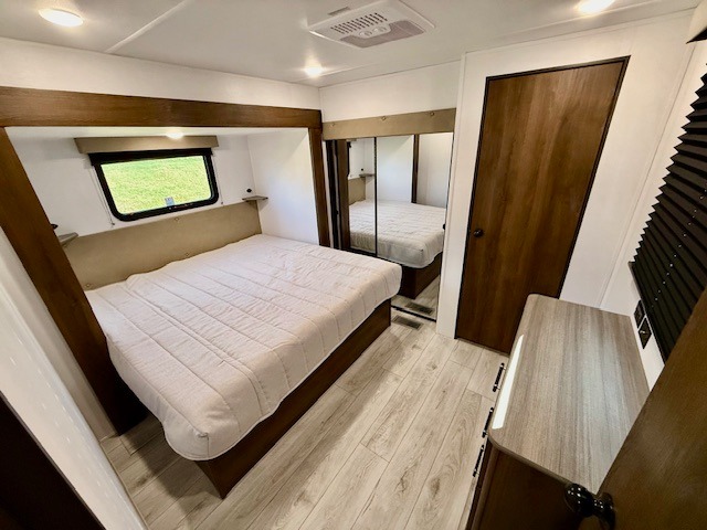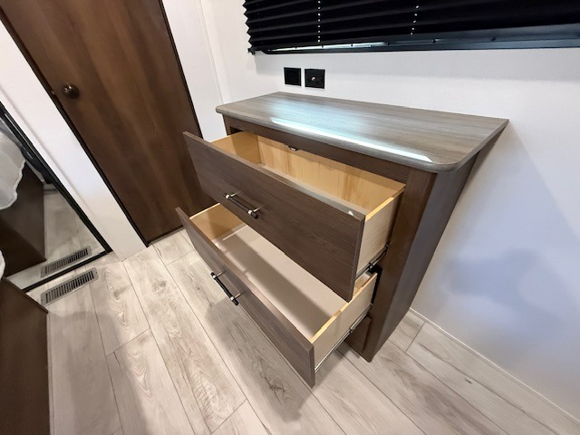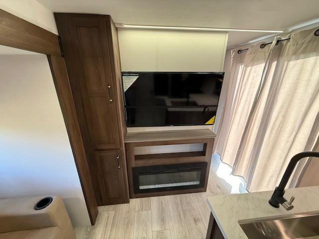 This is the perfect trailer to travel with friends and family since there are two bedrooms! The front bedroom includes a king bed slide out, a closet, dresser, plus washer and dryer prep if you choose to add these appliances. There is also a full bath right next to this room for easy access. Head to the rear master bedroom to find a queen bed slide out, a dresser and a closet, plus a full rear bath with one of the dual entry doors to the unit for added convenience. Everyone can meet in the combined kitchen and living area in the morning while the chef makes breakfast on the three burner gas range. There is a free-standing table and a tri-fold sofa within the large slide out here, and the entertainment center with a fireplace is close by to make it more cozy. After breakfast you can head out on a trail or two, or just relax outdoors under the 20' power awning!