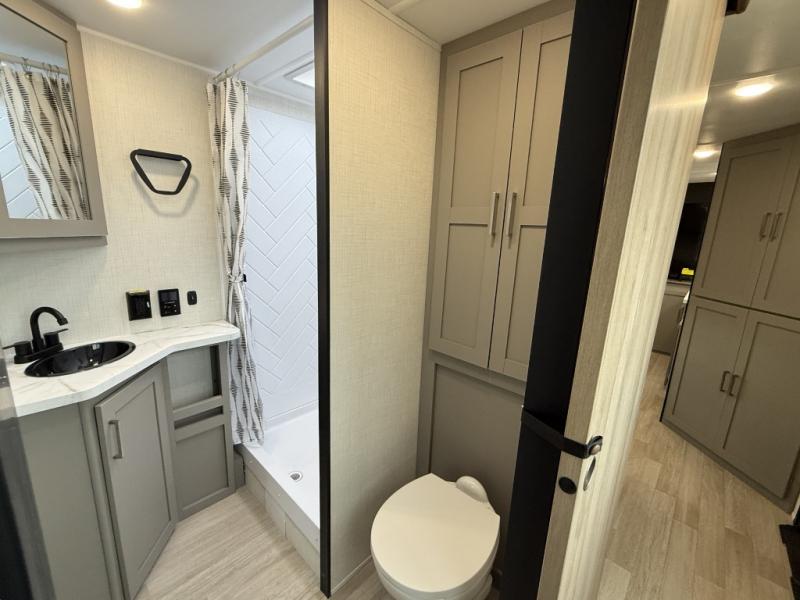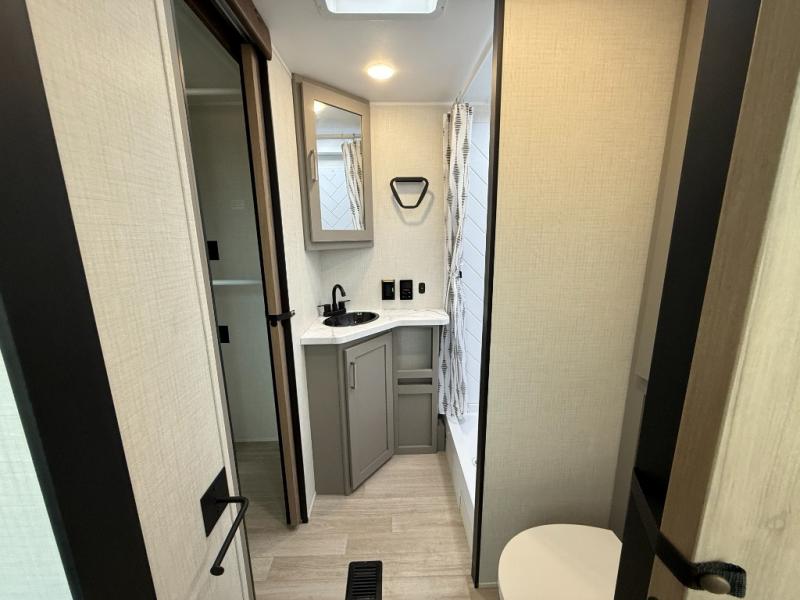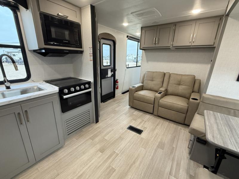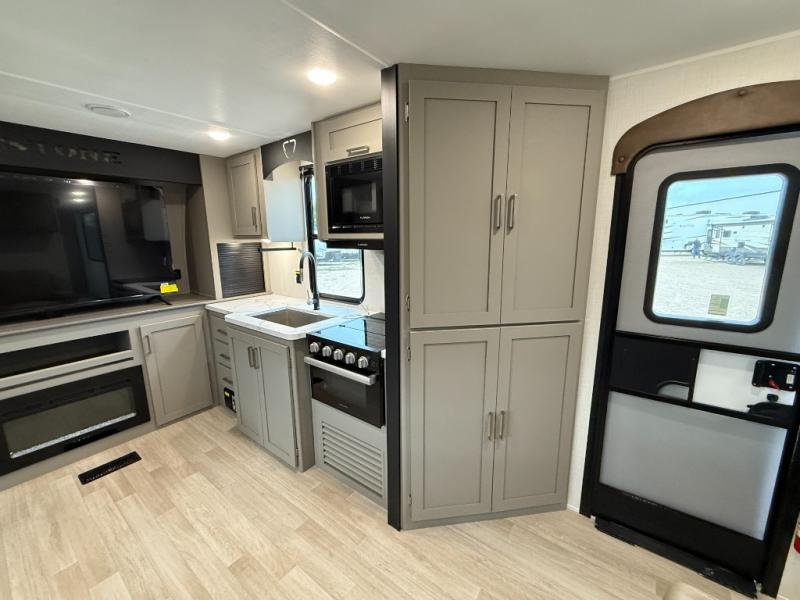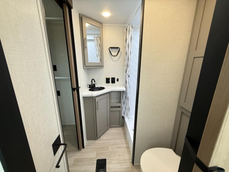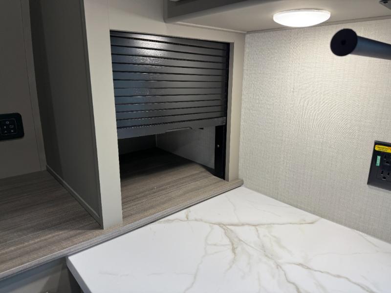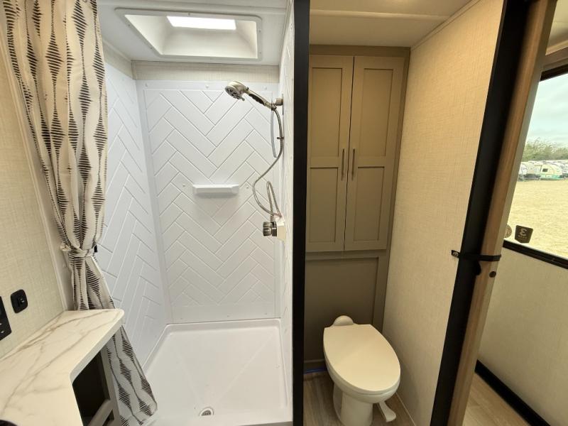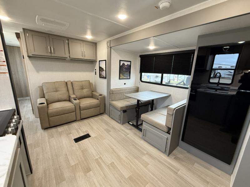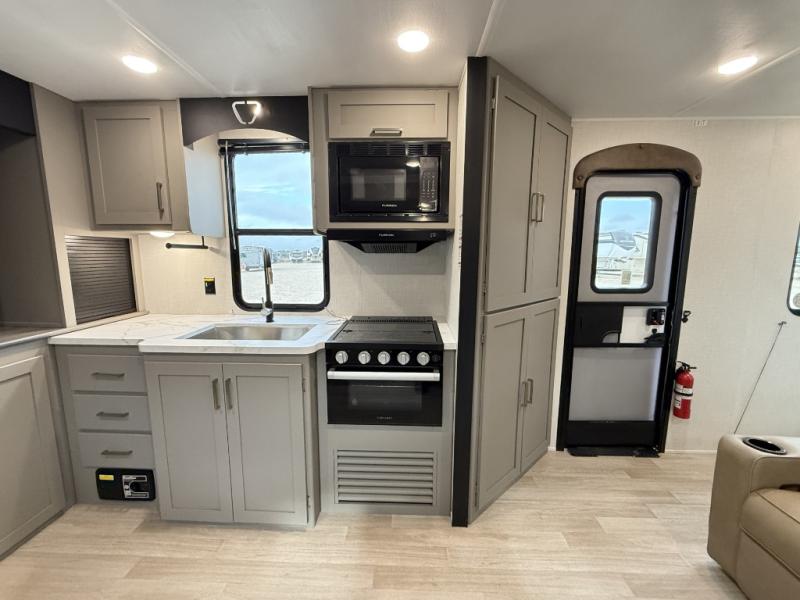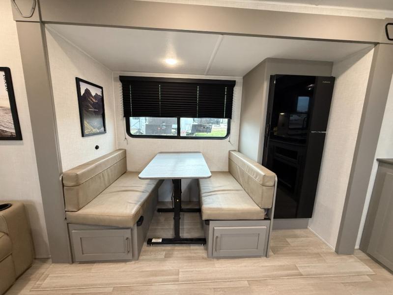 This travel trailer is designed for campers who want extra comfort without giving up easy towing, this travel trailer offers a smart, functional layout for everyday living on the road. Featuring a complete bath with 30" x 36" shower and linen storage. You get inviting seating, a well-equipped kitchen, and plenty of storage so you can settle in and feel at home on every trip. This floorplan stands out with its 50" TV perfectly positioned for movie nights, plus dedicated wardrobe and shoe storage to keep clutter under control. At the end of the day, you can stretch out on the Olympic queen bed, giving you more sleeping space than a standard queen, and the kitchen’s air fryer microwave lets you whip up quick, crispy meals without needing extra appliances.