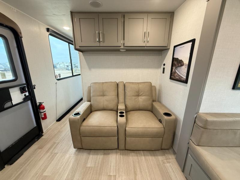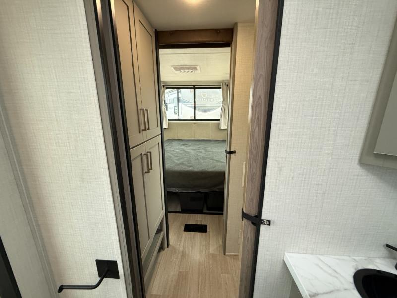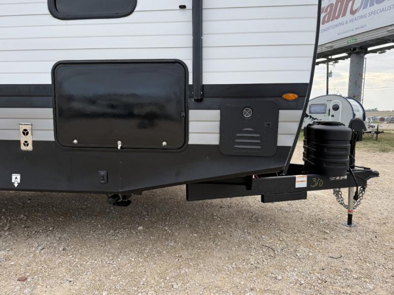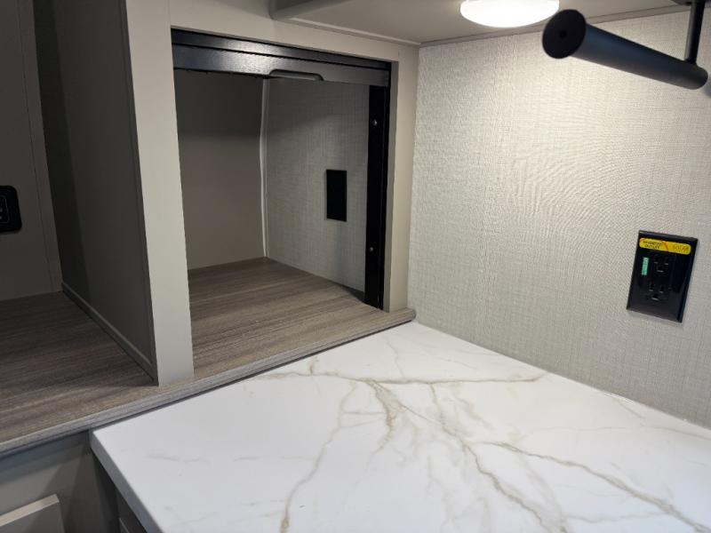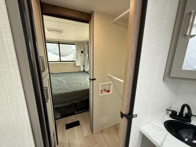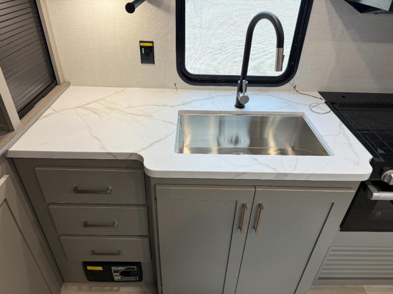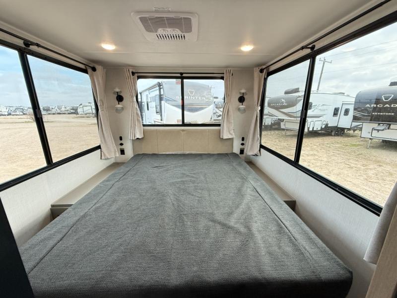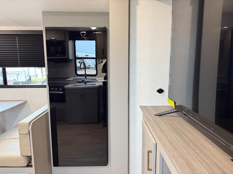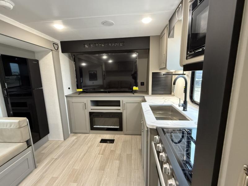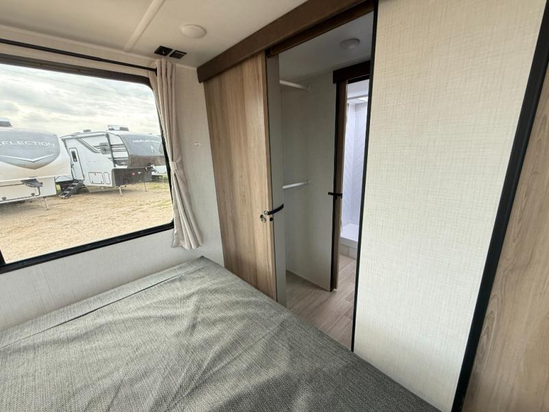 This travel trailer is designed for campers who want extra comfort without giving up easy towing, this travel trailer offers a smart, functional layout for everyday living on the road. Featuring a complete bath with 30" x 36" shower and linen storage. You get inviting seating, a well-equipped kitchen, and plenty of storage so you can settle in and feel at home on every trip. This floorplan stands out with its 50" TV perfectly positioned for movie nights, plus dedicated wardrobe and shoe storage to keep clutter under control. At the end of the day, you can stretch out on the Olympic queen bed, giving you more sleeping space than a standard queen, and the kitchen’s air fryer microwave lets you whip up quick, crispy meals without needing extra appliances.