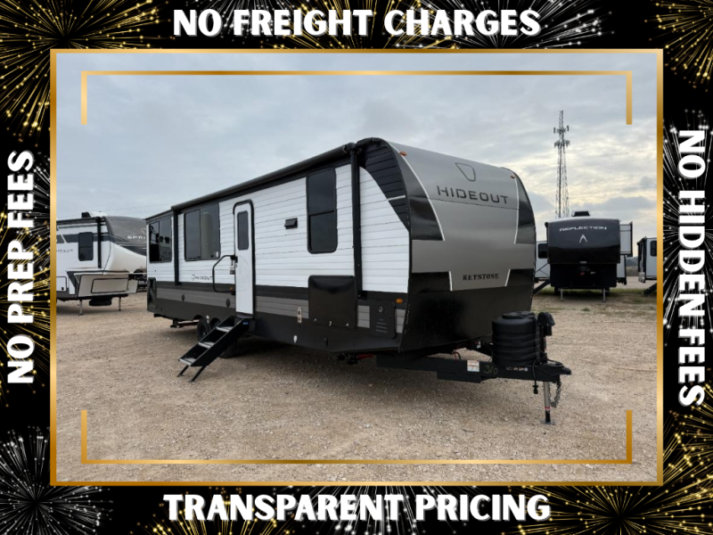 Hideout Max travel trailers by Keystone are built to make the most of every trip, with durable construction, a fully walkable roof with ladder prep, tinted safety glass windows, and solid step entry steps that make getting in and out easy. Standard features like a waterproof drop-frame pass-through for bulky gear, a power awning with LED lights, power stabilizer jacks, and a power tongue jack keep campsite setup simple, while the tankless water heater, SolarFlex™-ready wiring, and 26K dual A/C system on 30-amp service help every Hideout Max feel comfortable and capable, no matter which floorplan you choose.