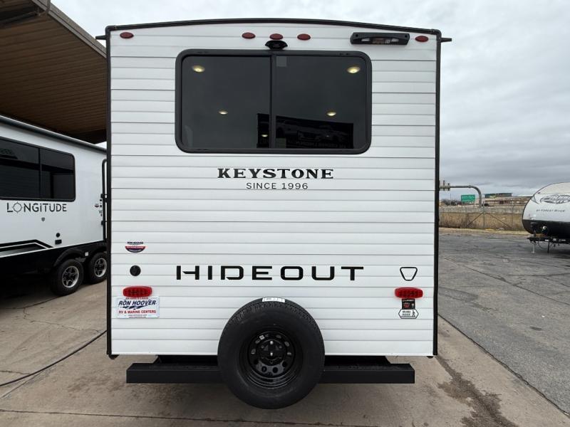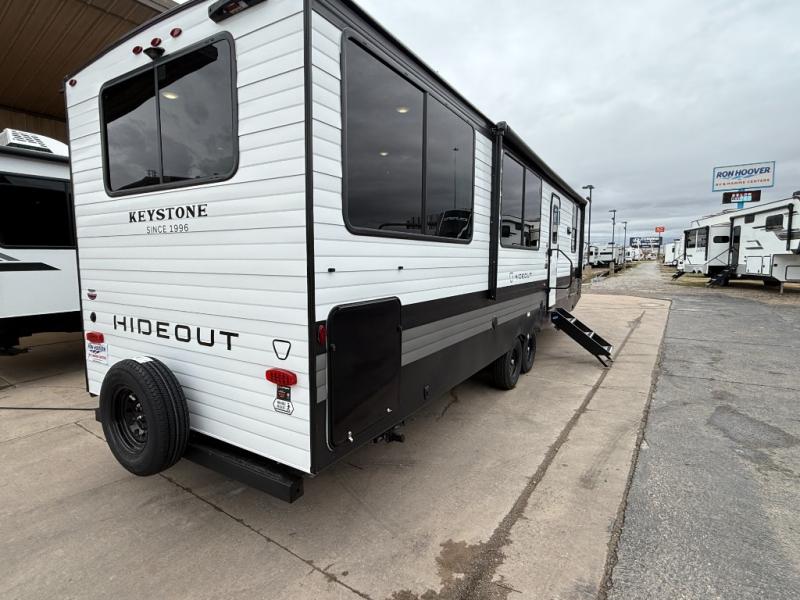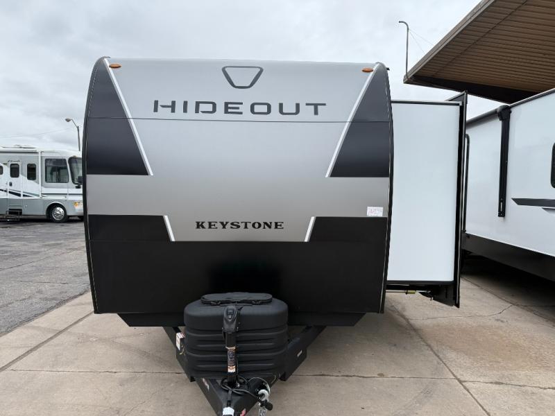 Hideout Max travel trailers by Keystone are built to make the most of every trip, with durable construction, a fully walkable roof with ladder prep, tinted safety glass windows, and solid step entry steps that make getting in and out easy. Standard features like a waterproof drop-frame pass-through for bulky gear, a power awning with LED lights, power stabilizer jacks, and a power tongue jack keep campsite setup simple, while the tankless water heater, SolarFlex™-ready wiring, and 26K dual A/C system on 30-amp service help every Hideout Max feel comfortable and capable, no matter which floorplan you choose.