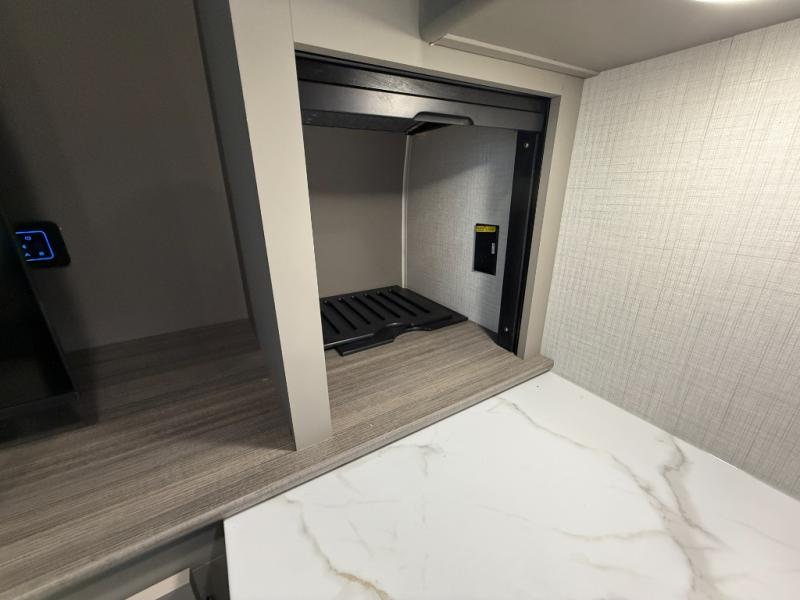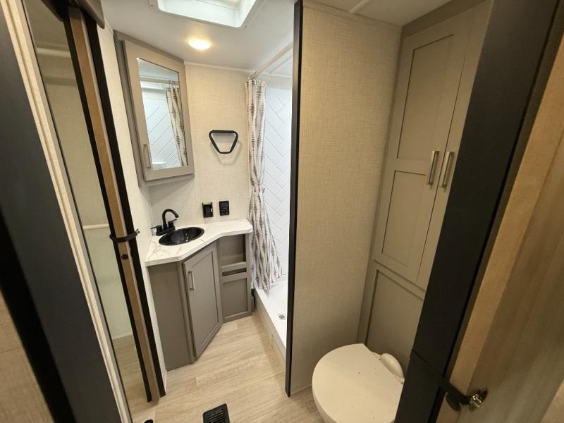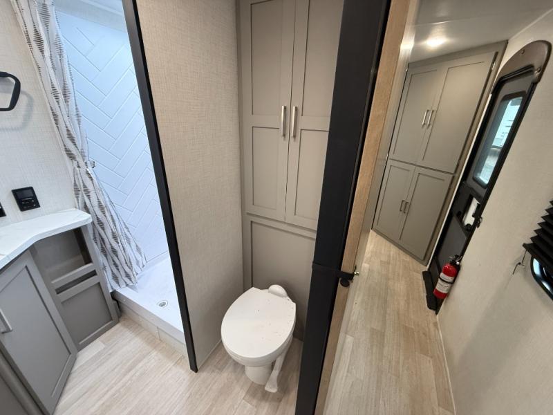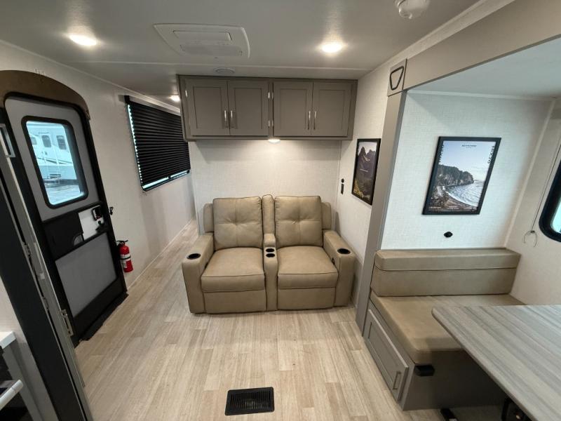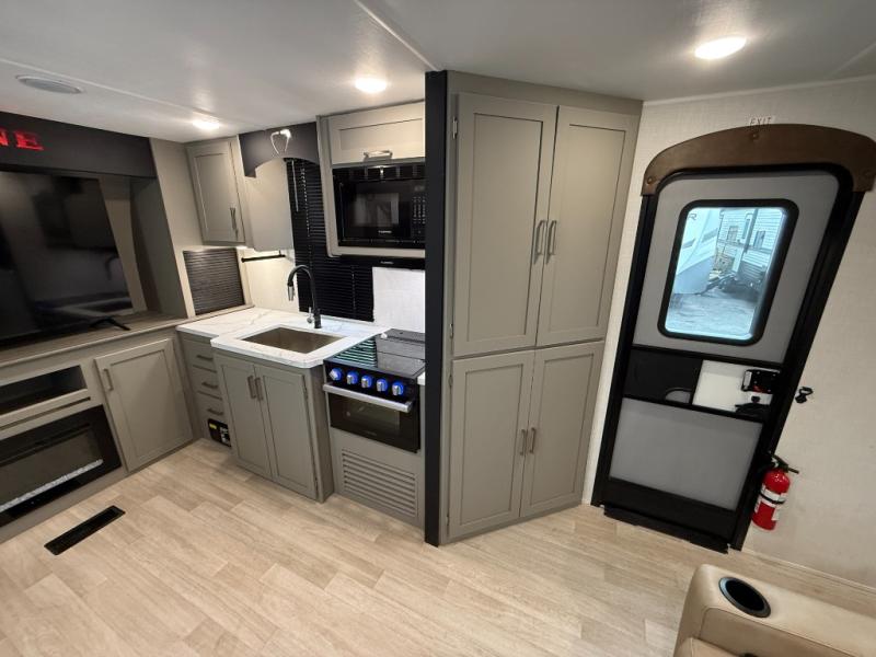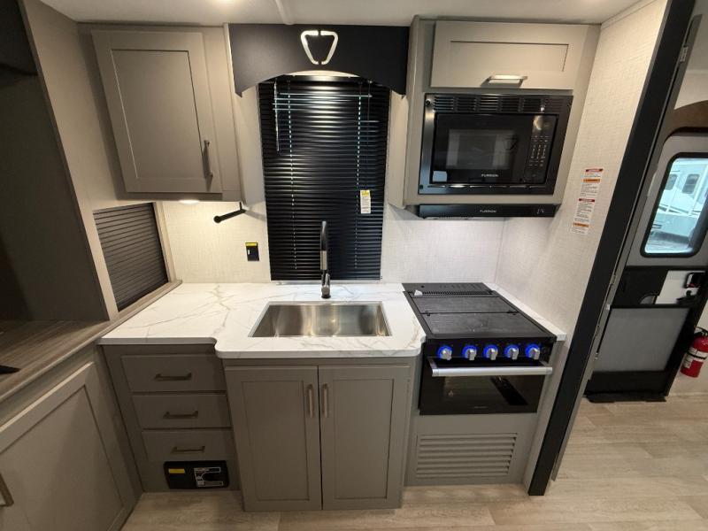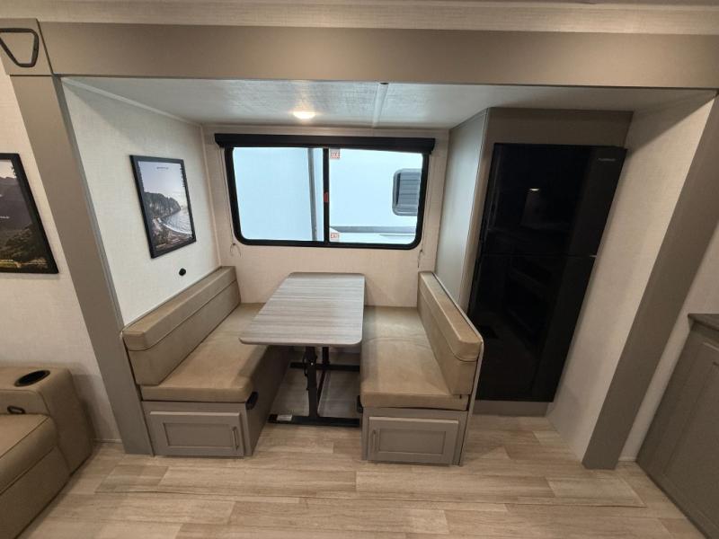 This travel trailer is designed for campers who want extra comfort without giving up easy towing, this travel trailer offers a smart, functional layout for everyday living on the road. Featuring a complete bath with 30" x 36" shower and linen storage. You get inviting seating, a well-equipped kitchen, and plenty of storage so you can settle in and feel at home on every trip. This floorplan stands out with its 50" TV perfectly positioned for movie nights, plus dedicated wardrobe and shoe storage to keep clutter under control. At the end of the day, you can stretch out on the Olympic queen bed, giving you more sleeping space than a standard queen, and the kitchen’s air fryer microwave lets you whip up quick, crispy meals without needing extra appliances.