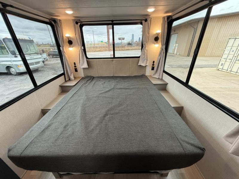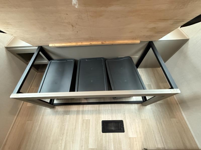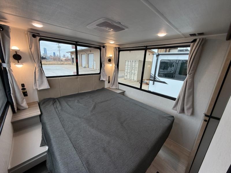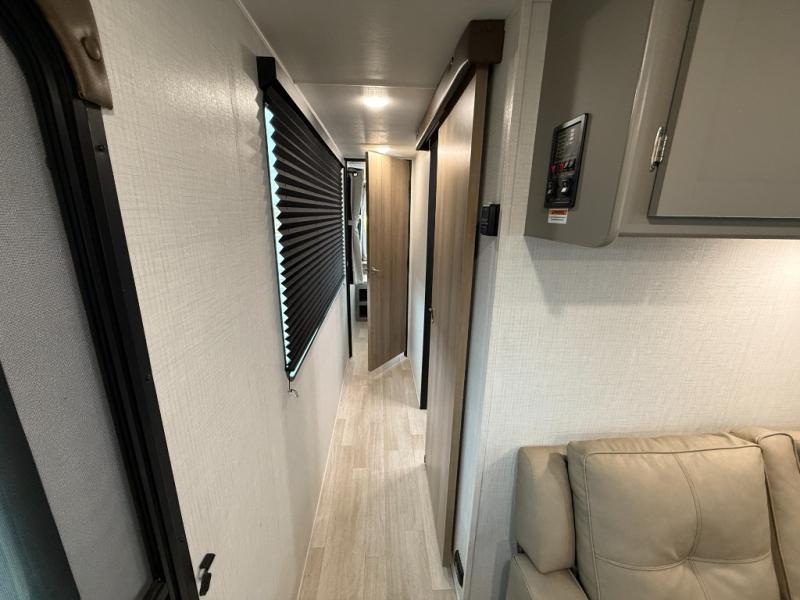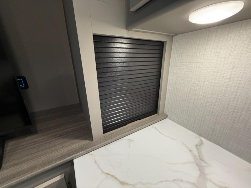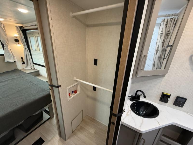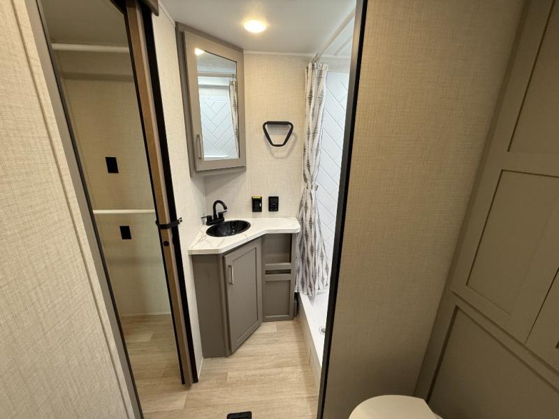This travel trailer is designed for campers who want extra comfort without giving up easy towing, this travel trailer offers a smart, functional layout for everyday living on the road. Featuring a complete bath with 30" x 36" shower and linen storage. You get inviting seating, a well-equipped kitchen, and plenty of storage so you can settle in and feel at home on every trip. This floorplan stands out with its 50" TV perfectly positioned for movie nights, plus dedicated wardrobe and shoe storage to keep clutter under control. At the end of the day, you can stretch out on the Olympic queen bed, giving you more sleeping space than a standard queen, and the kitchen’s air fryer microwave lets you whip up quick, crispy meals without needing extra appliances.