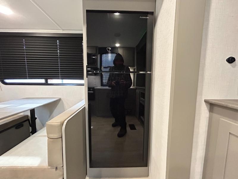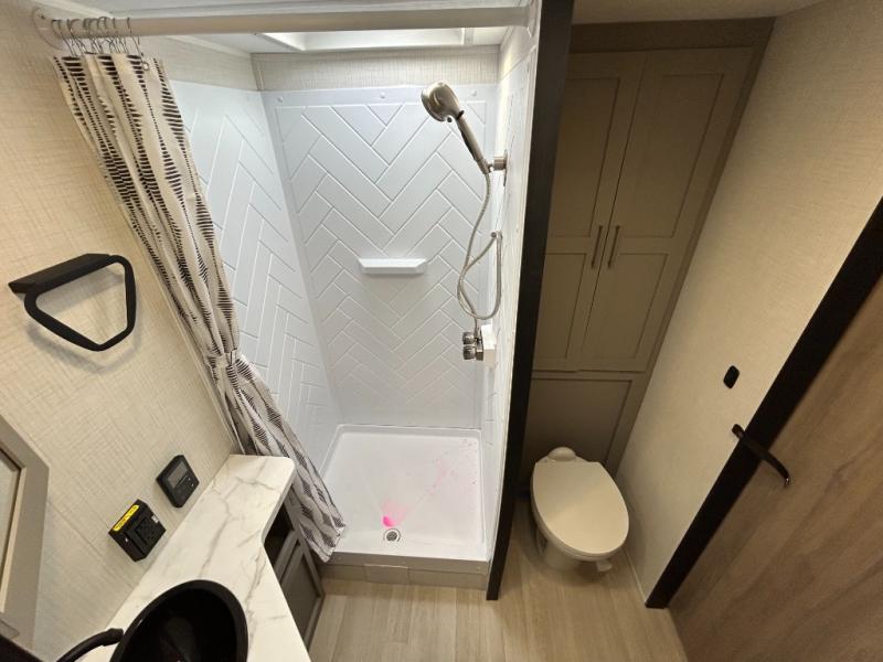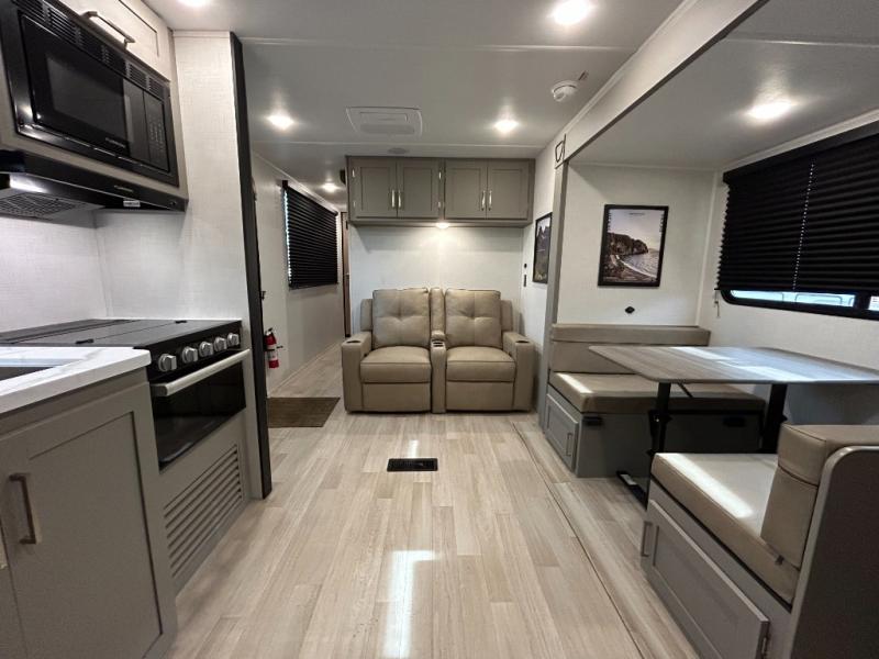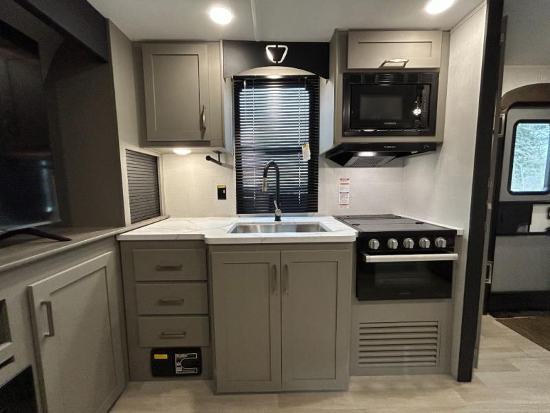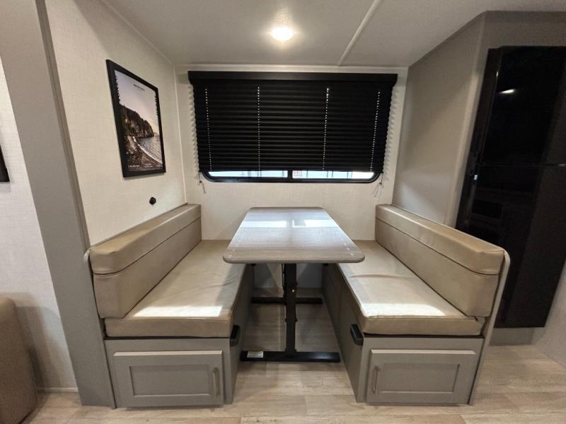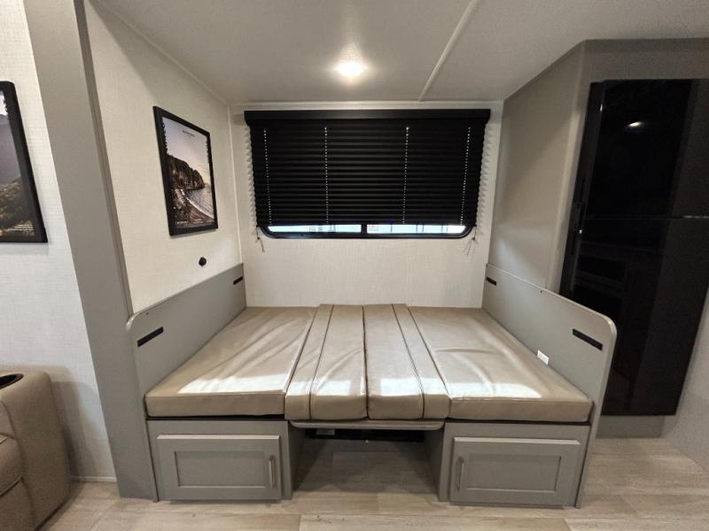 This travel trailer is designed for campers who want extra comfort without giving up easy towing, this travel trailer offers a smart, functional layout for everyday living on the road. Featuring a complete bath with 30" x 36" shower and linen storage. You get inviting seating, a well-equipped kitchen, and plenty of storage so you can settle in and feel at home on every trip. This floorplan stands out with its 50" TV perfectly positioned for movie nights, plus dedicated wardrobe and shoe storage to keep clutter under control. At the end of the day, you can stretch out on the Olympic queen bed, giving you more sleeping space than a standard queen, and the kitchen’s air fryer microwave lets you whip up quick, crispy meals without needing extra appliances.