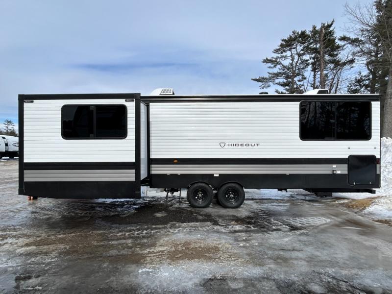 Hideout Max travel trailers by Keystone are built to make the most of every trip, with durable construction, a fully walkable roof with ladder prep, tinted safety glass windows, and solid step entry steps that make getting in and out easy. Standard features like a waterproof drop-frame pass-through for bulky gear, a power awning with LED lights, power stabilizer jacks, and a power tongue jack keep campsite setup simple, while the tankless water heater, SolarFlex™-ready wiring, and 26K dual A/C system on 30-amp service help every Hideout Max feel comfortable and capable, no matter which floorplan you choose.