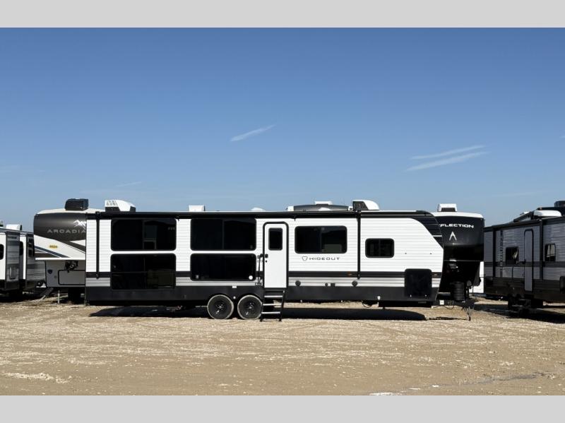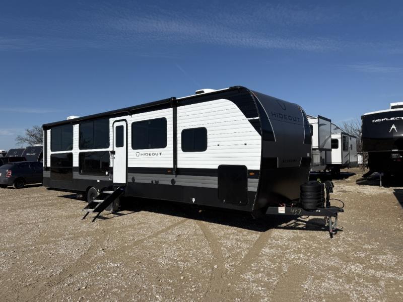Hideout Max travel trailers by Keystone are built to make the most of every trip, with durable construction, a fully walkable roof with ladder prep, tinted safety glass windows, and solid step entry steps that make getting in and out easy. Standard features like a waterproof drop-frame pass-through for bulky gear, a power awning with LED lights, power stabilizer jacks, and a power tongue jack keep campsite setup simple, while the tankless water heater, SolarFlex™-ready wiring, and 26K dual A/C system on 30-amp service help every Hideout Max feel comfortable and capable, no matter which floorplan you choose.