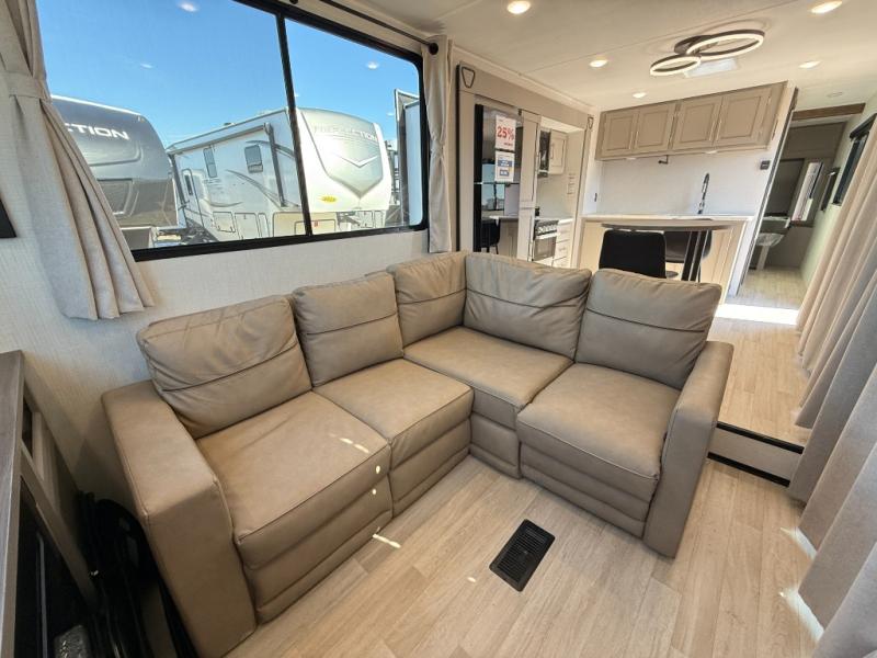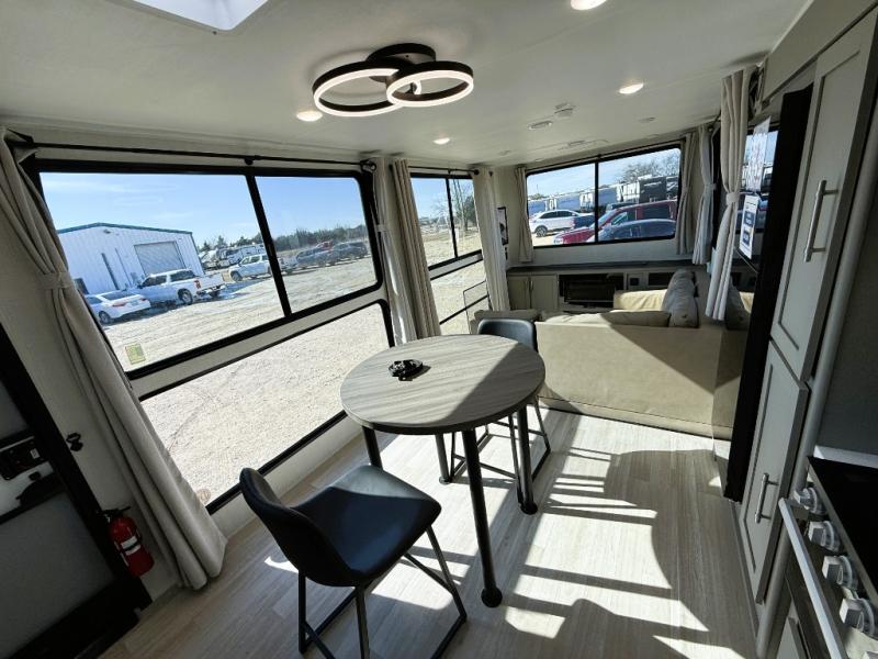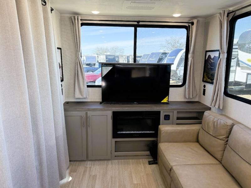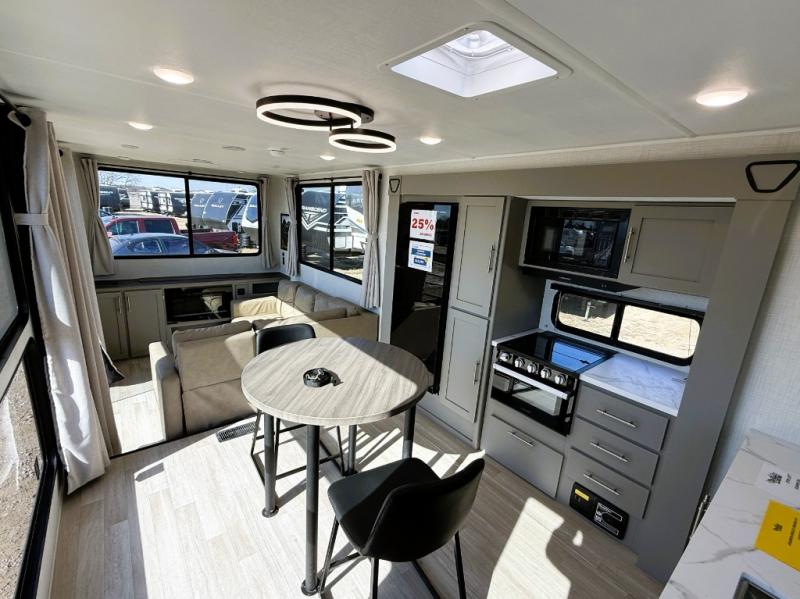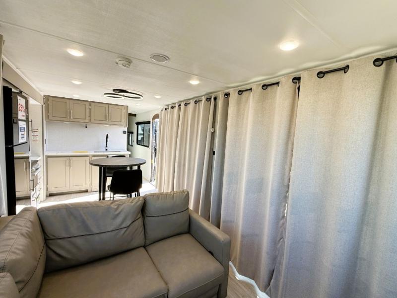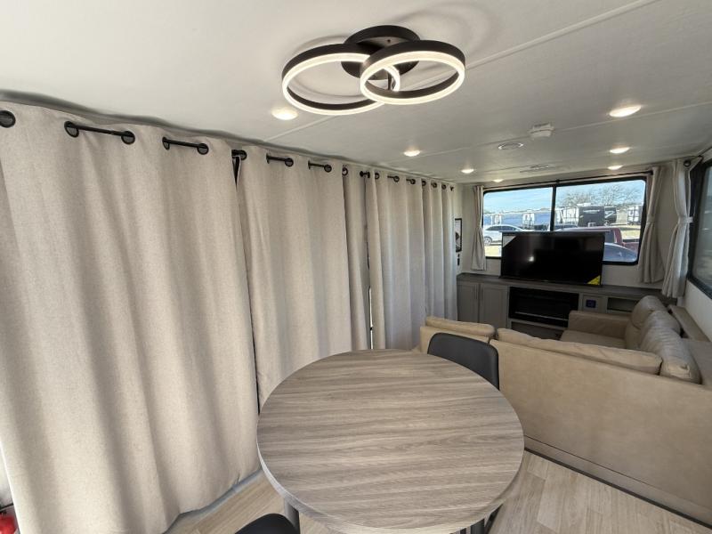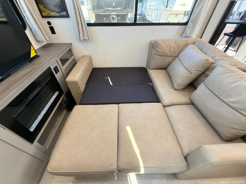 This travel trailer is designed for campers who want residential-style comfort without giving up easy towing, offering a smart, functional layout for everyday living on the road. A sunken living room creates a cozy, separate lounge space, complete with a fireplace and a large sectional sofa that’s perfect for stretching out or hosting friends. In the kitchen area, a bistro table gives you a stylish spot for coffee, meals, or laptops without eating up floor space. At the end of the day, you can retreat to the front bedroom where an Olympic queen bed and dual wardrobes provide extra sleeping room and plenty of storage so you can stay organized and feel at home on every trip.